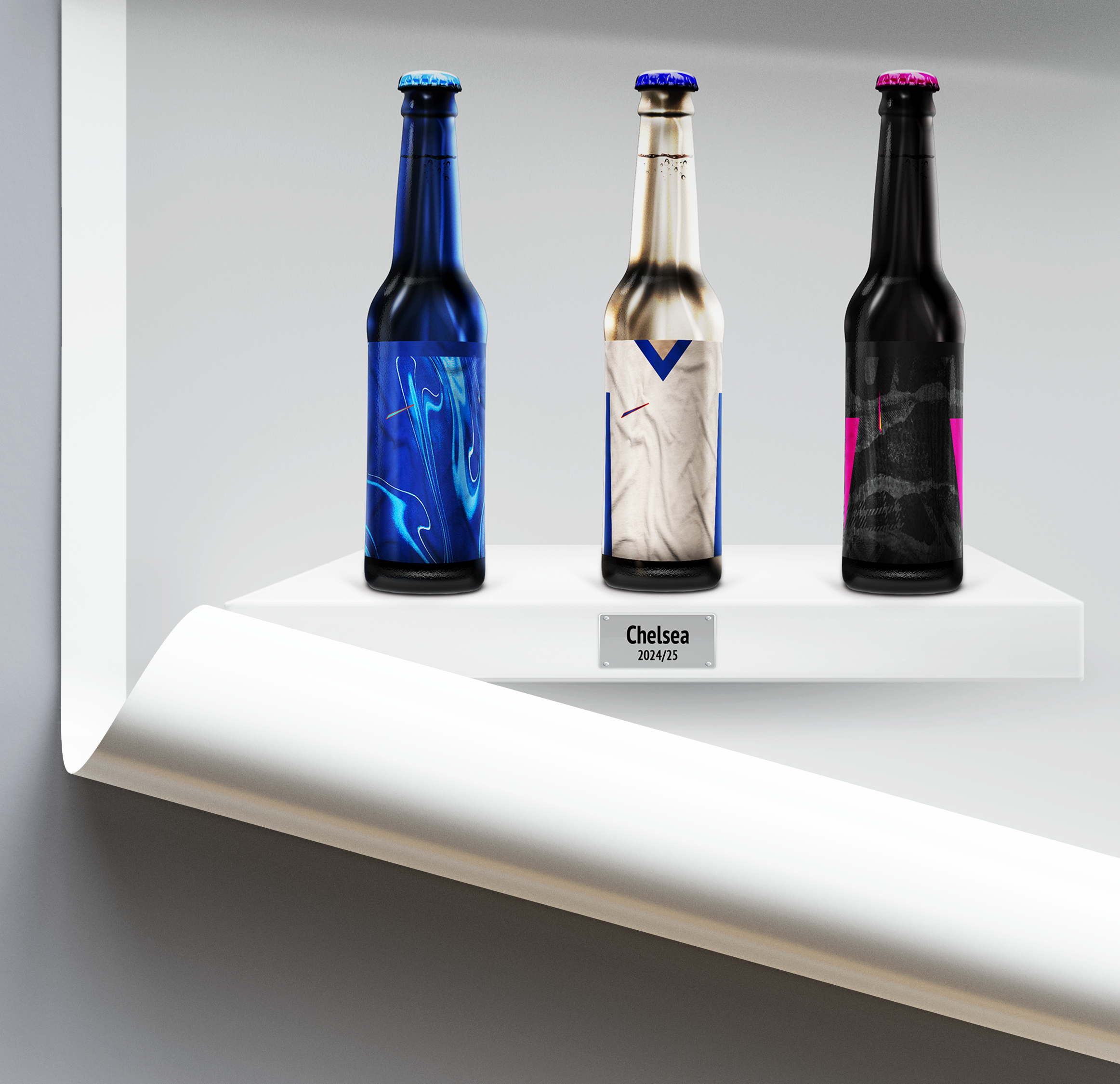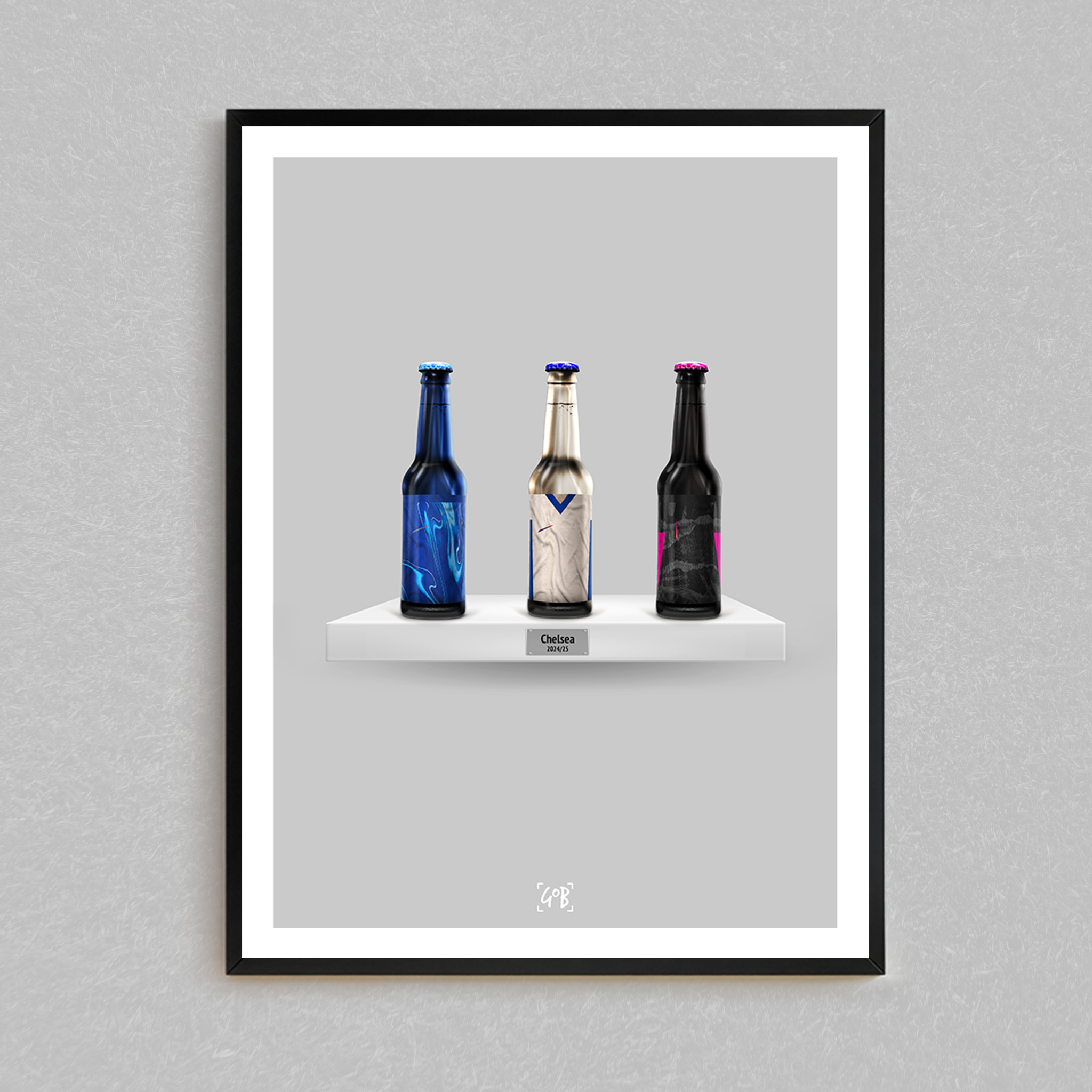 Raise a bottle to the new season. This original art print reimagines the 2024/25 home, away, and third kits as a lineup of collectible beer bottles — a creative fusion of football, design, and post-match tradition.