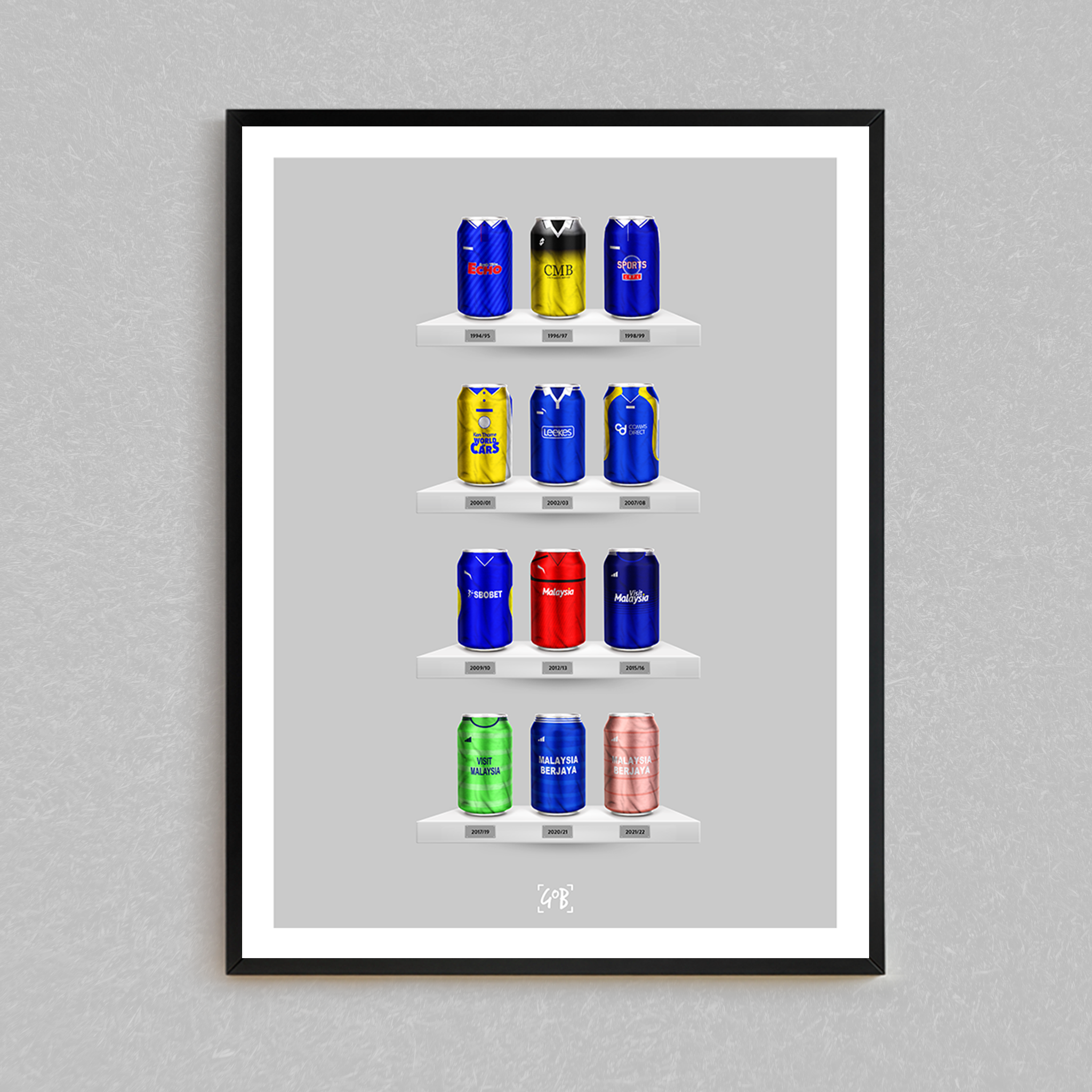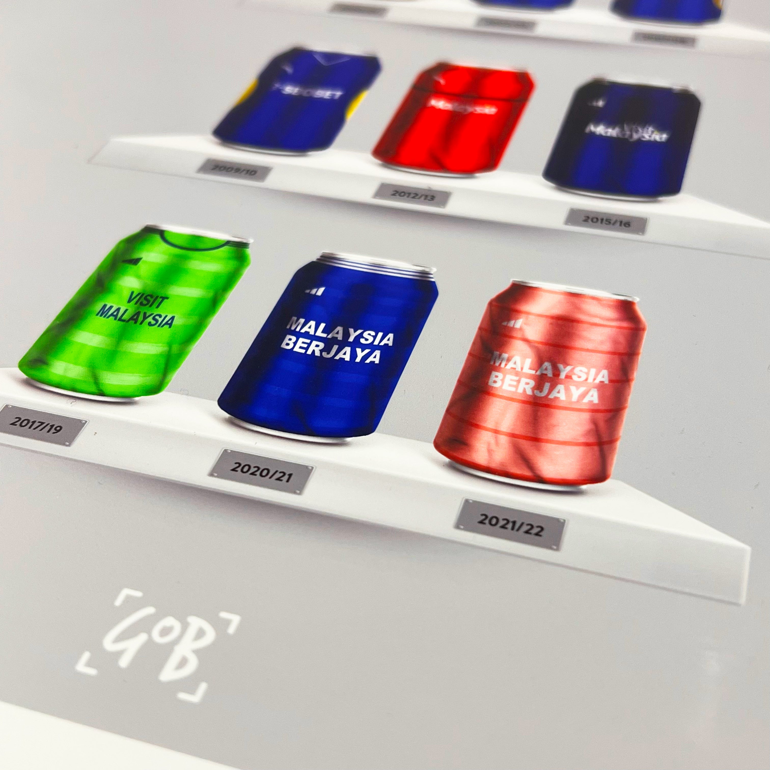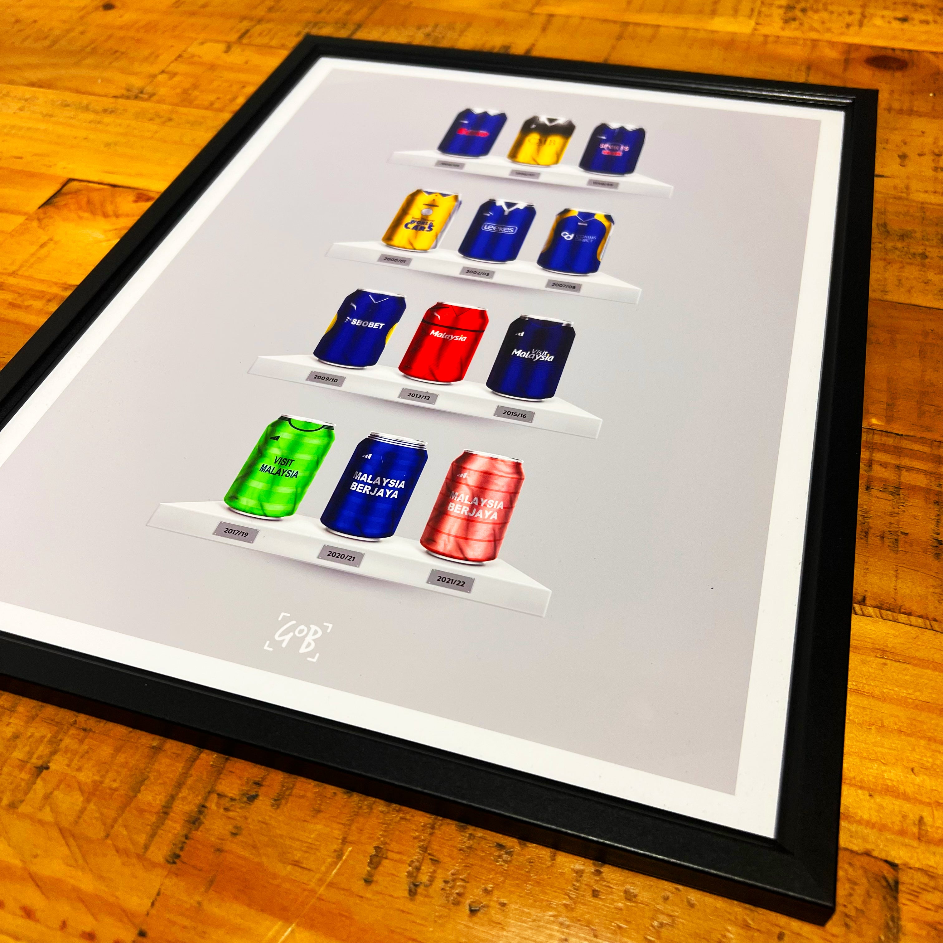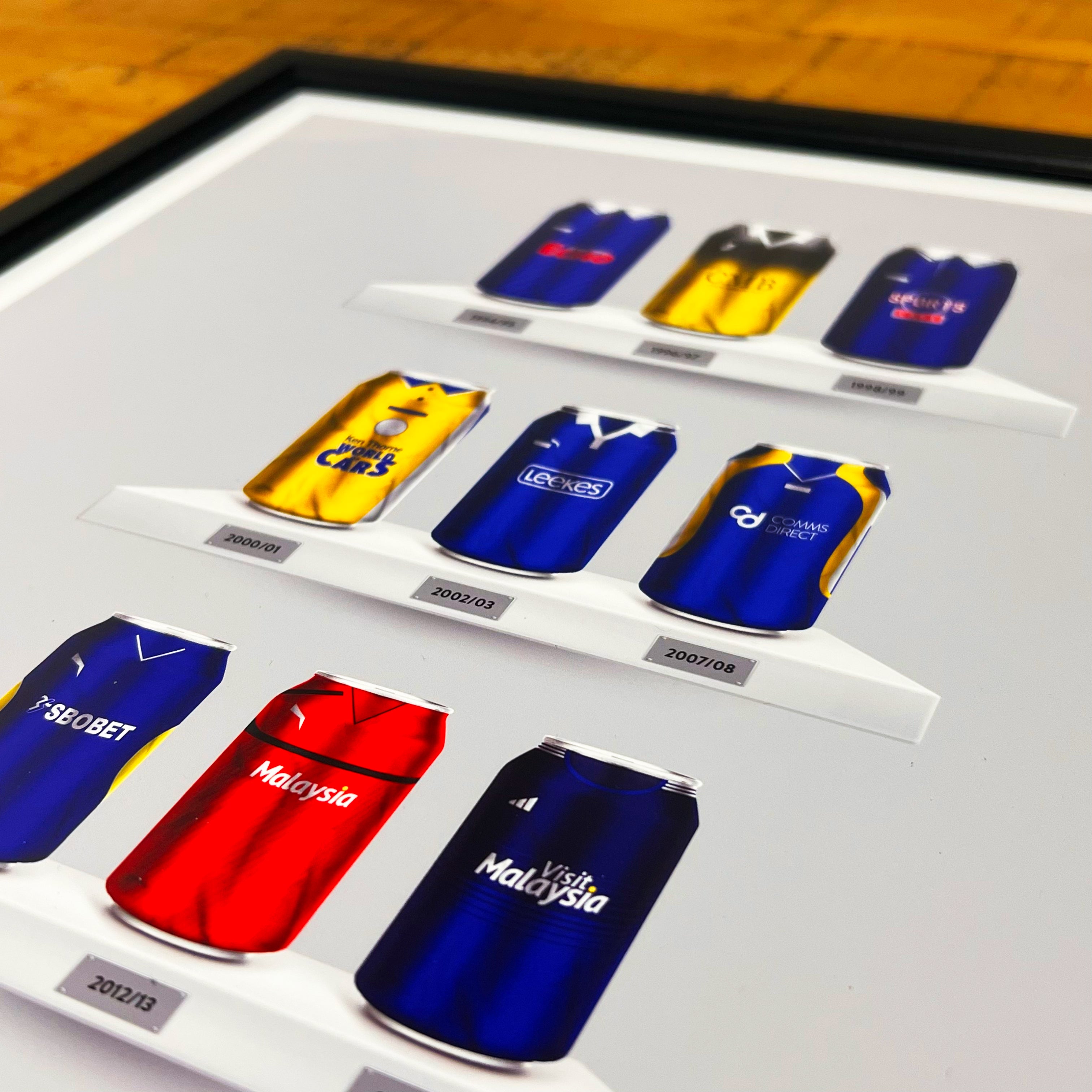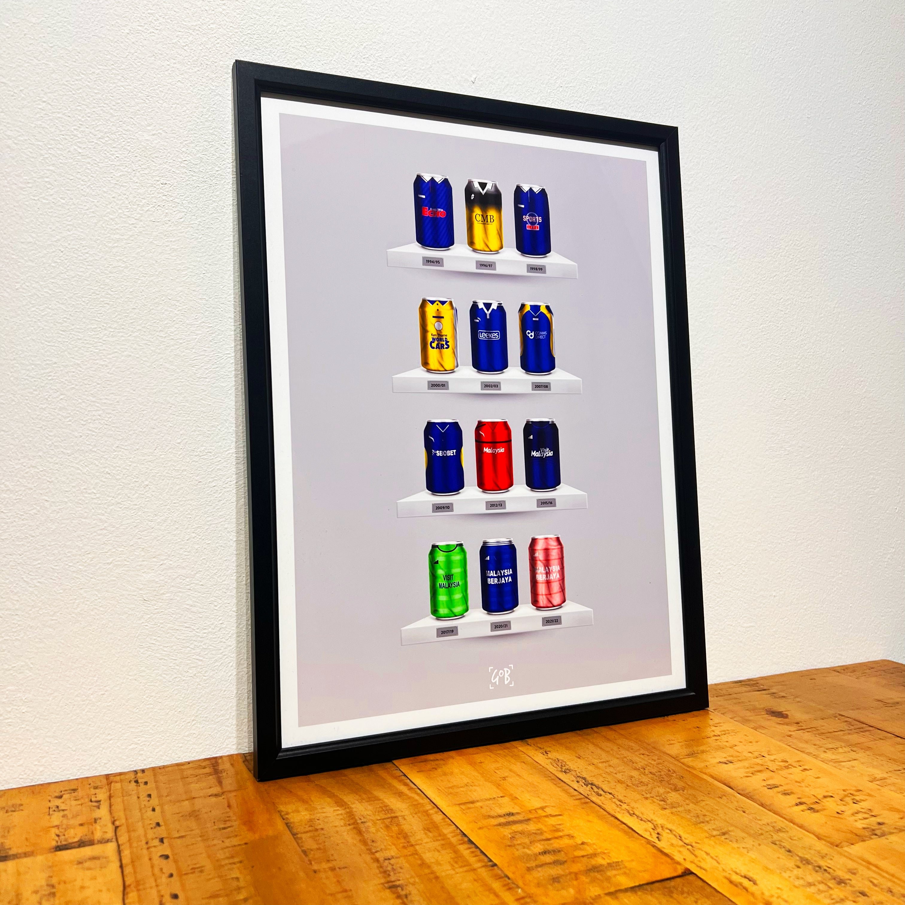 Celebrate legendary football kits from the past few decades, each one digitally illustrated in your choice of our unique can or bottle styles. Printed in high-definition on premium gloss paper, these designs are made to stand out, whether framed or displayed as they are. Also available as a matching T-shirt