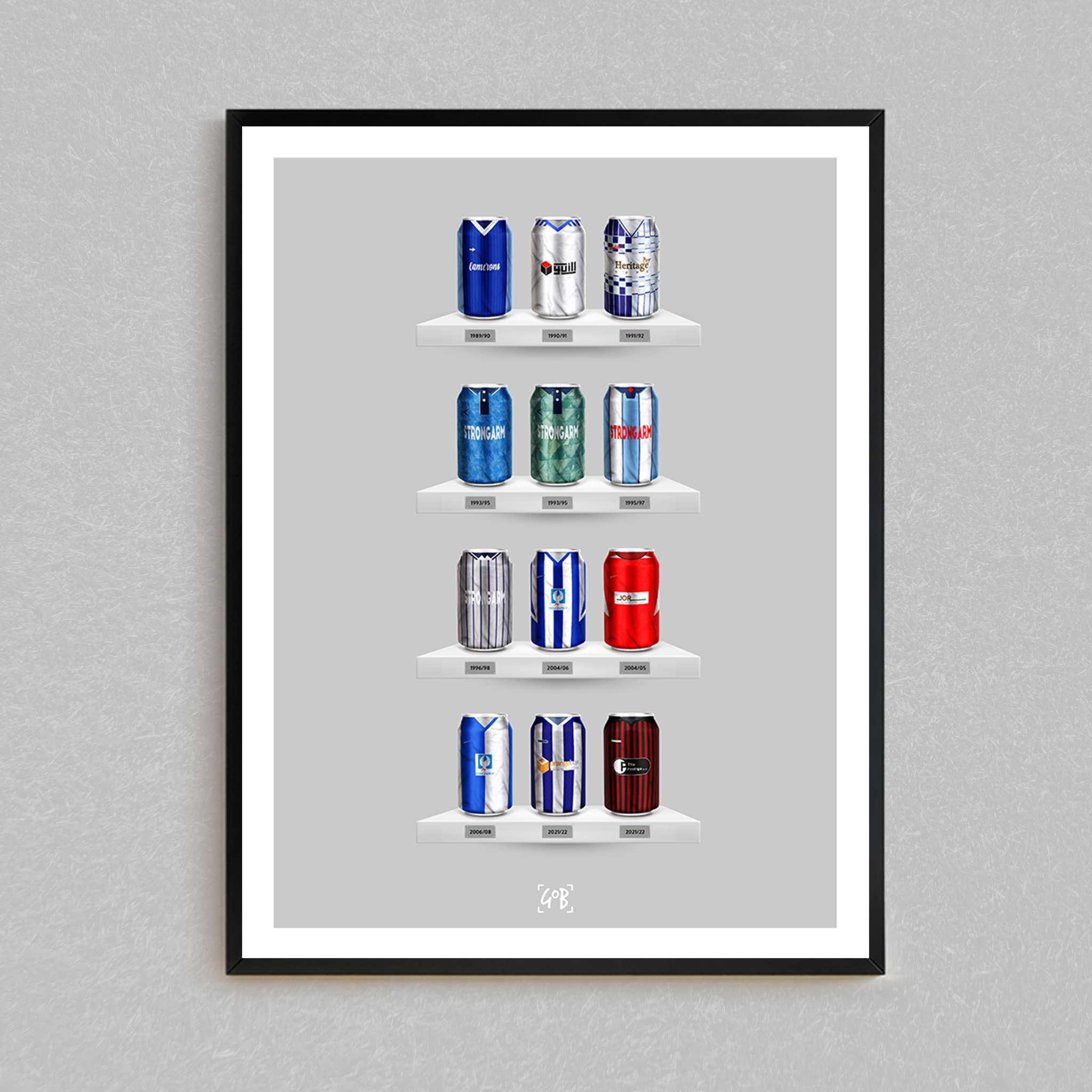 Celebrate legendary football kits from the past few decades, each one digitally illustrated in your choice of our unique can or bottle styles. Printed in high-definition on premium gloss paper, these designs are made to stand out, whether framed or displayed as they are. Also available as a matching T-shirt