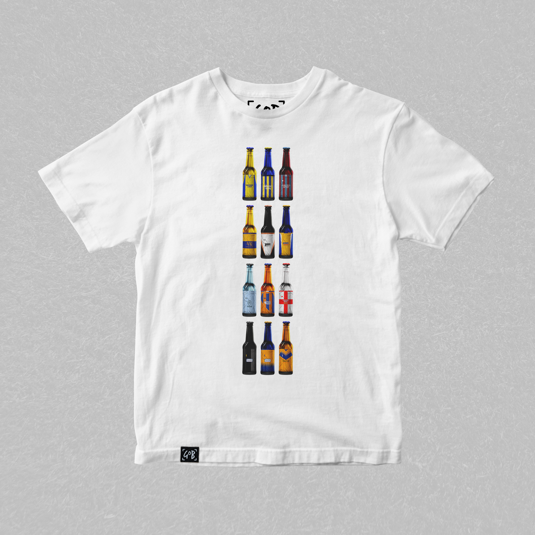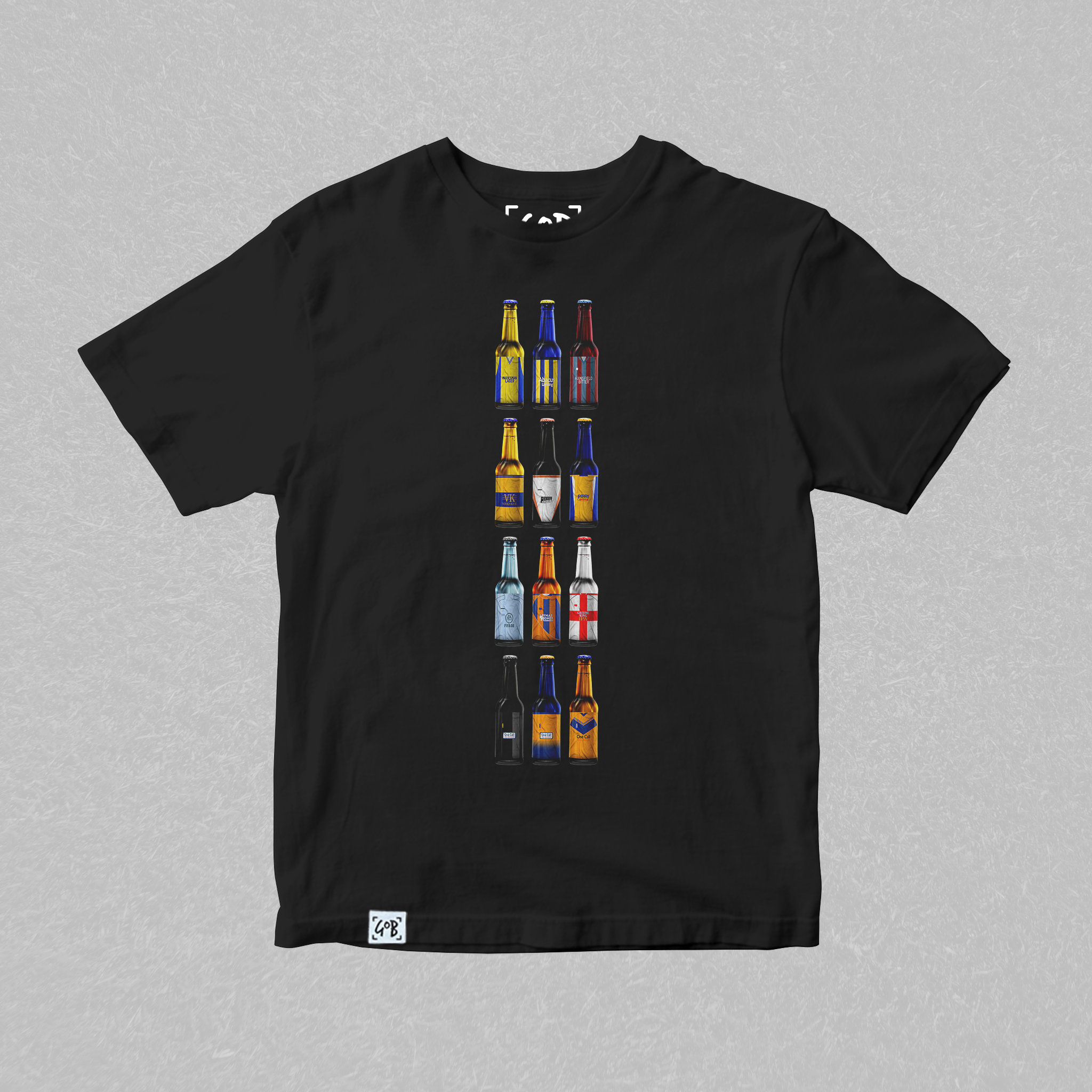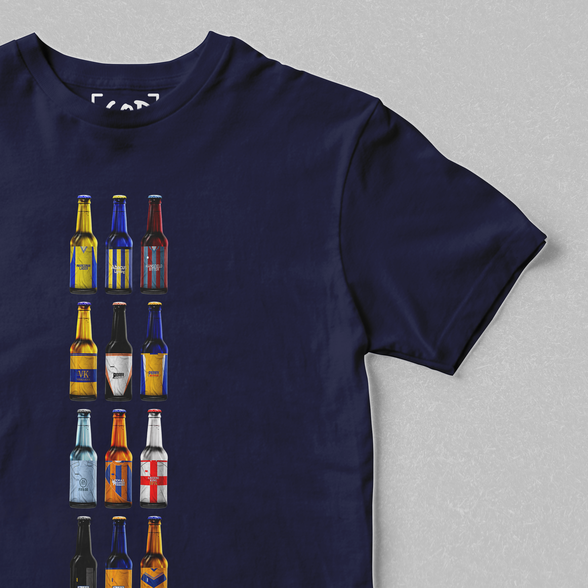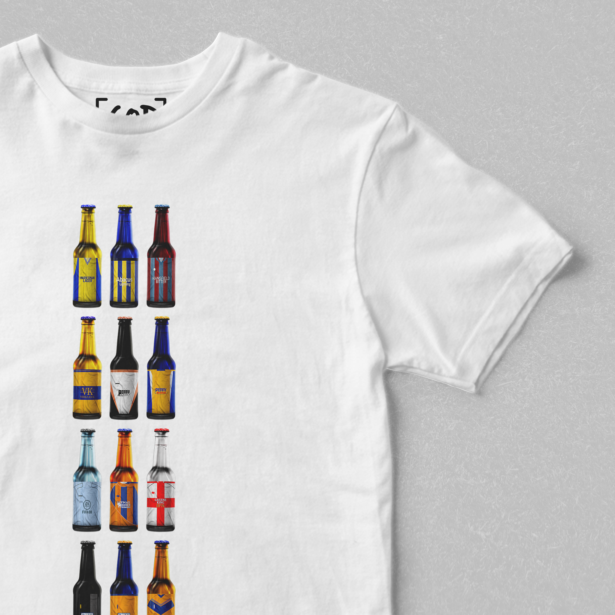 Twelve iconic kits from your club’s past, reimagined as collectible beer bottles in a bold, fan-made design. Each bottle tells a story — of unforgettable goals, cult heroes, and matchdays etched into football history. Crafted for supporters who carry the legacy, this tee is a wearable celebration of heritage, pride, and pints.