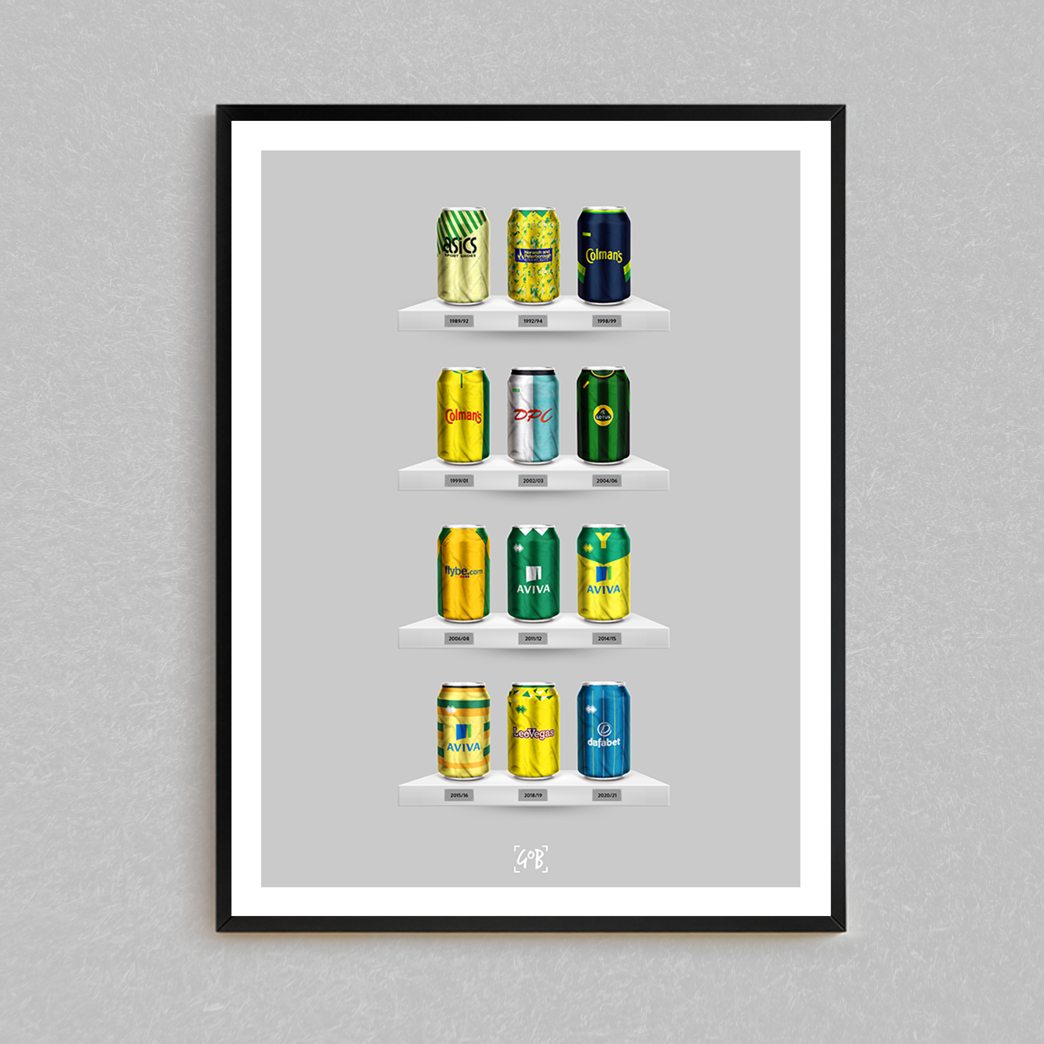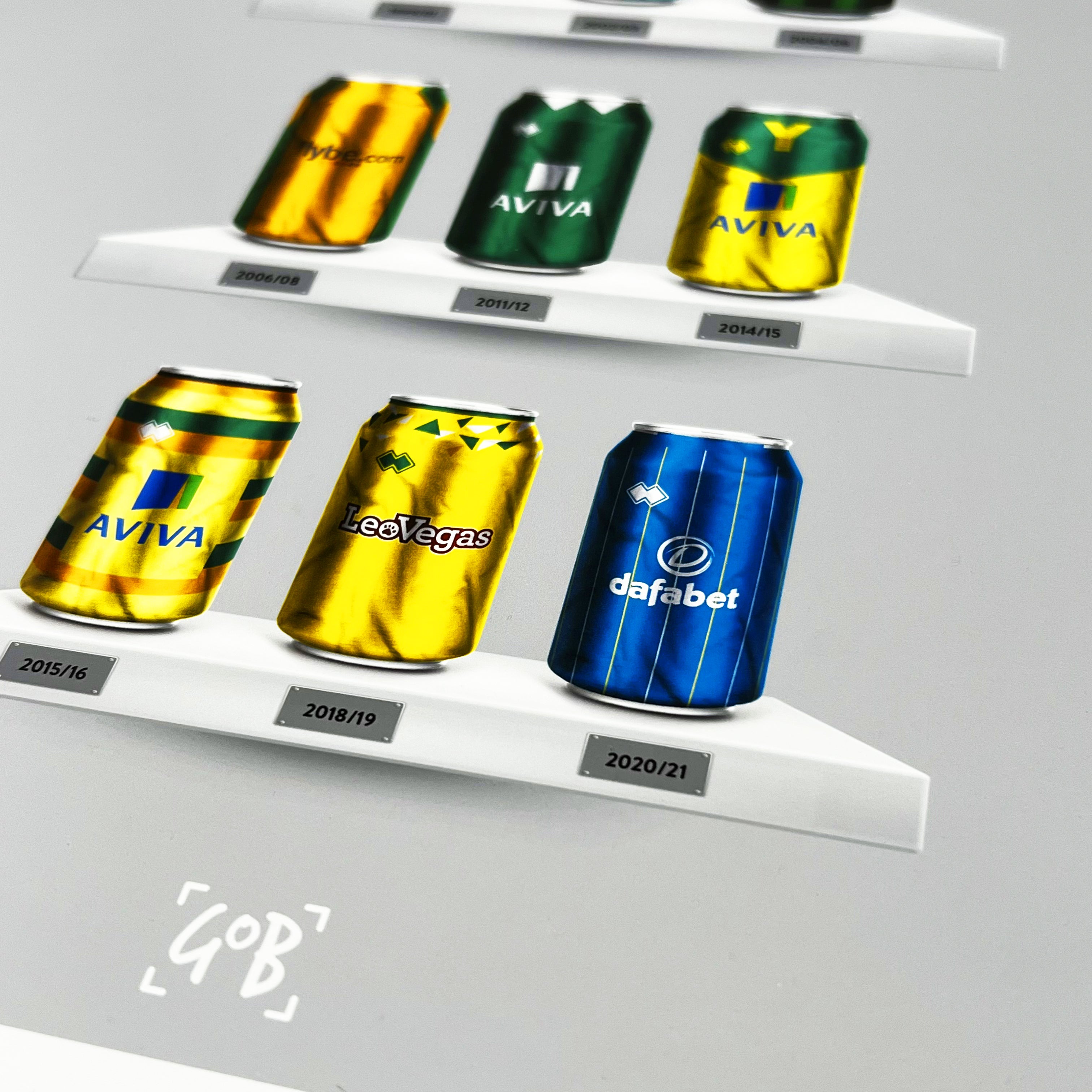 Celebrate legendary football kits from the past few decades, each one digitally illustrated in your choice of our unique can or bottle styles. Printed in high-definition on premium gloss paper, these designs are made to stand out, whether framed or displayed as they are. Also available as a matching T-shirt