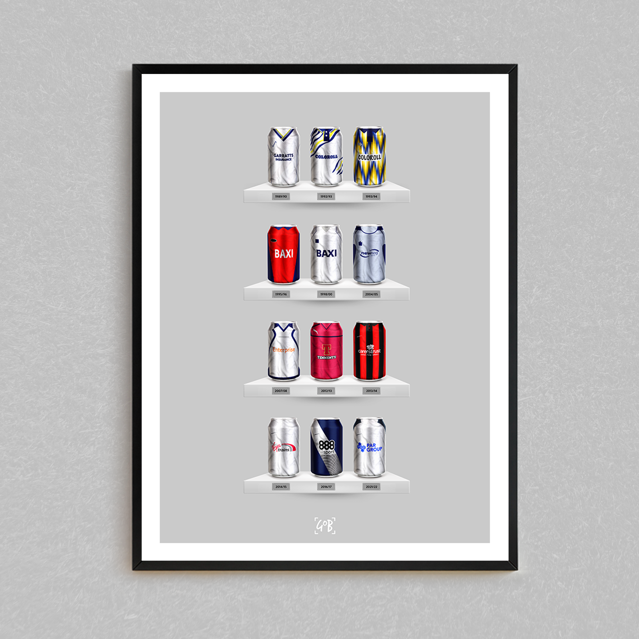 Celebrate legendary football kits from the past few decades, each one digitally illustrated in your choice of our unique can or bottle styles. Printed in high-definition on premium gloss paper, these designs are made to stand out, whether framed or displayed as they are. Also available as a matching T-shirt