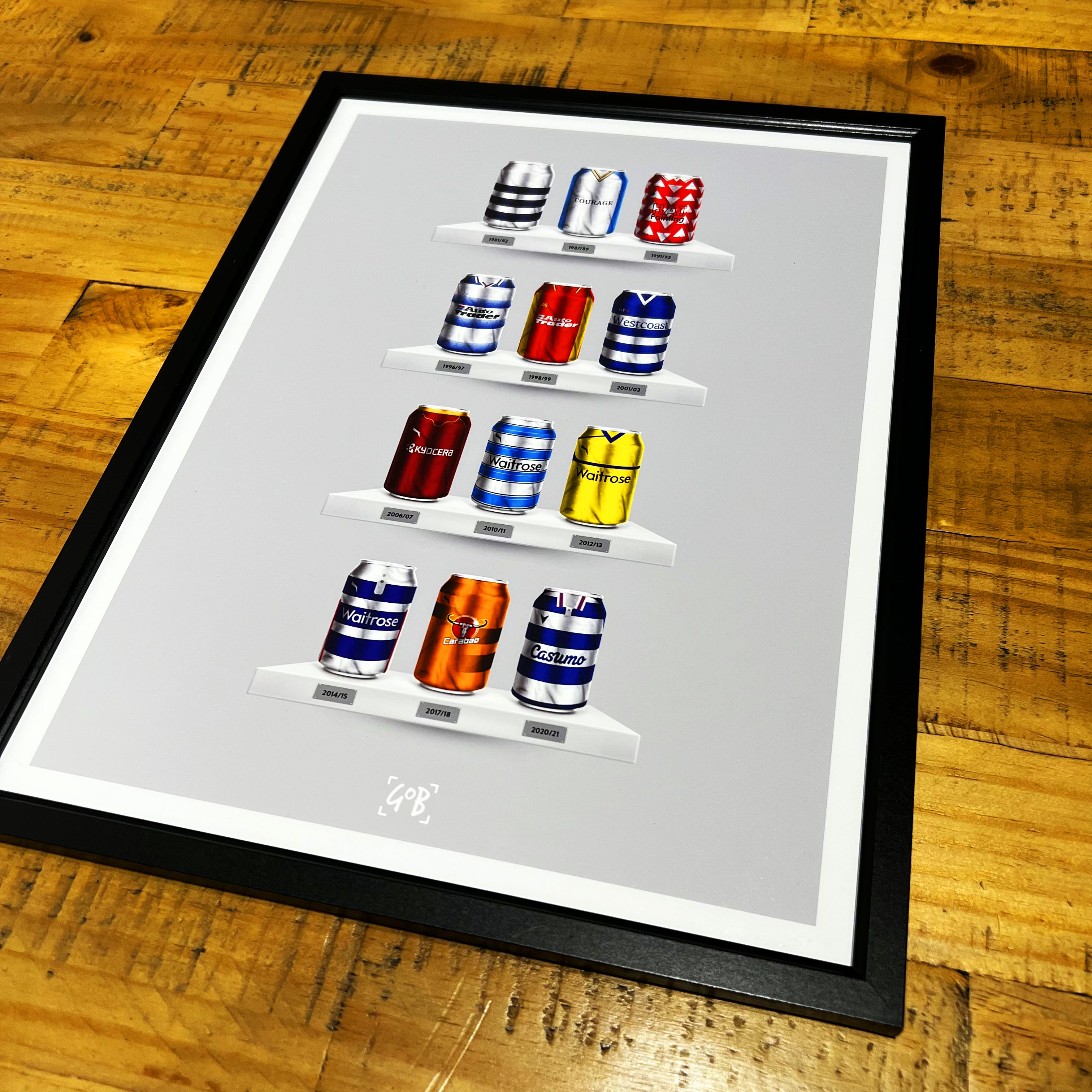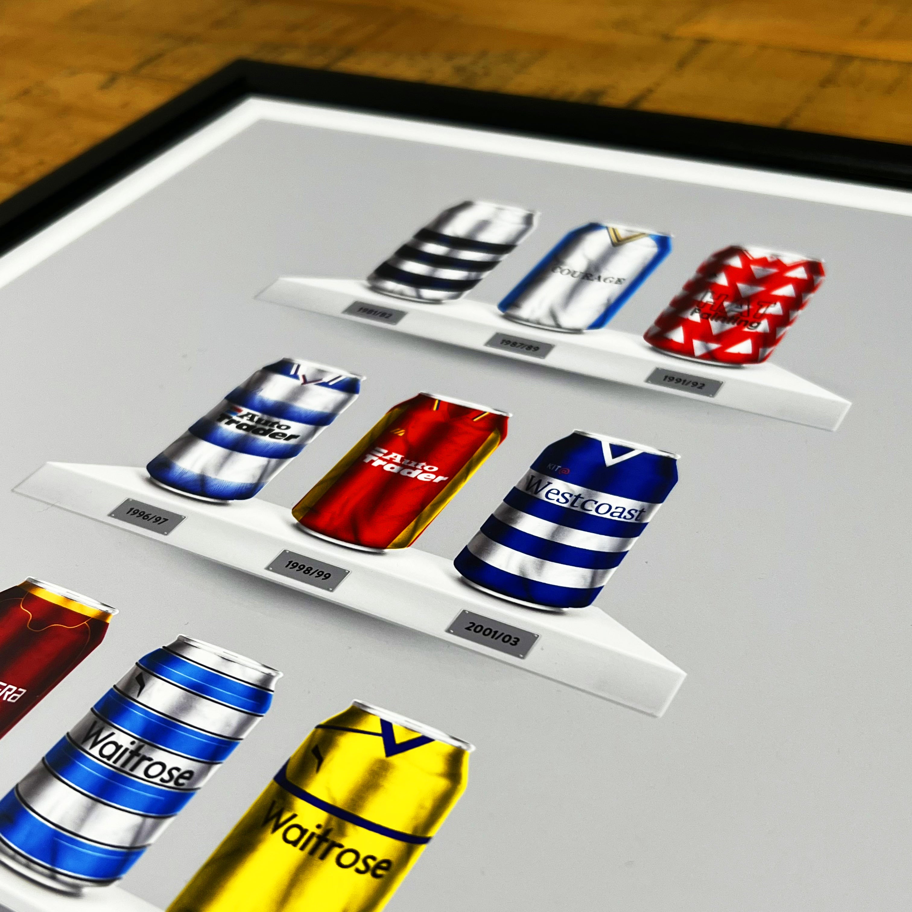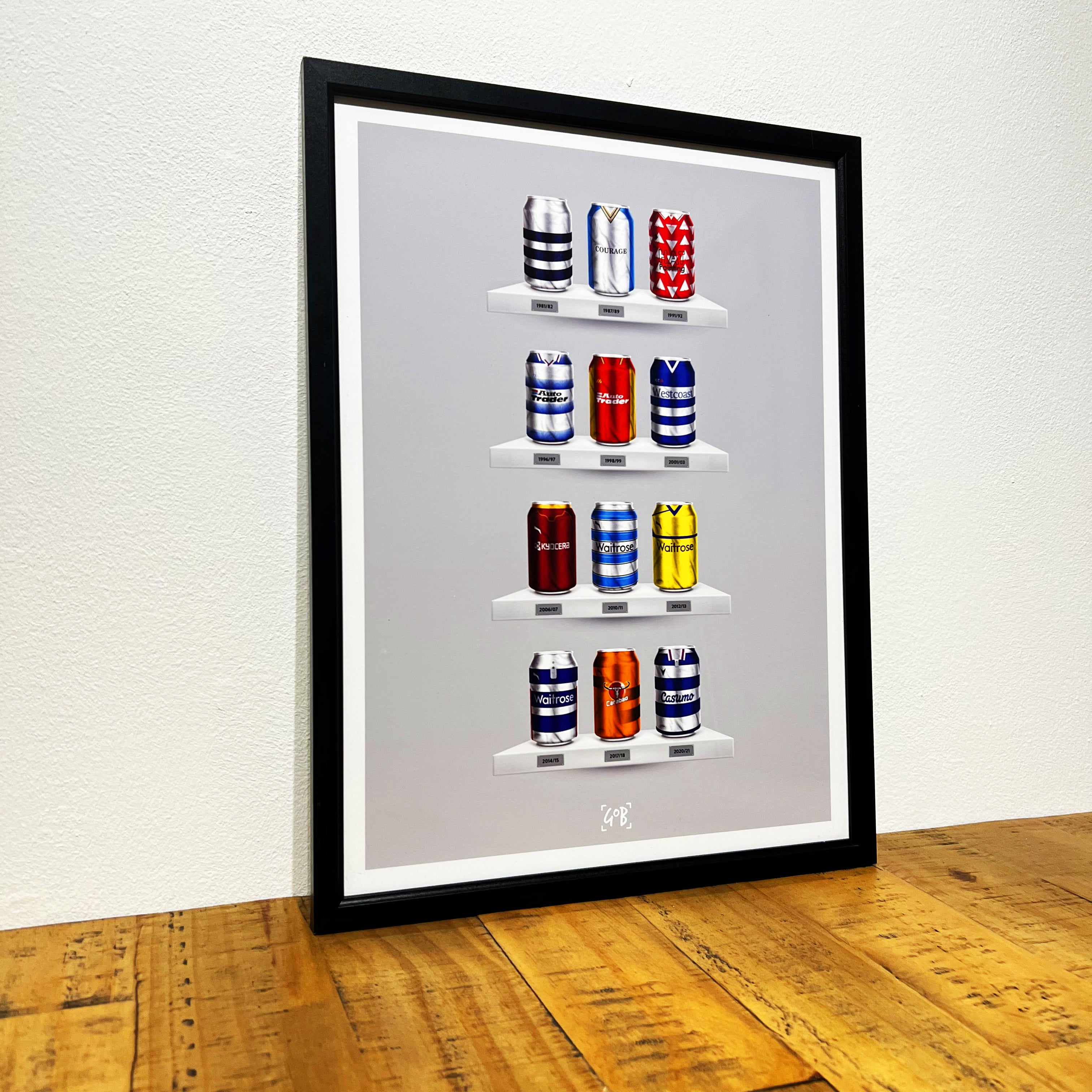 Celebrate legendary football kits from the past few decades, each one digitally illustrated in your choice of our unique can or bottle styles. Printed in high-definition on premium gloss paper, these designs are made to stand out, whether framed or displayed as they are. Also available as a matching T-shirt