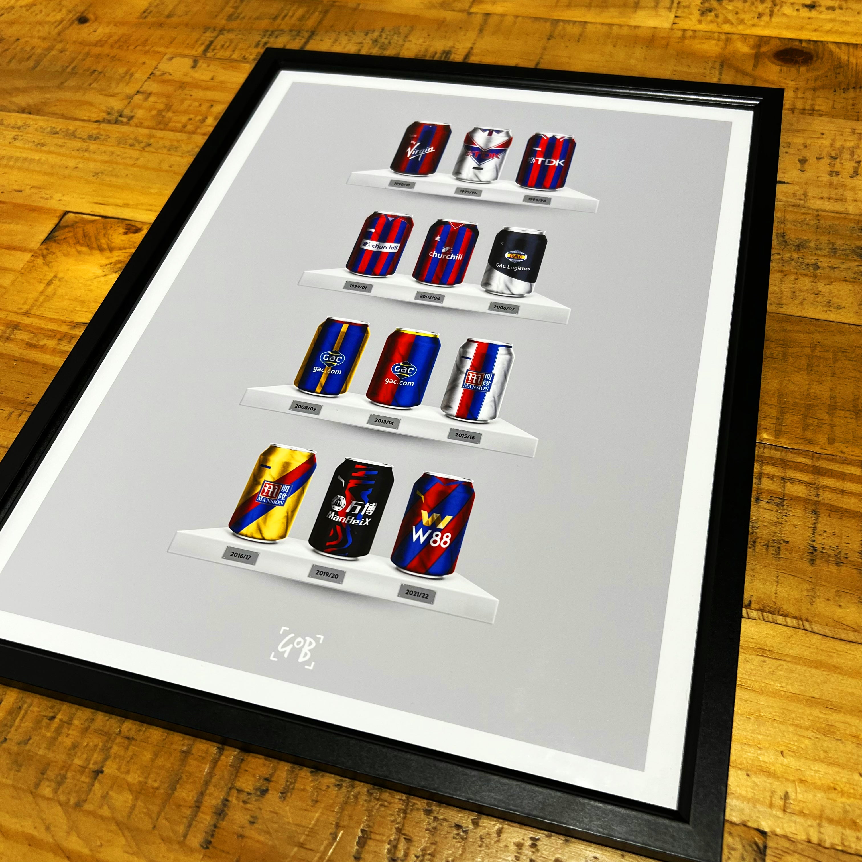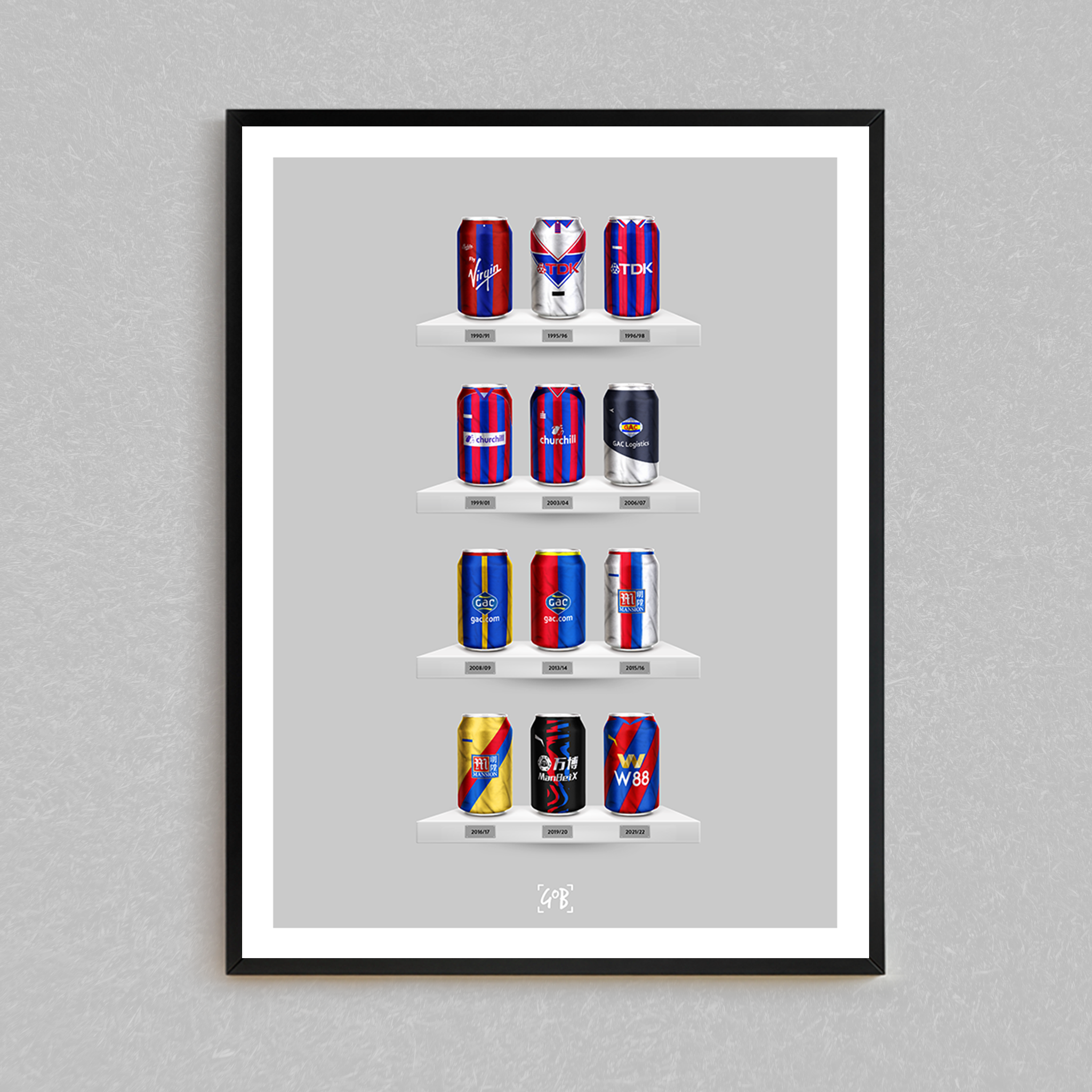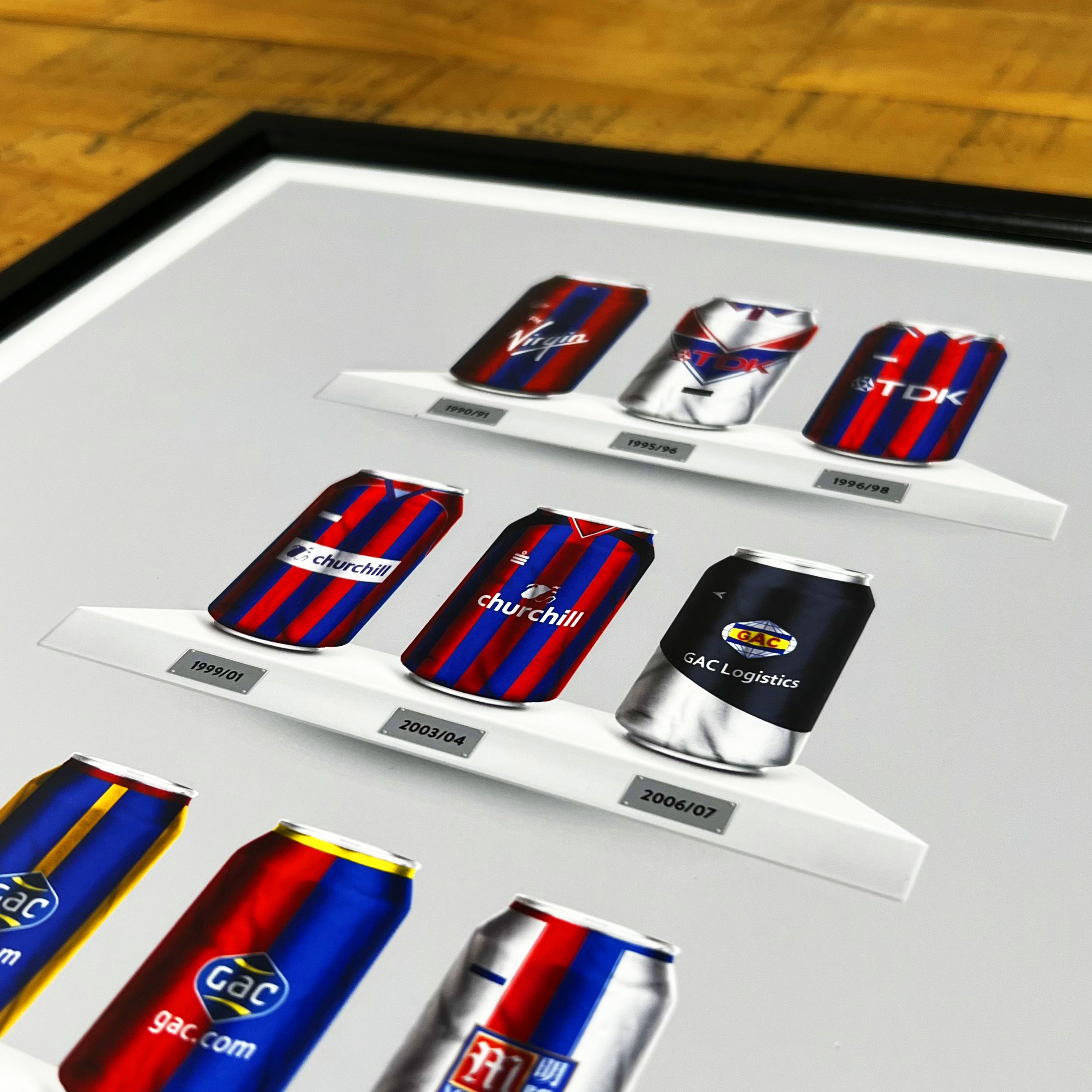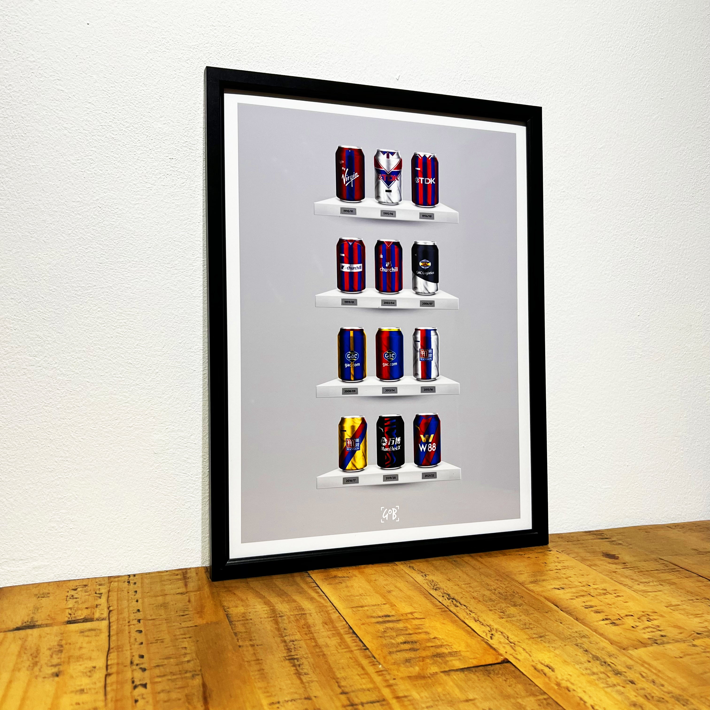 Celebrate legendary football kits from the past few decades, each one digitally illustrated in your choice of our unique can or bottle styles. Printed in high-definition on premium gloss paper, these designs are made to stand out, whether framed or displayed as they are. Also available as a matching T-shirt