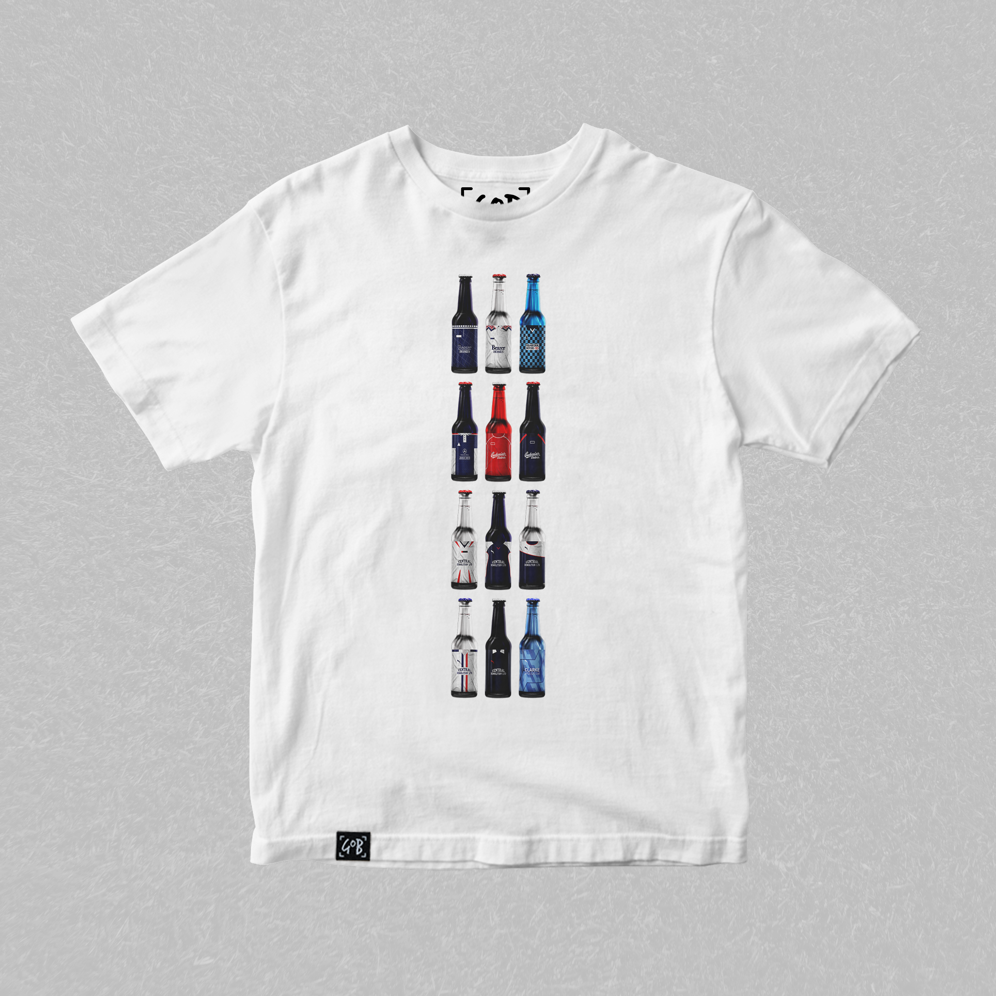 Twelve iconic kits from your club’s past, reimagined as collectible beer bottles in a bold, fan-made design. Each bottle tells a story — of unforgettable goals, cult heroes, and matchdays etched into football history. Crafted for supporters who carry the legacy, this tee is a wearable celebration of heritage, pride, and pints.
