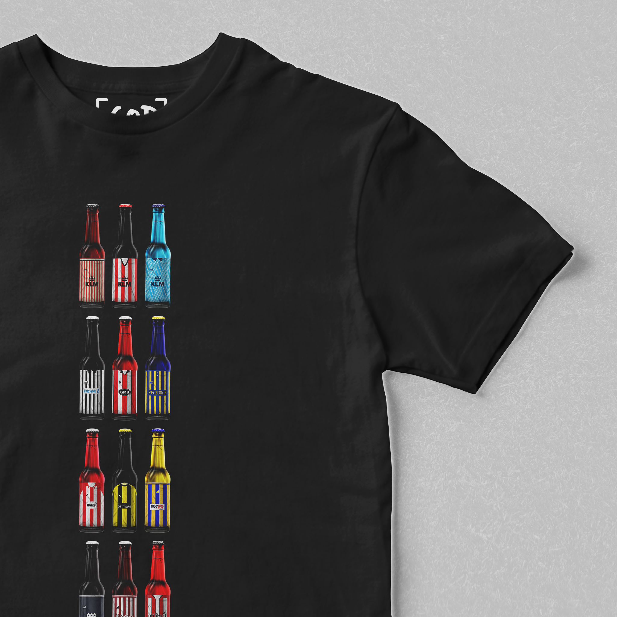 Twelve iconic kits from your club’s past, reimagined as collectible beer bottles in a bold, fan-made design. Each bottle tells a story — of unforgettable goals, cult heroes, and matchdays etched into football history. Crafted for supporters who carry the legacy, this tee is a wearable celebration of heritage, pride, and pints.
