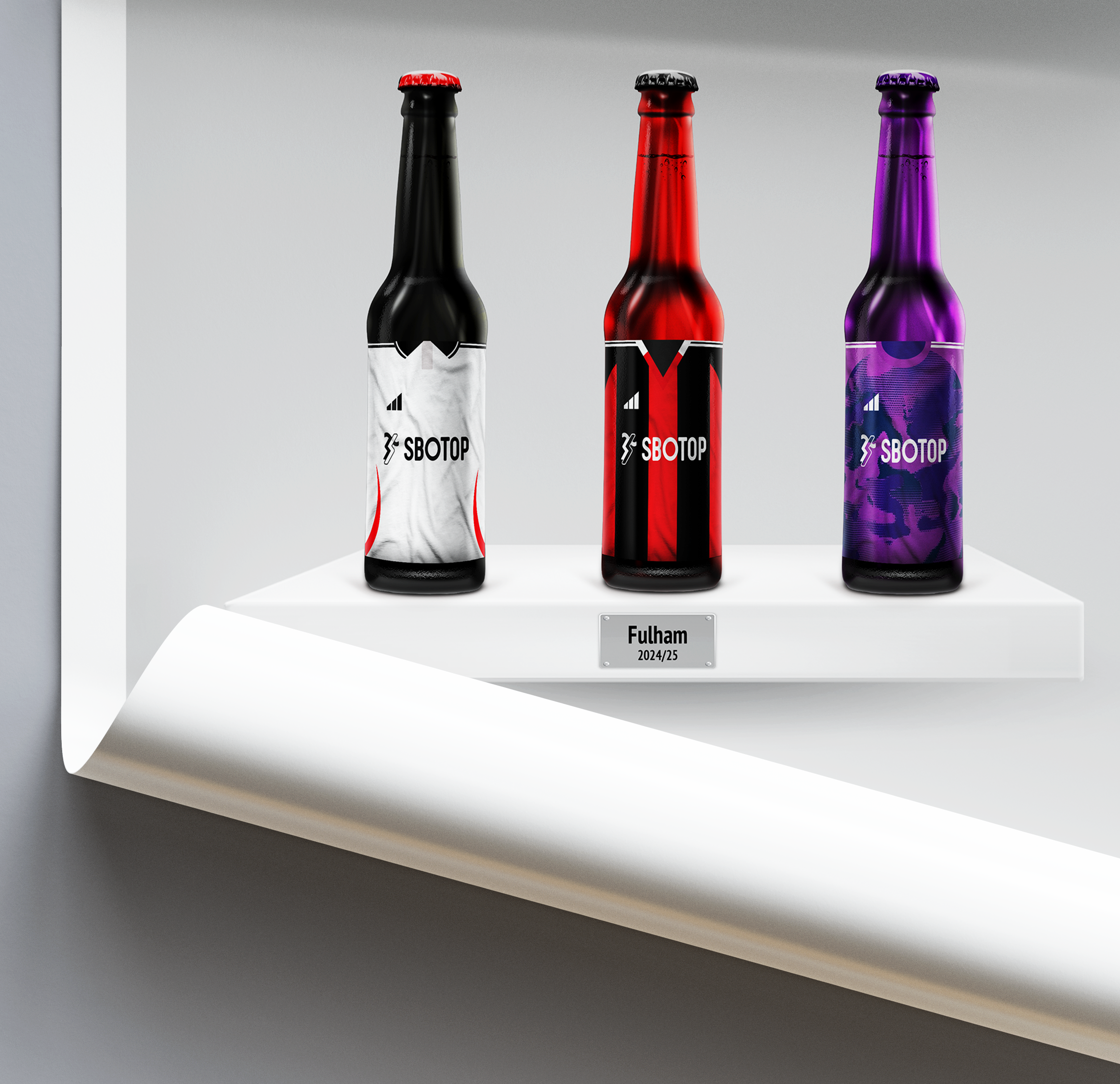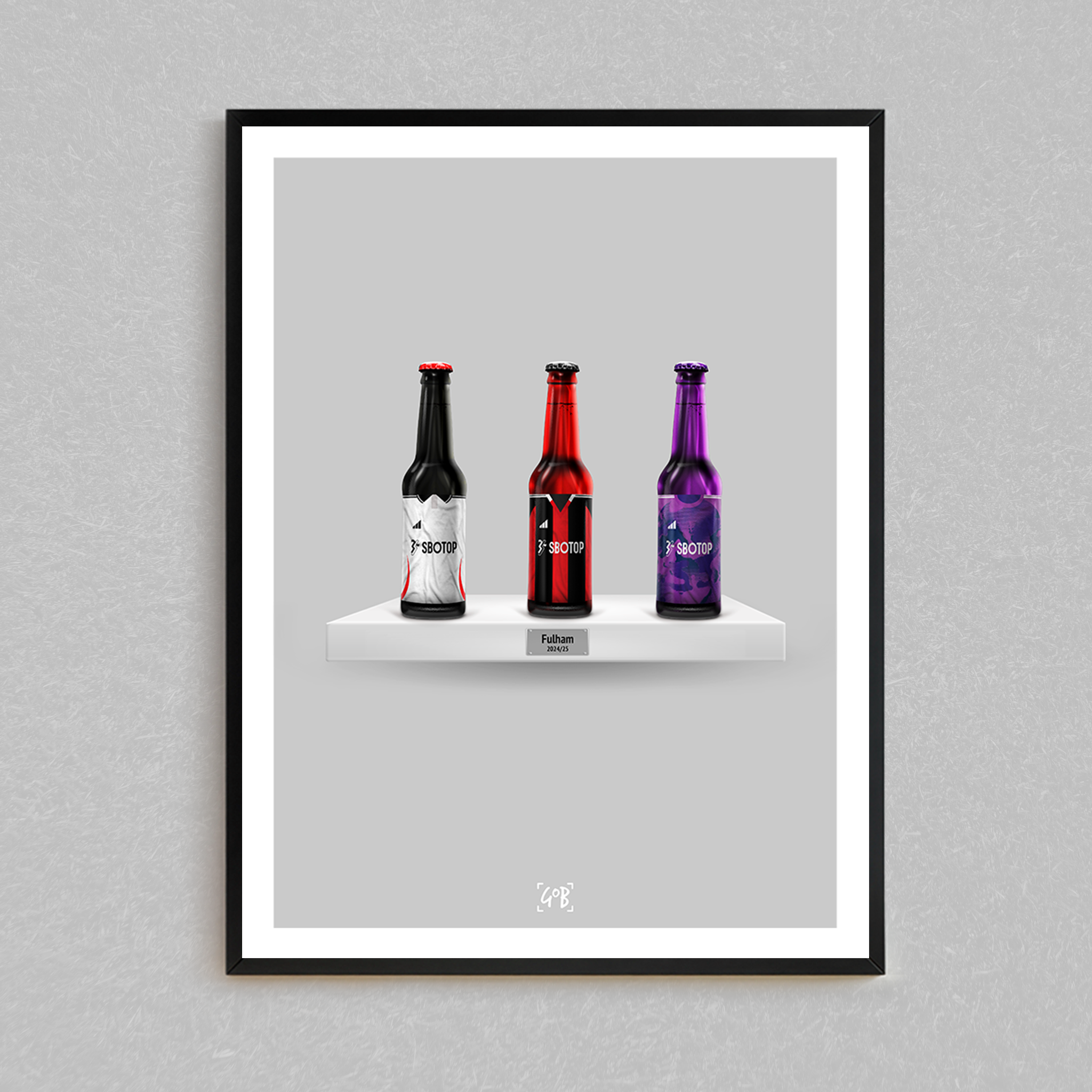 Raise a bottle to the new season. This original art print reimagines the 2024/25 home, away, and third kits as a lineup of collectible beer bottles — a creative fusion of football, design, and post-match tradition.