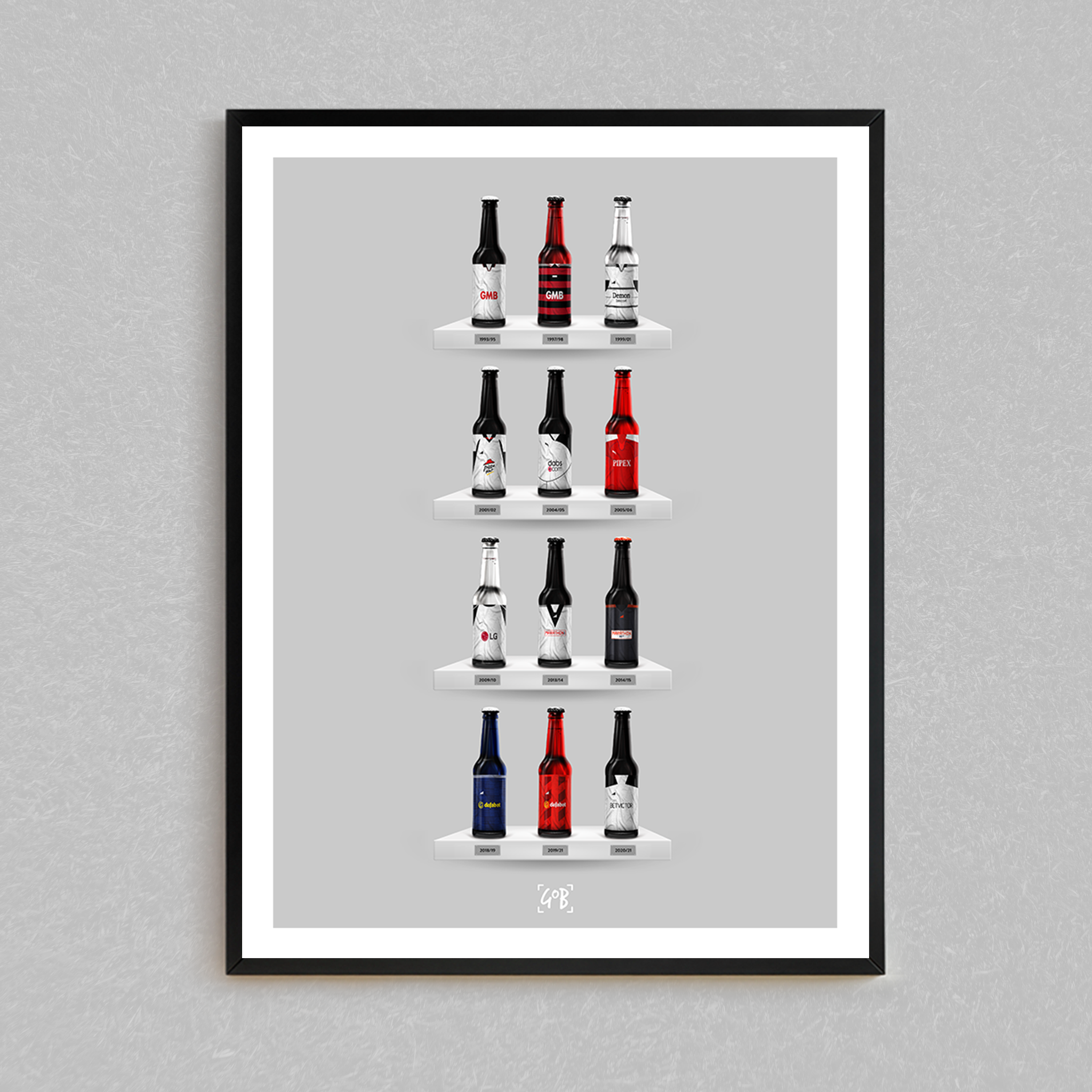 Celebrate legendary football kits from the past few decades, each one digitally illustrated in your choice of our unique can or bottle styles. Printed in high-definition on premium gloss paper, these designs are made to stand out, whether framed or displayed as they are. Also available as a matching T-shirt