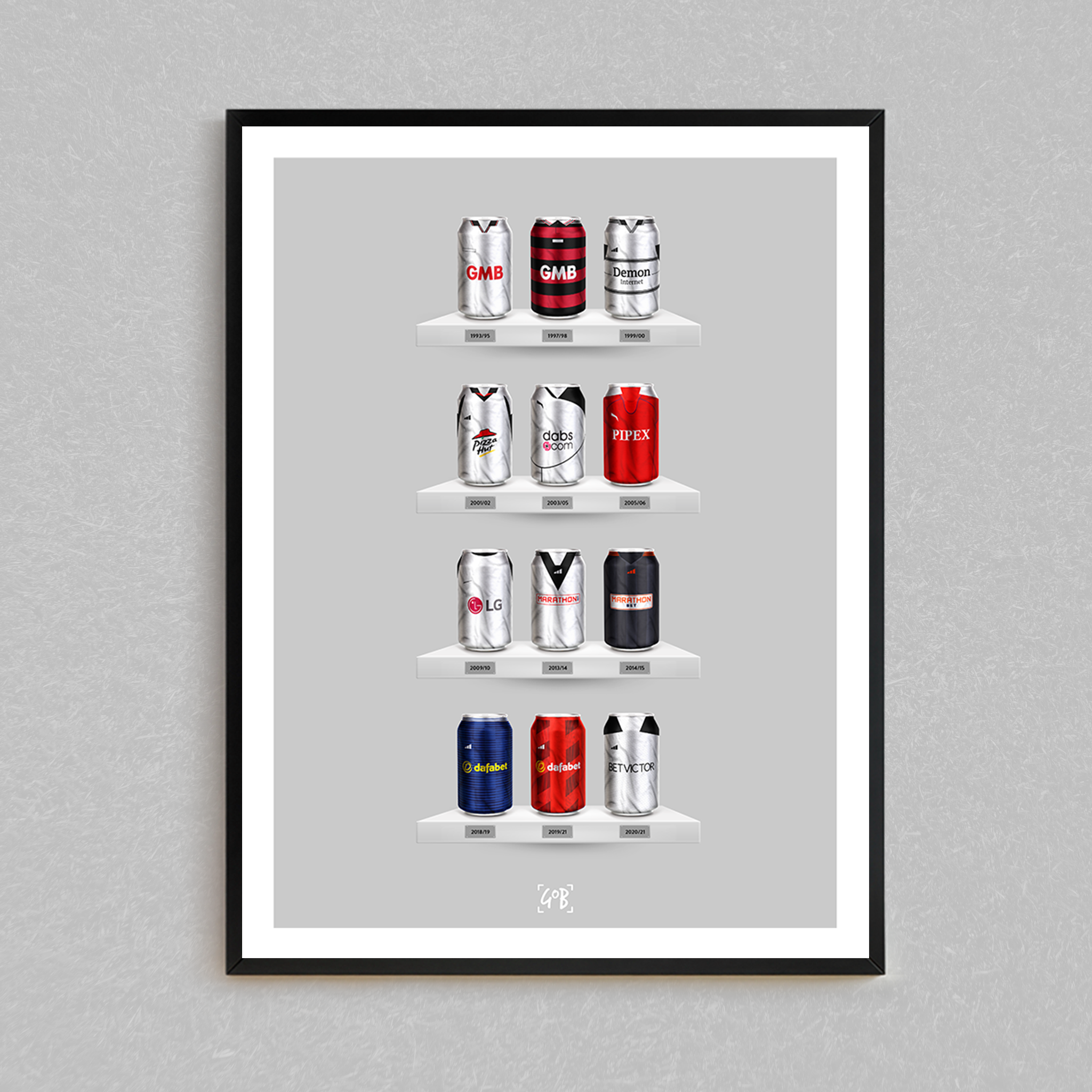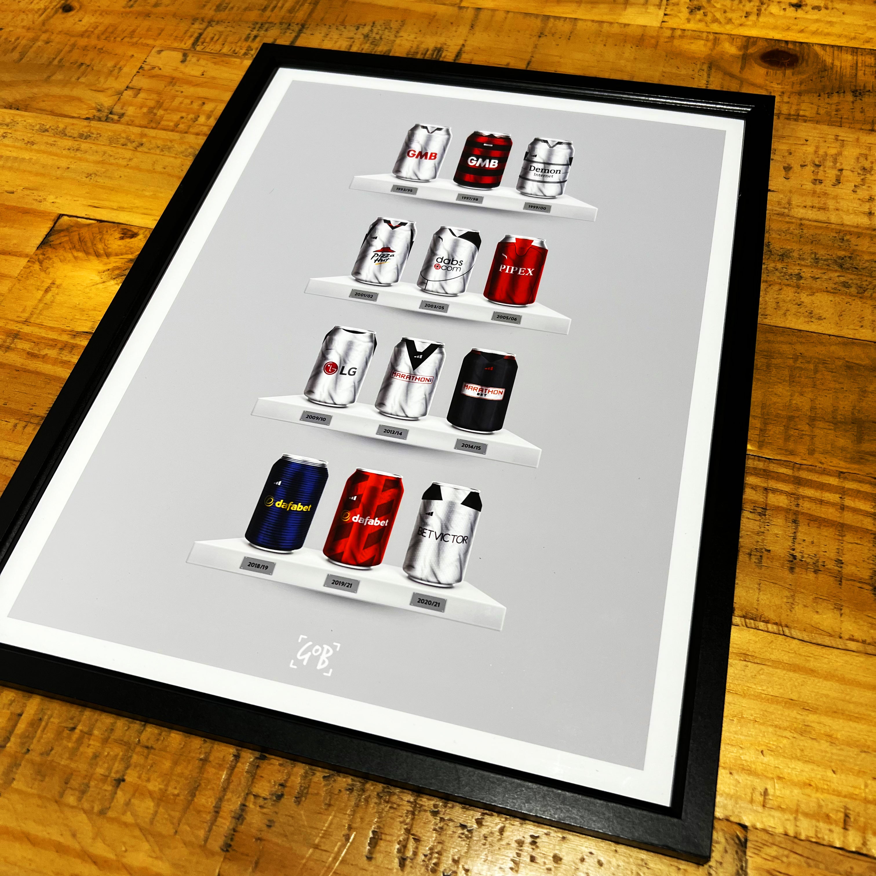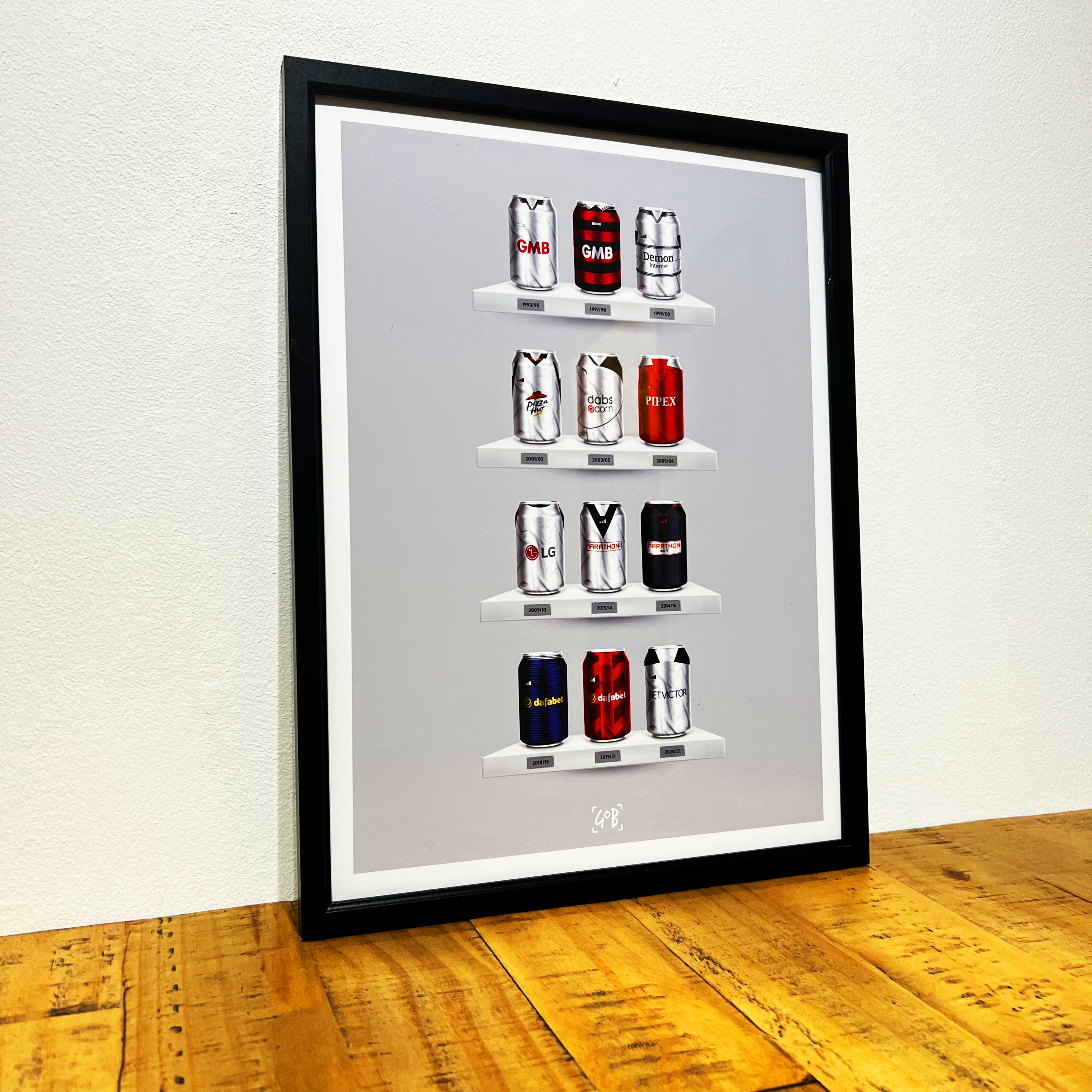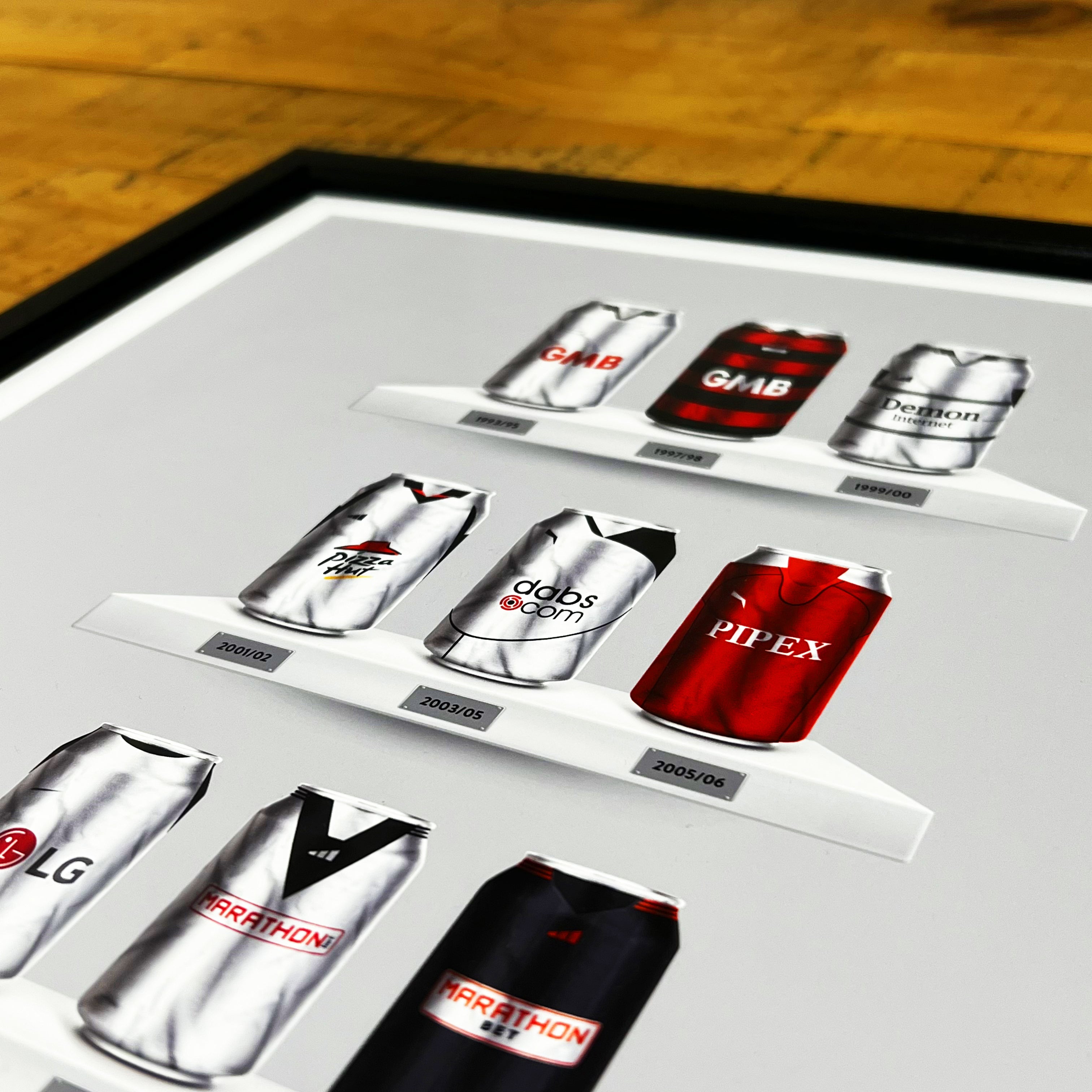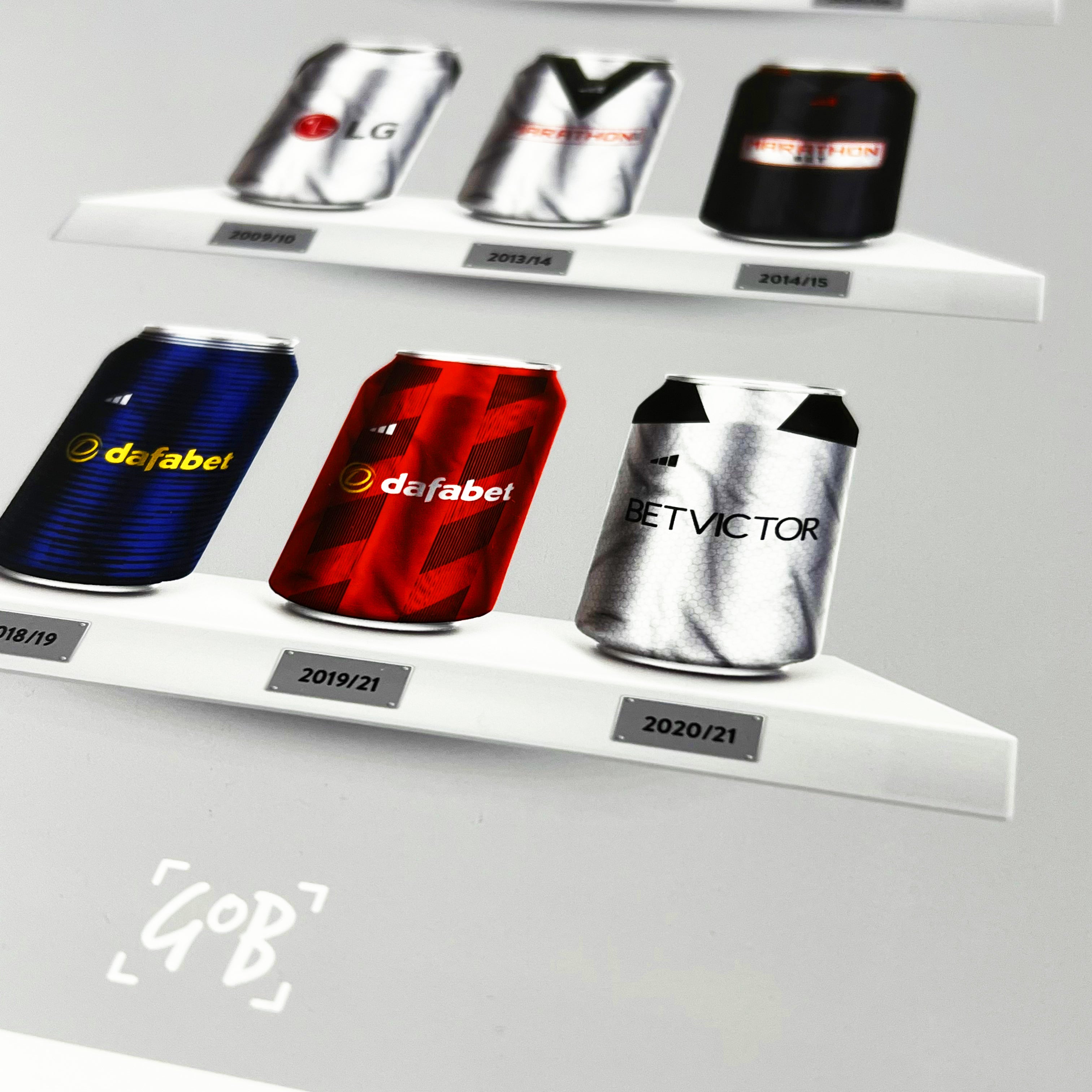 Celebrate legendary football kits from the past few decades, each one digitally illustrated in your choice of our unique can or bottle styles. Printed in high-definition on premium gloss paper, these designs are made to stand out, whether framed or displayed as they are. Also available as a matching T-shirt