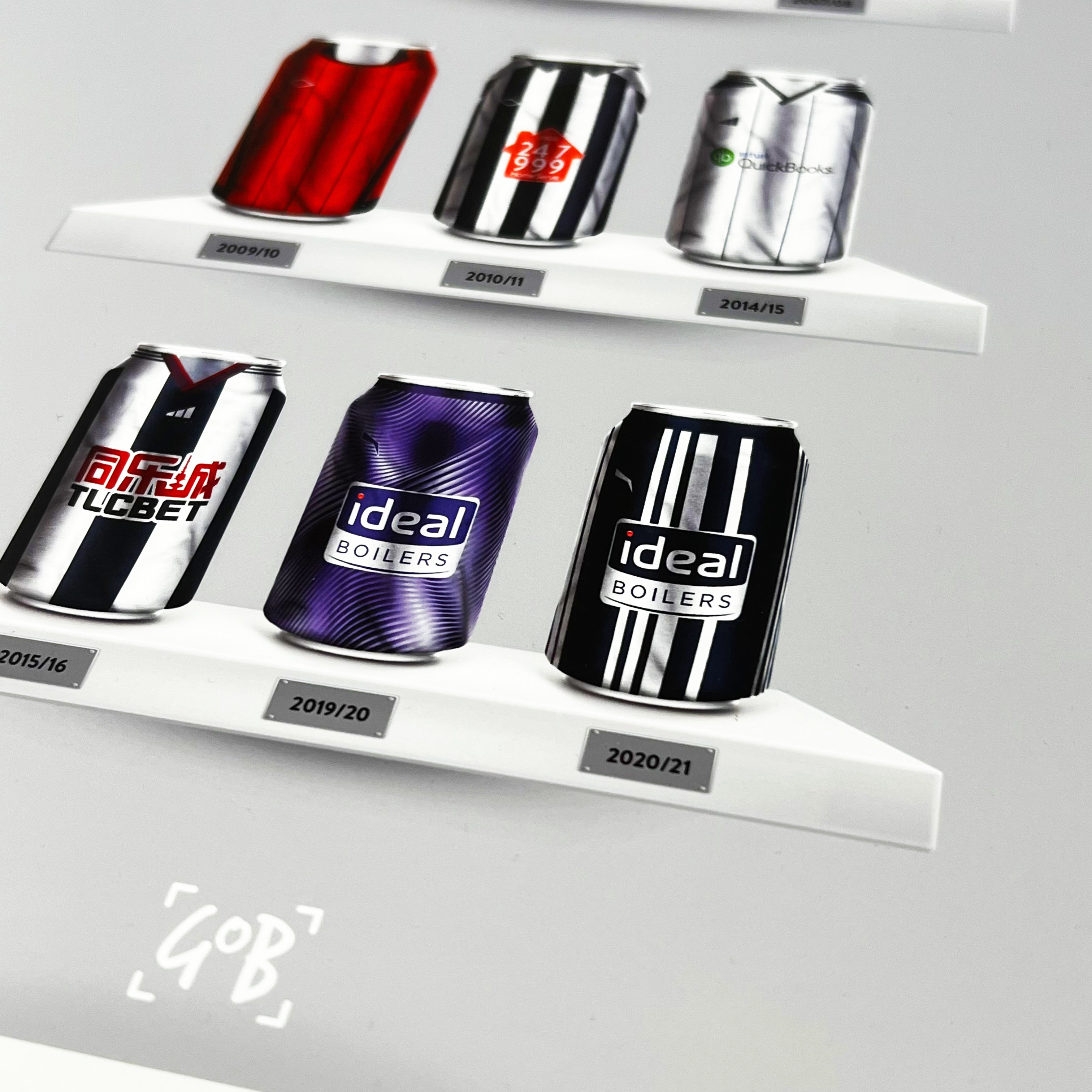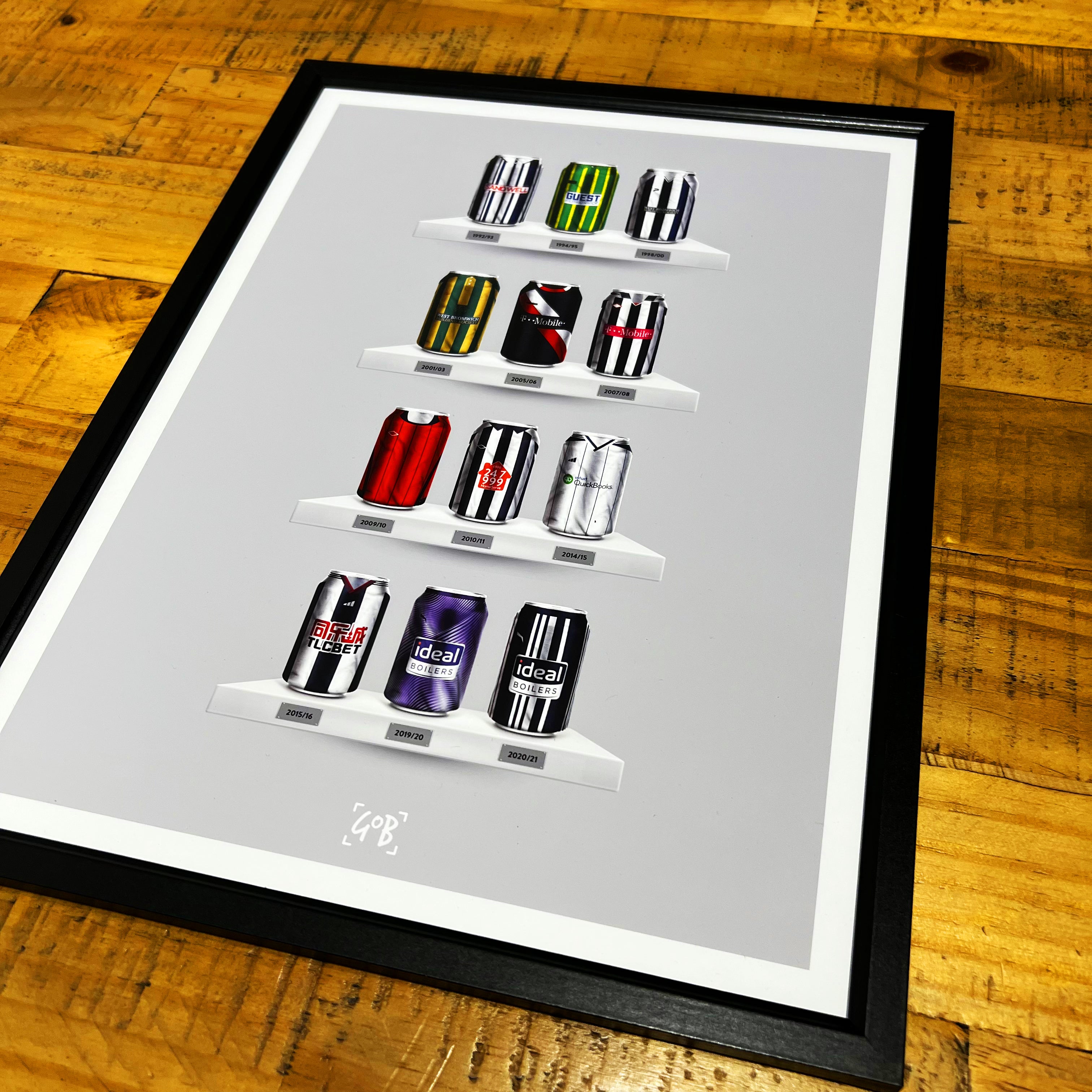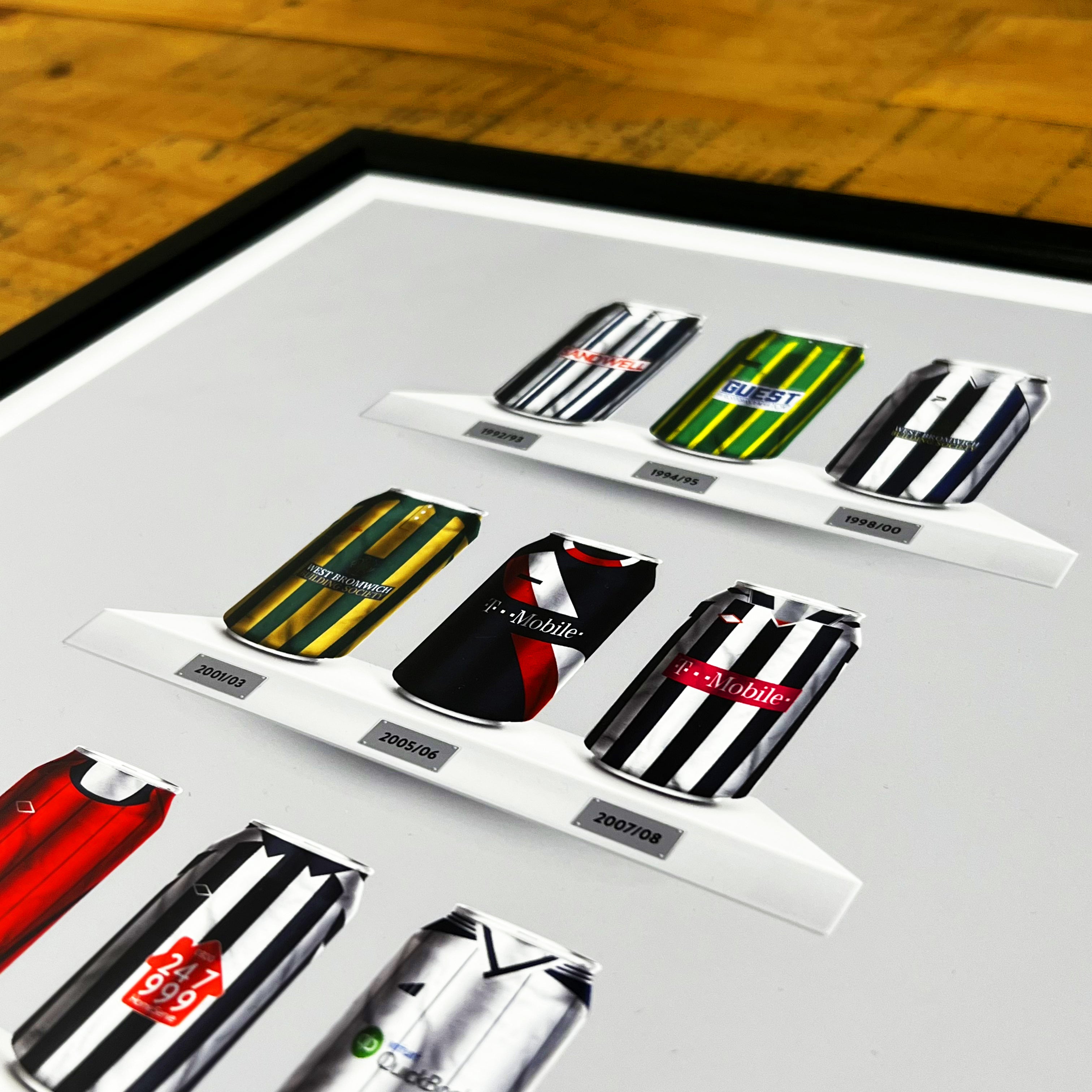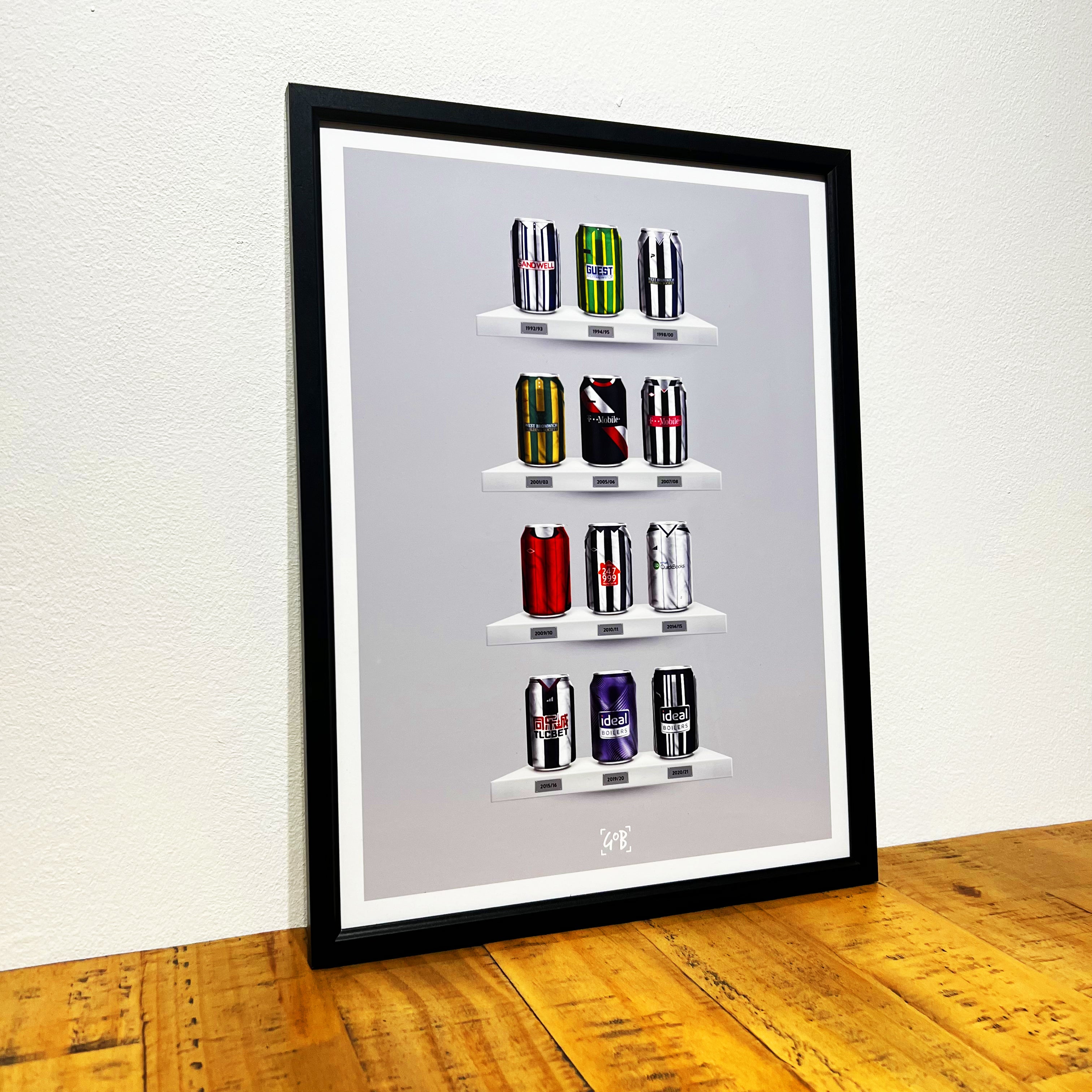Celebrate legendary football kits from the past few decades, each one digitally illustrated in your choice of our unique can or bottle styles. Printed in high-definition on premium gloss paper, these designs are made to stand out, whether framed or displayed as they are. Also available as a matching T-shirt