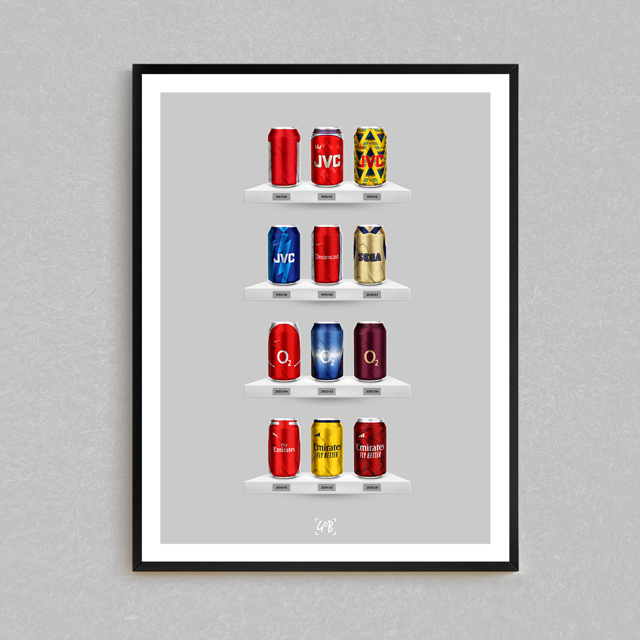 Celebrate legendary football kits from the past few decades, each one digitally illustrated in your choice of our unique can or bottle styles. Printed in high-definition on premium gloss paper, these designs are made to stand out, whether framed or displayed as they are. Also available as a matching T-shirt