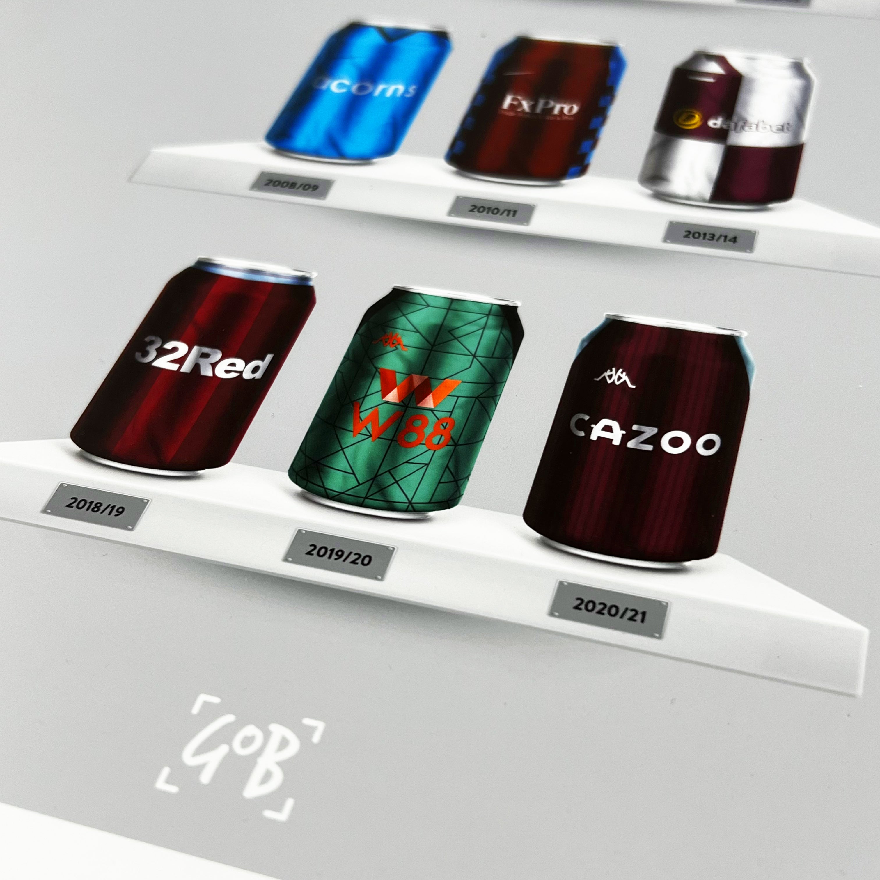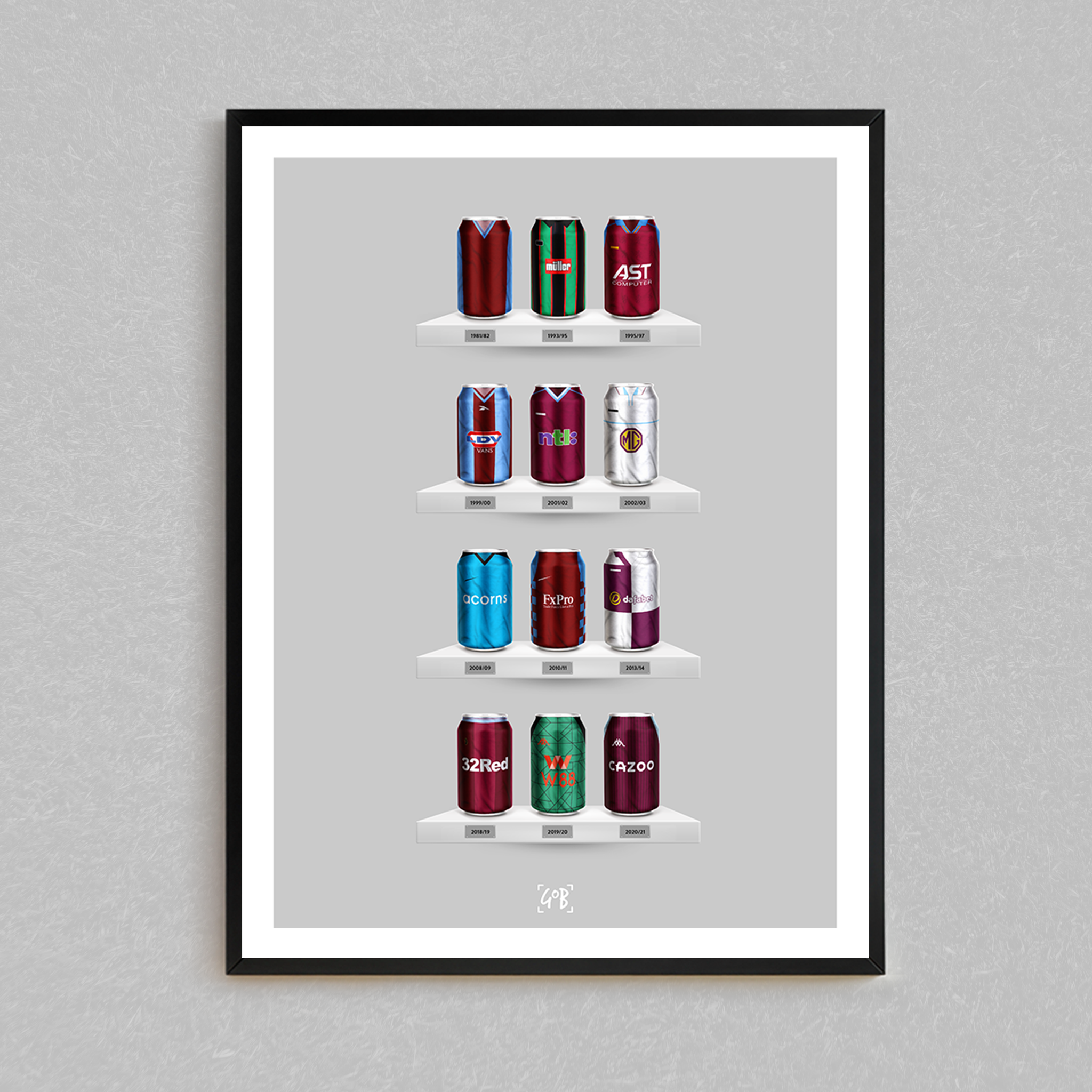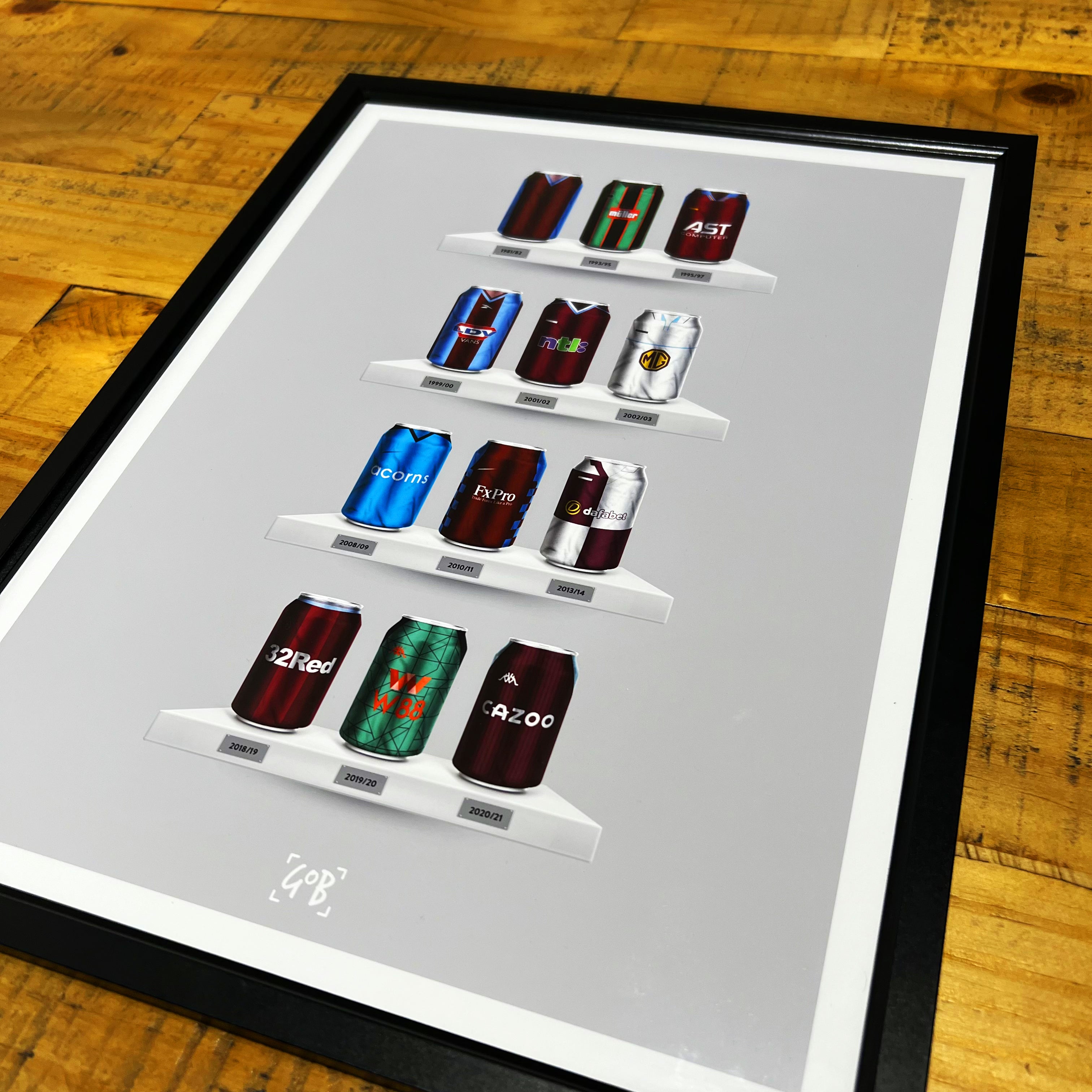 Celebrate legendary football kits from the past few decades, each one digitally illustrated in your choice of our unique can or bottle styles. Printed in high-definition on premium gloss paper, these designs are made to stand out, whether framed or displayed as they are. Also available as a matching T-shirt