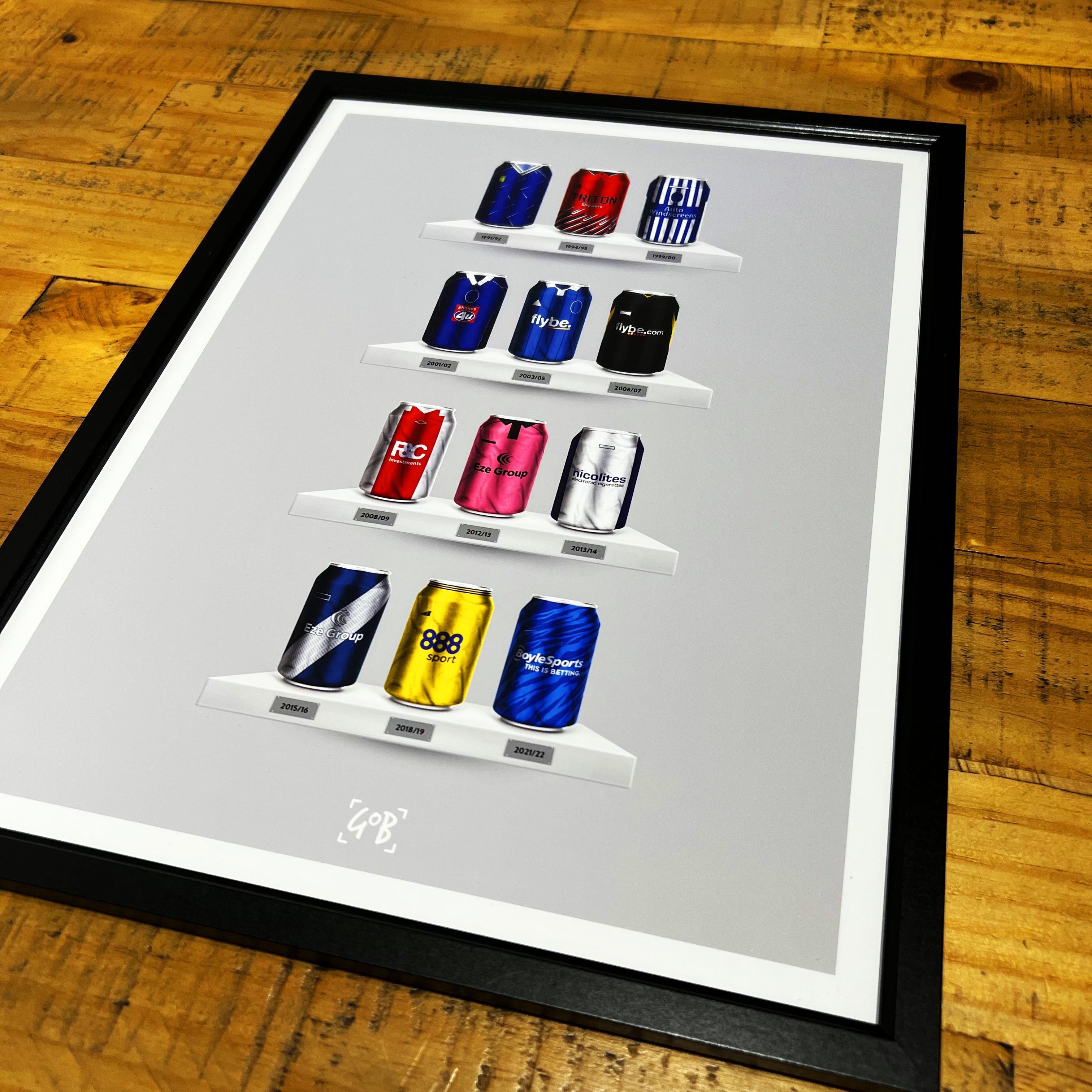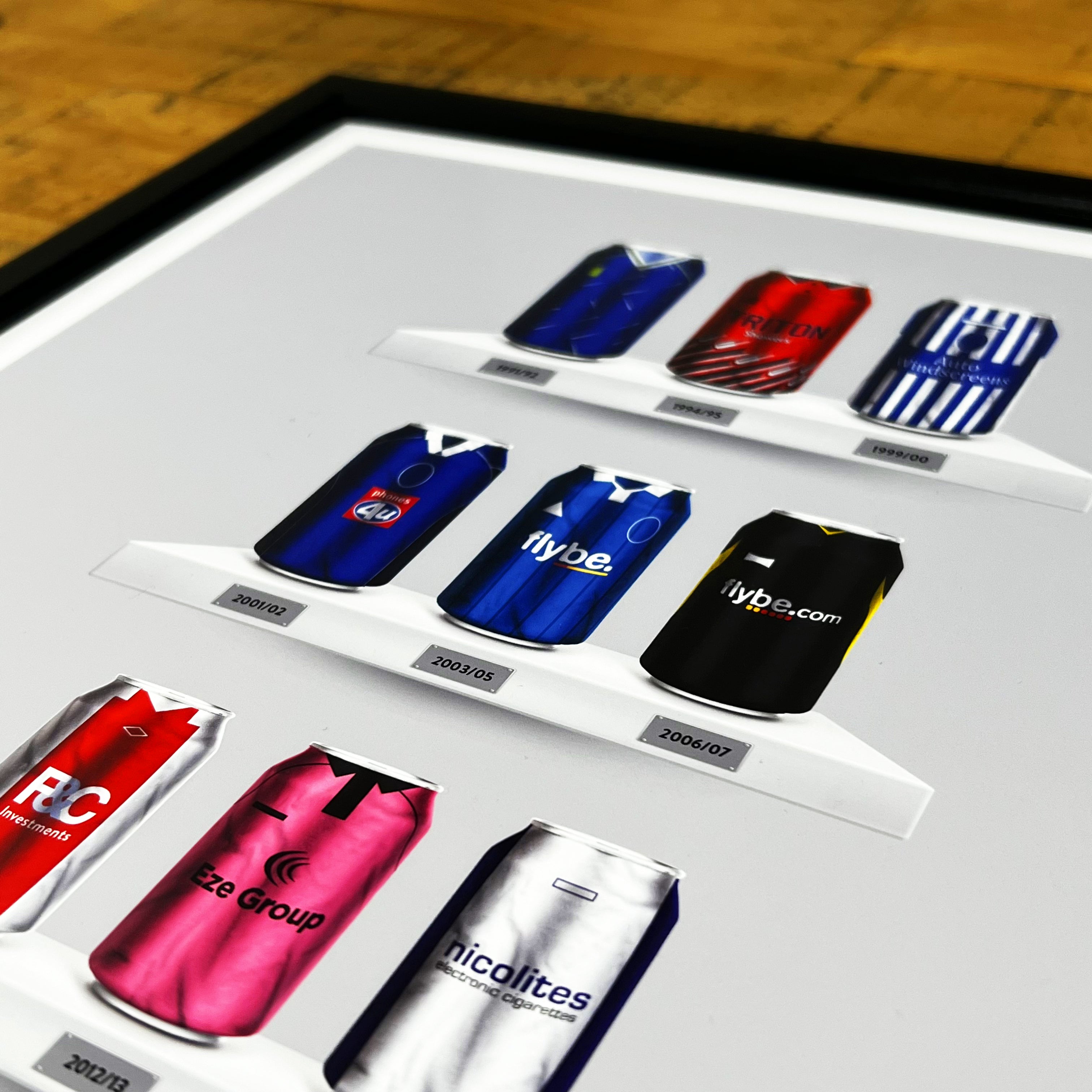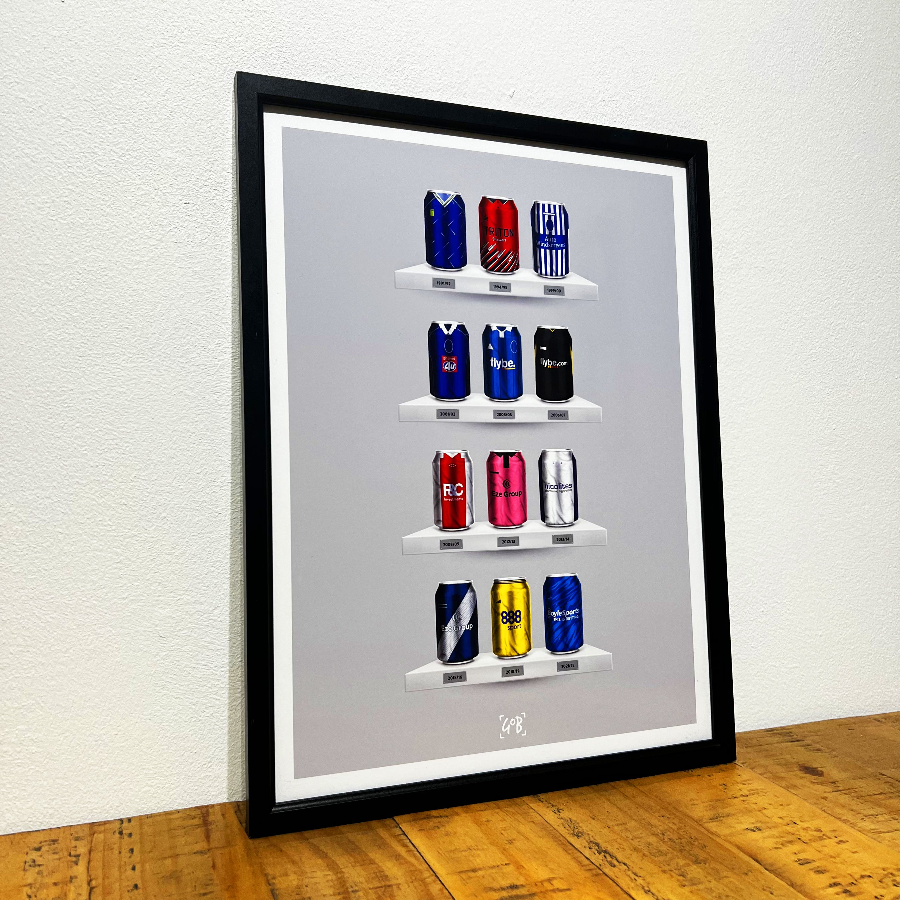Celebrate legendary football kits from the past few decades, each one digitally illustrated in your choice of our unique can or bottle styles. Printed in high-definition on premium gloss paper, these designs are made to stand out, whether framed or displayed as they are. Also available as a matching T-shirt