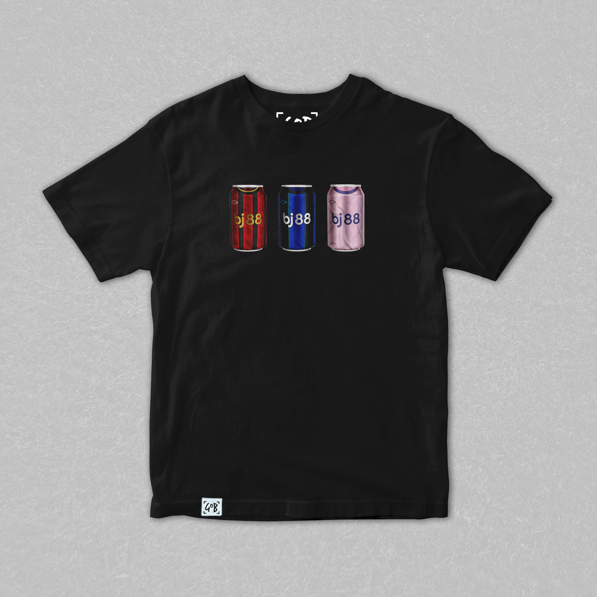 The 2025/26 season, canned. This fan-designed tee reimagines the latest home, away, and third kits as bold, collectible beer cans — each one a tribute to football, design, and post-match culture.