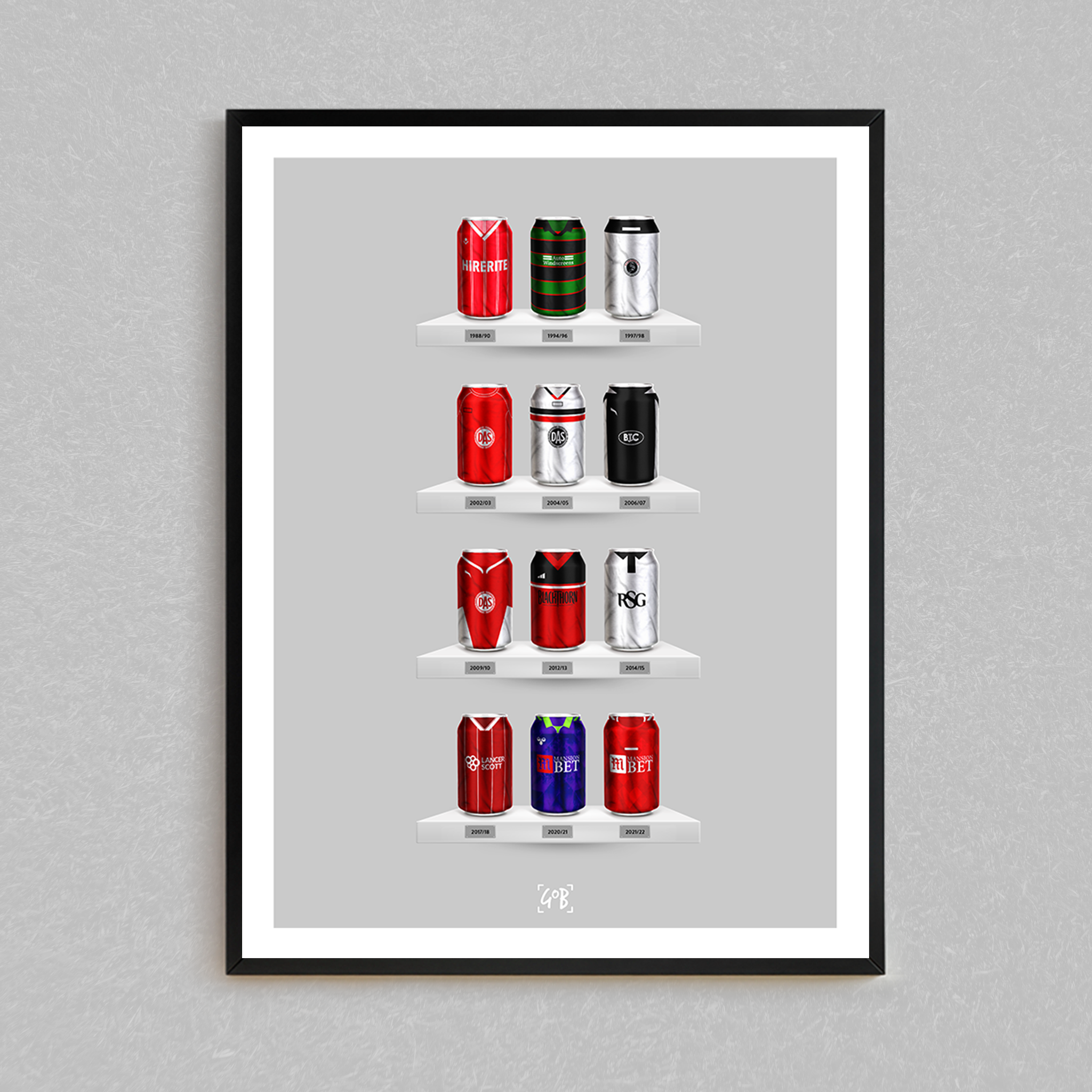 Celebrate legendary football kits from the past few decades, each one digitally illustrated in your choice of our unique can or bottle styles. Printed in high-definition on premium gloss paper, these designs are made to stand out, whether framed or displayed as they are. Also available as a matching T-shirt