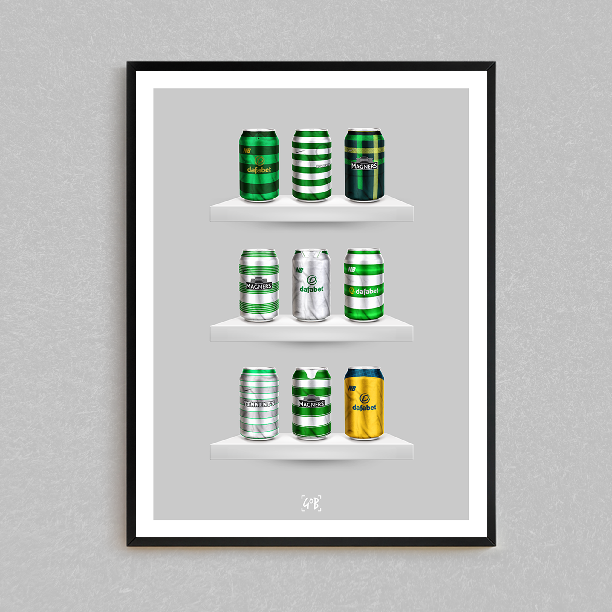 Celebrate legendary football kits from the past few decades, each one digitally illustrated in your choice of our unique can or bottle styles. Printed in high-definition on premium gloss paper, these designs are made to stand out, whether framed or displayed as they are. Also available as a matching T-shirt