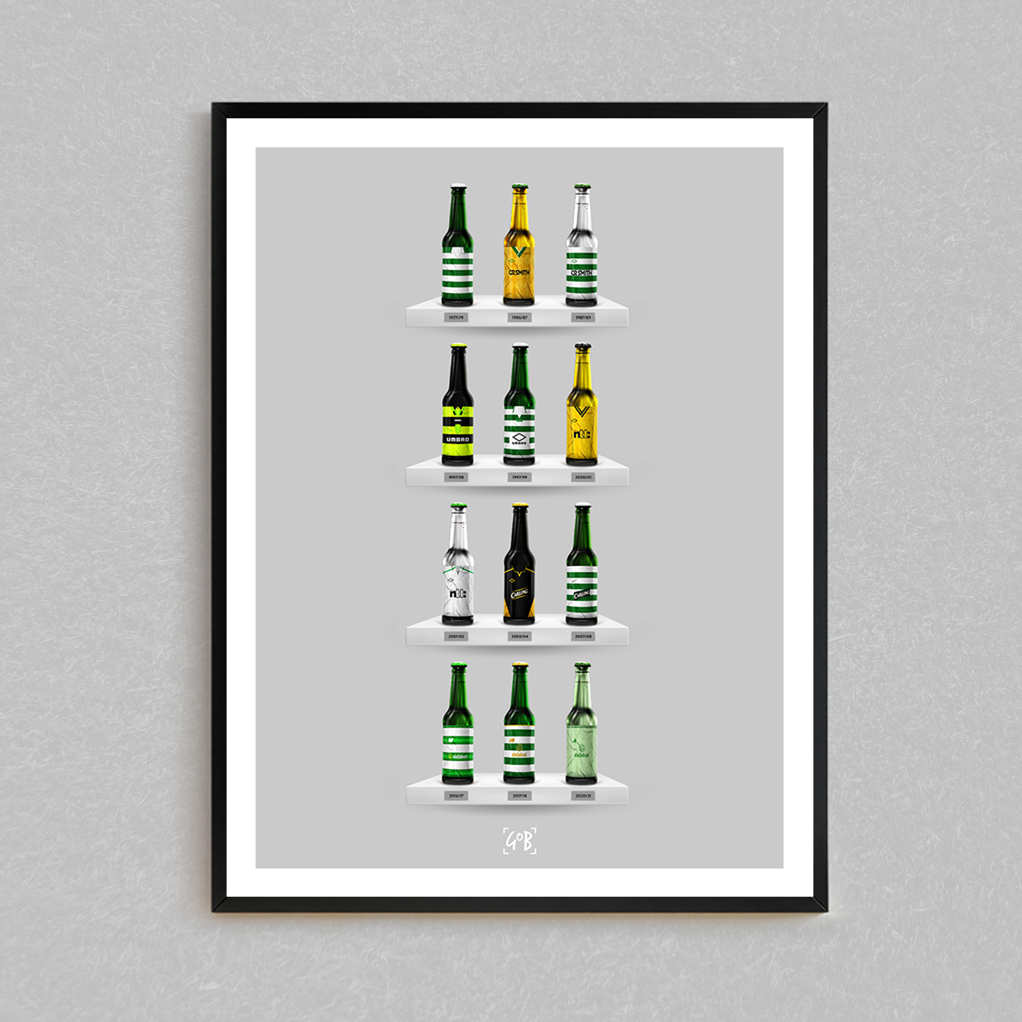 Celebrate legendary football kits from the past few decades, each one digitally illustrated in your choice of our unique can or bottle styles. Printed in high-definition on premium gloss paper, these designs are made to stand out, whether framed or displayed as they are. Also available as a matching T-shirt