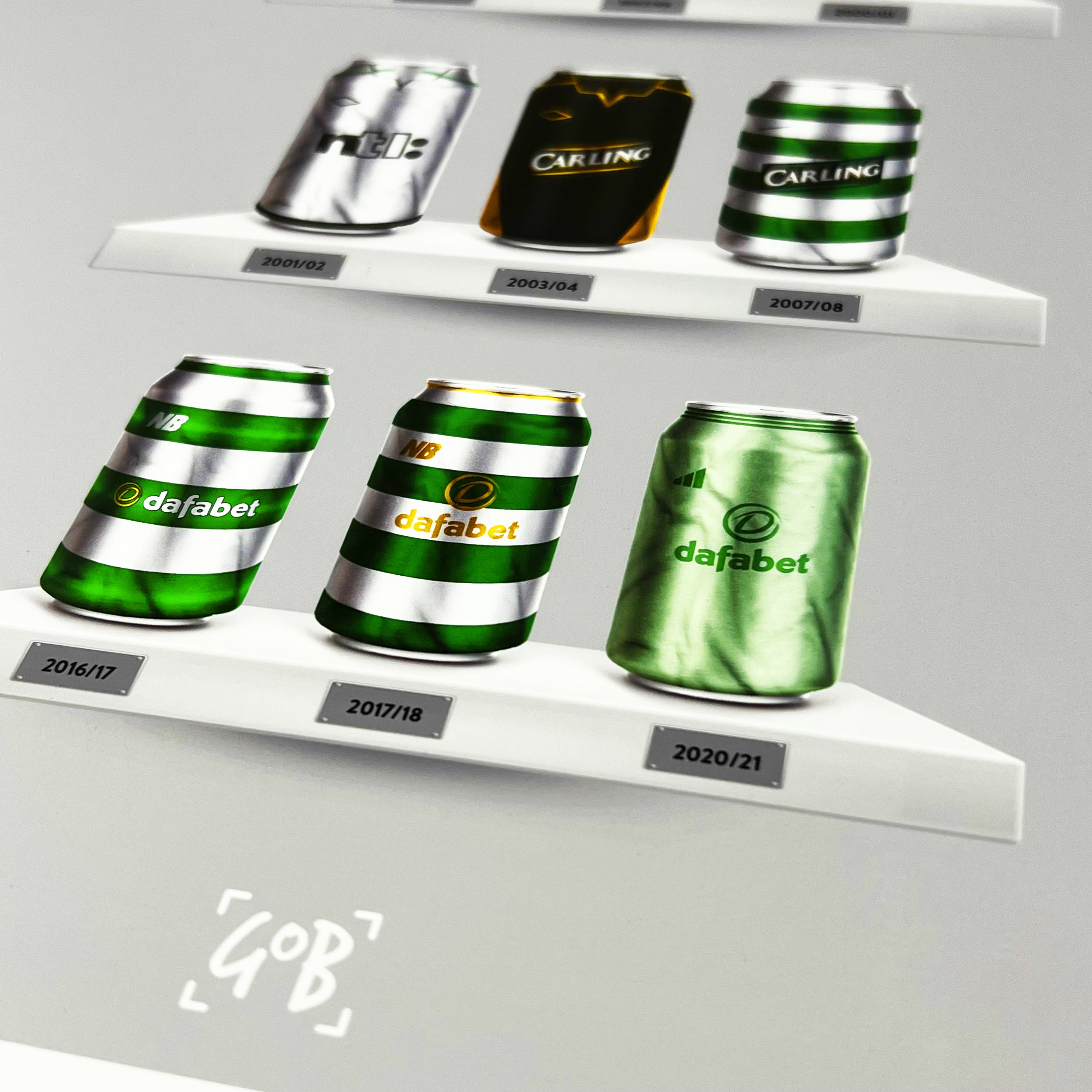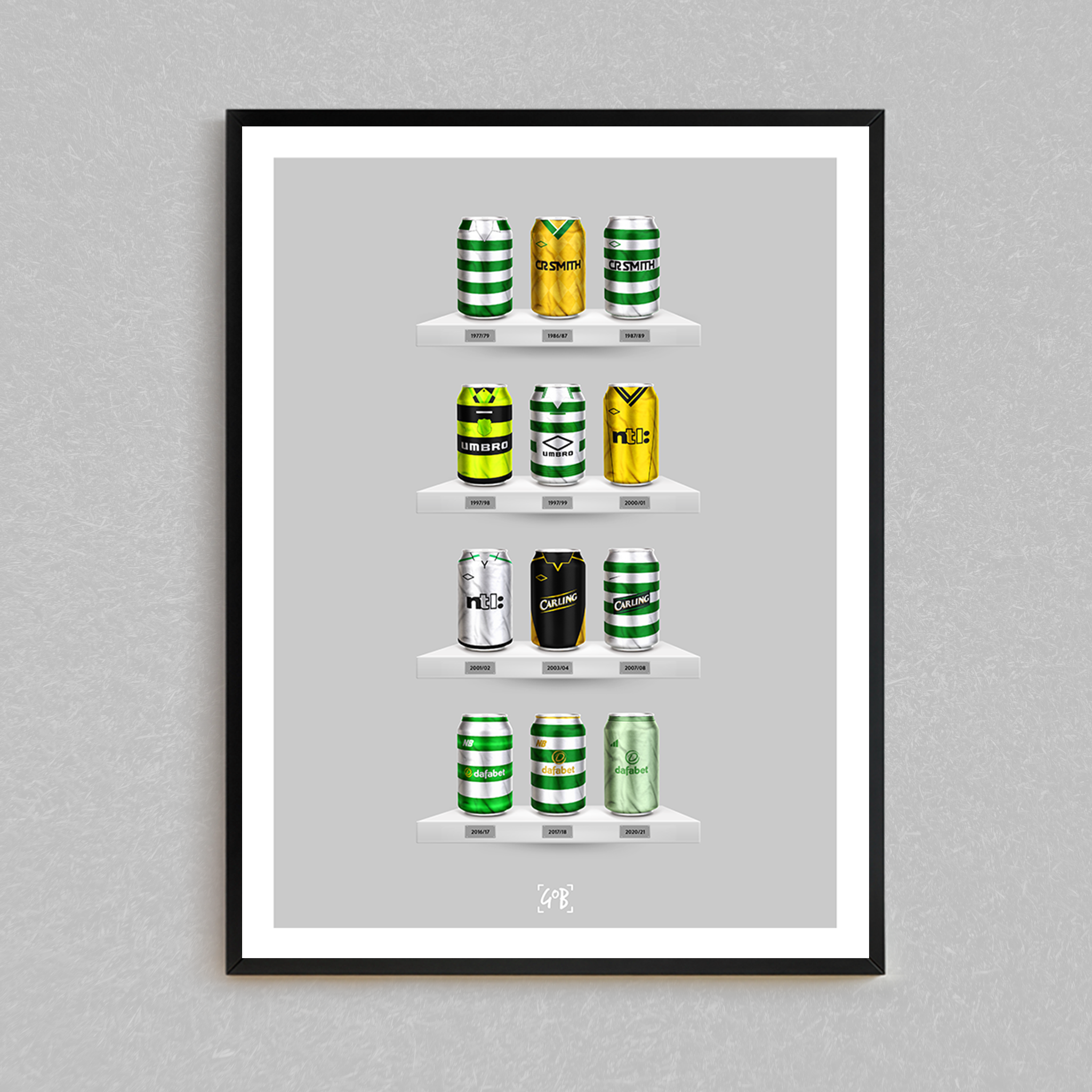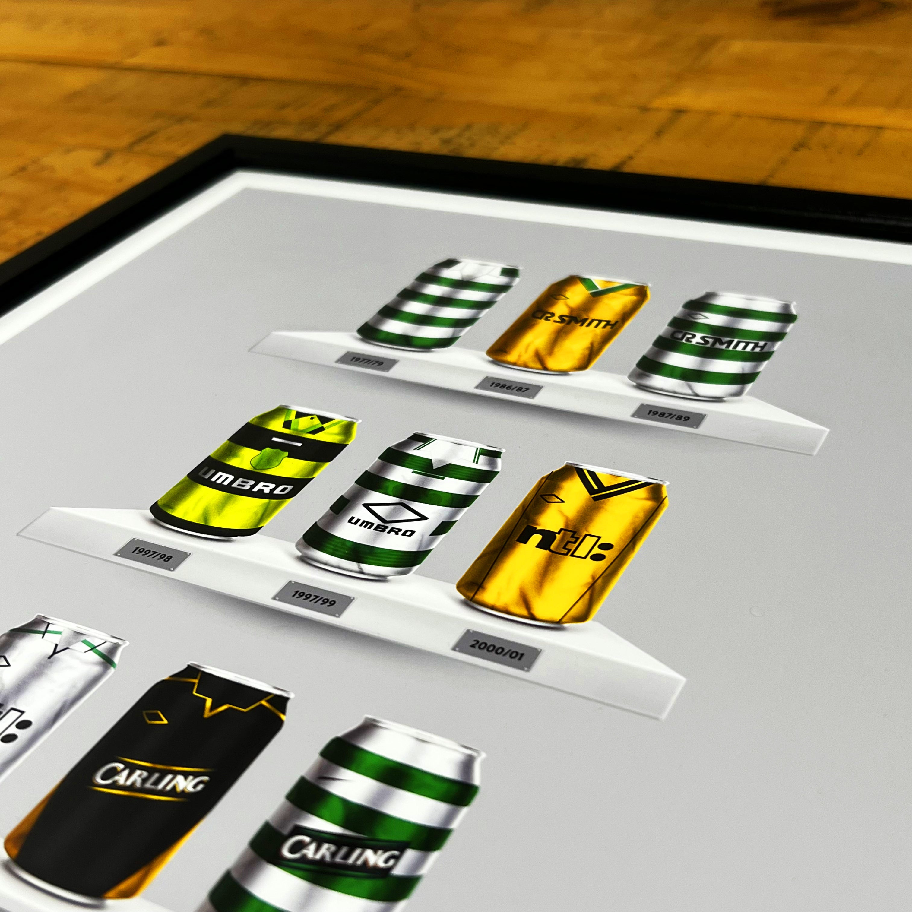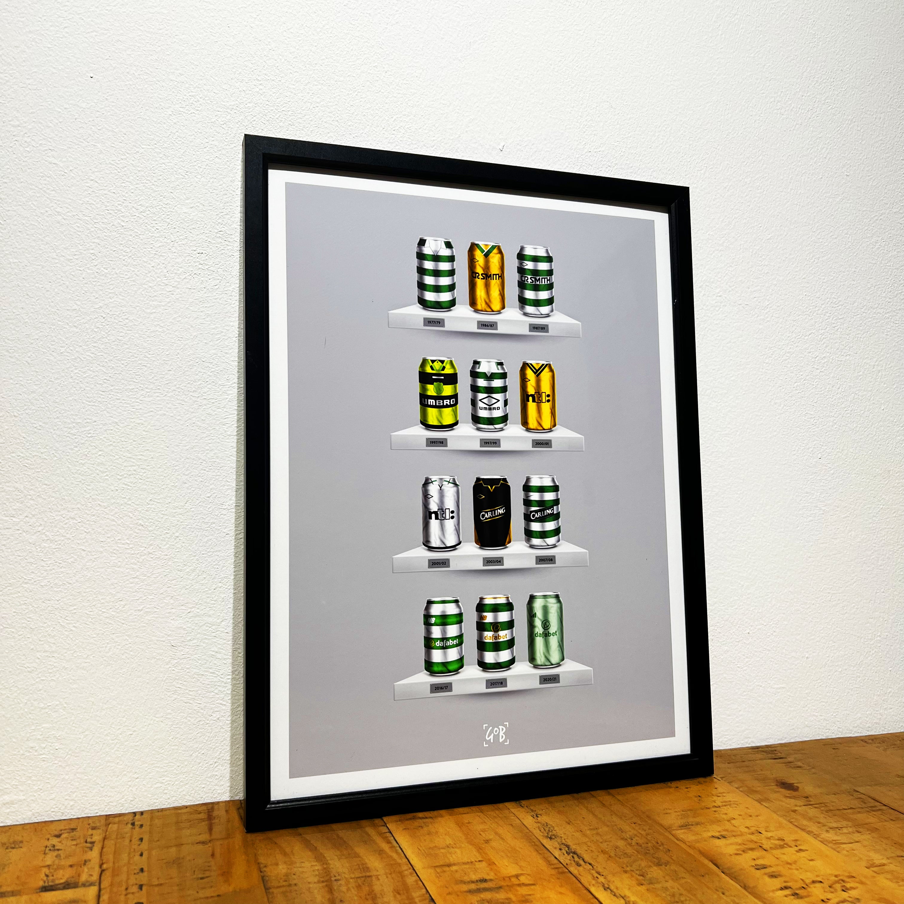 Celebrate legendary football kits from the past few decades, each one digitally illustrated in your choice of our unique can or bottle styles. Printed in high-definition on premium gloss paper, these designs are made to stand out, whether framed or displayed as they are. Also available as a matching T-shirt