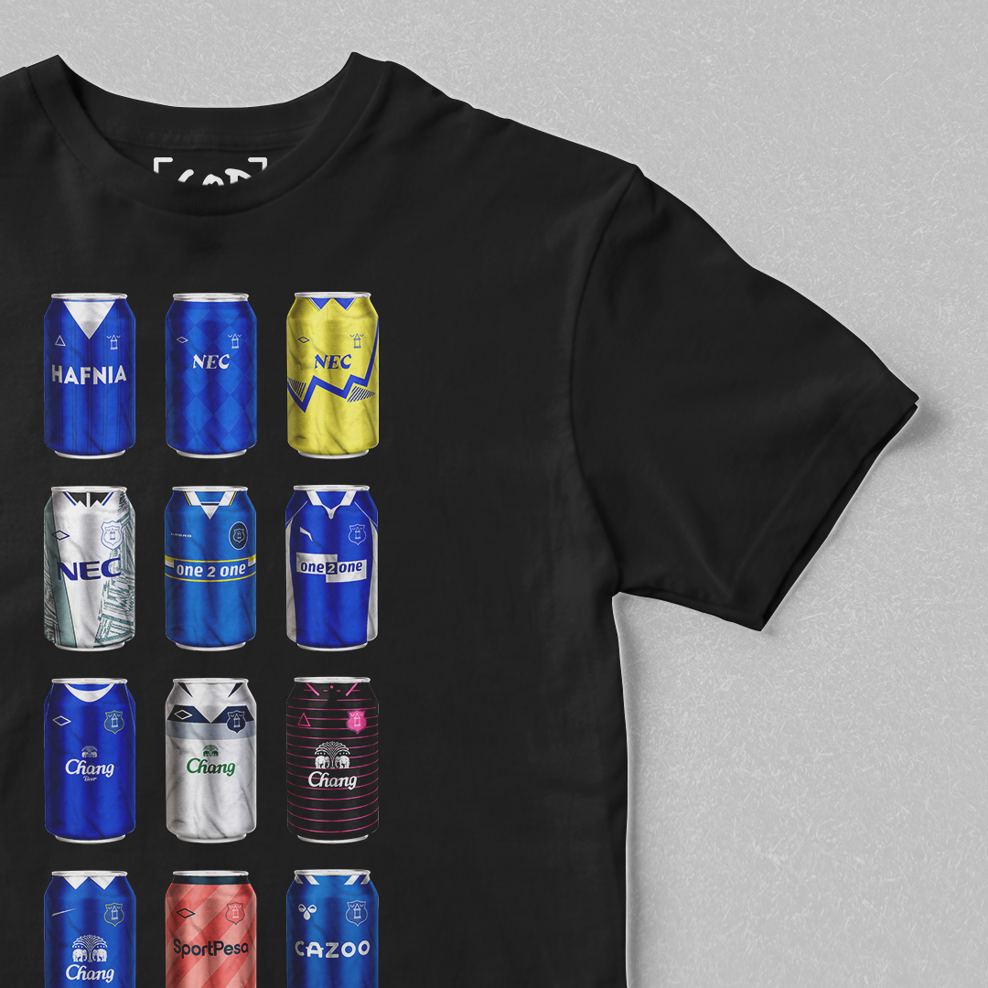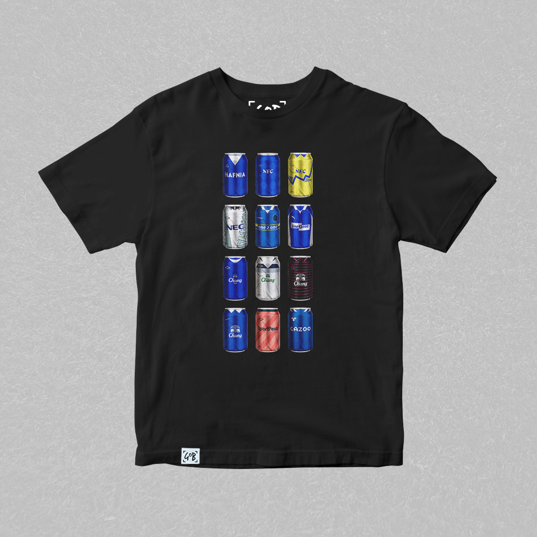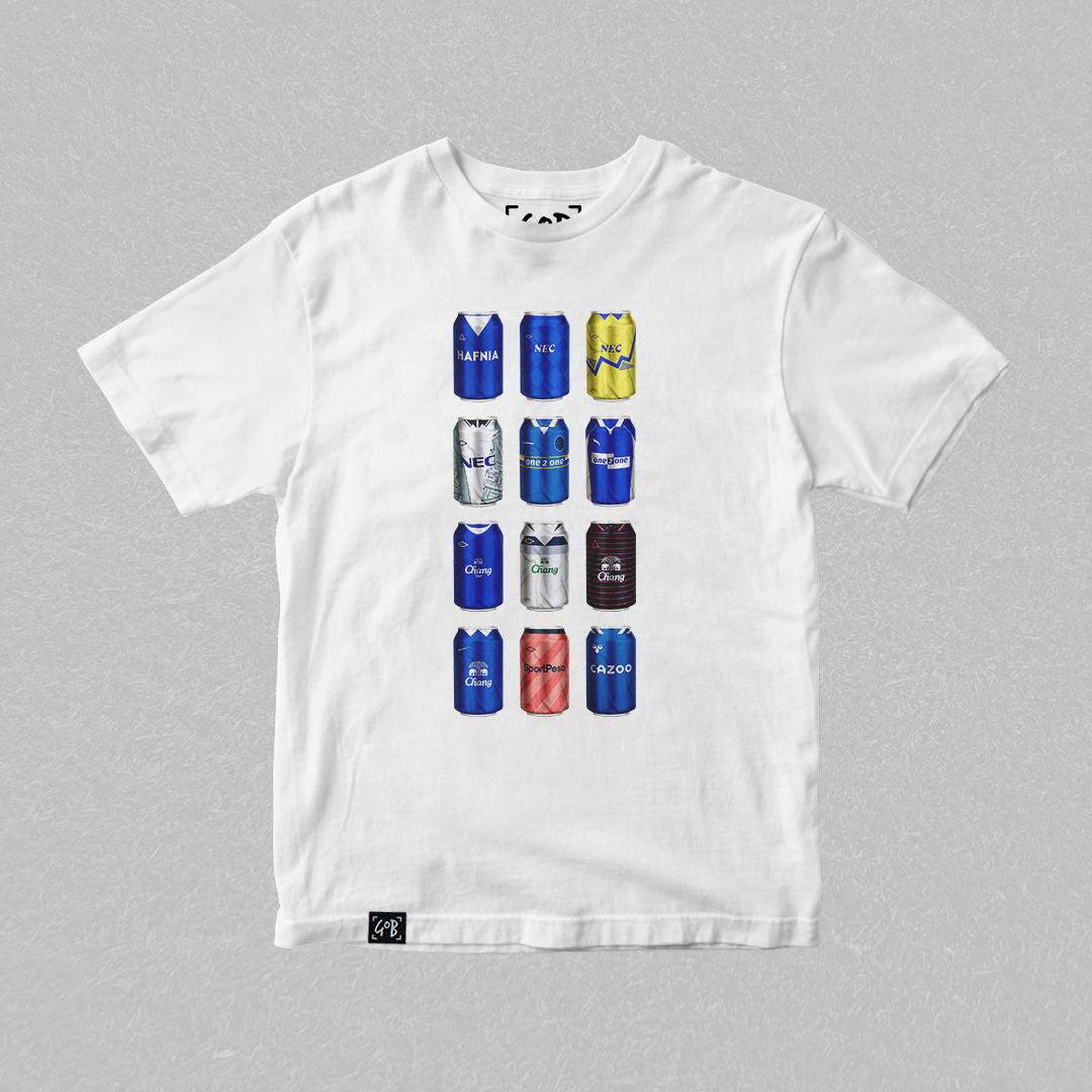 Twelve iconic kits from your club’s past, reimagined as collectible beer cans in a bold, fan-made design. Each can tells a story — of unforgettable goals, cult heroes, and matchdays etched into football history. Crafted for supporters who carry the legacy, this tee is a wearable celebration of heritage, pride, and pints.
