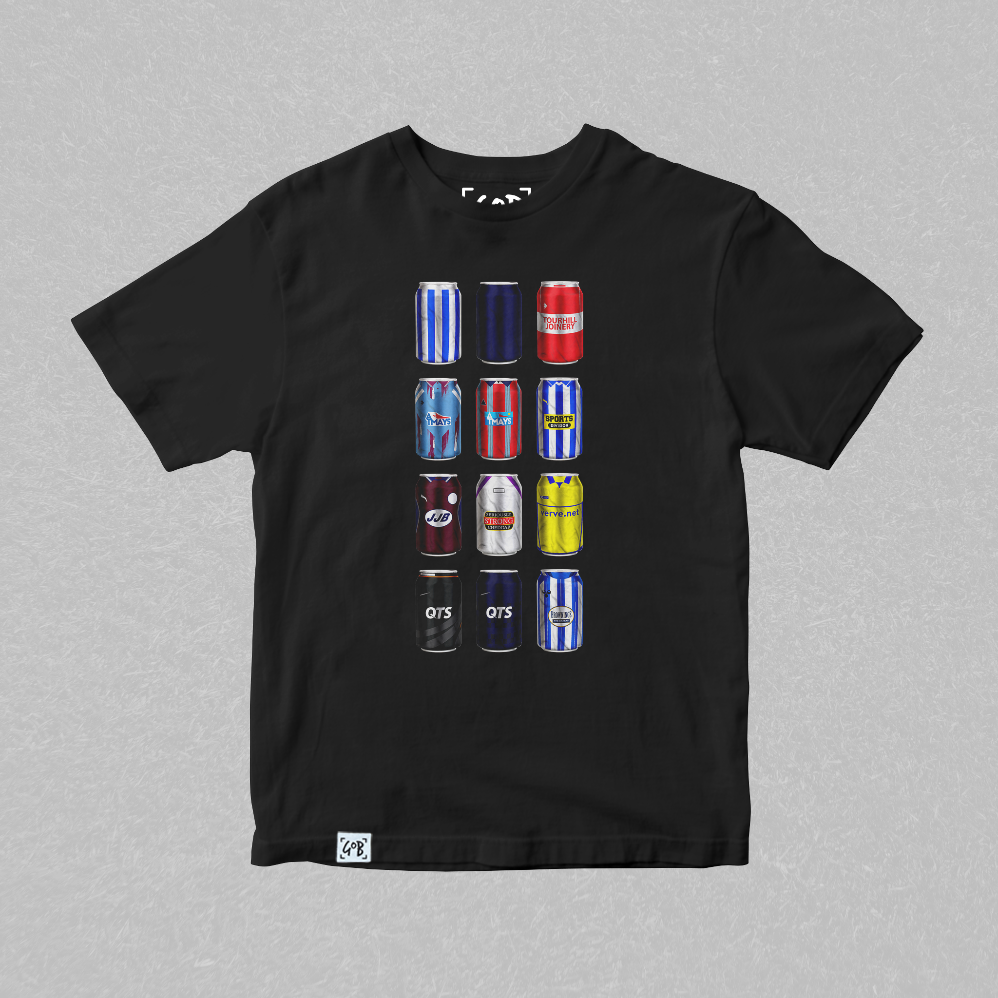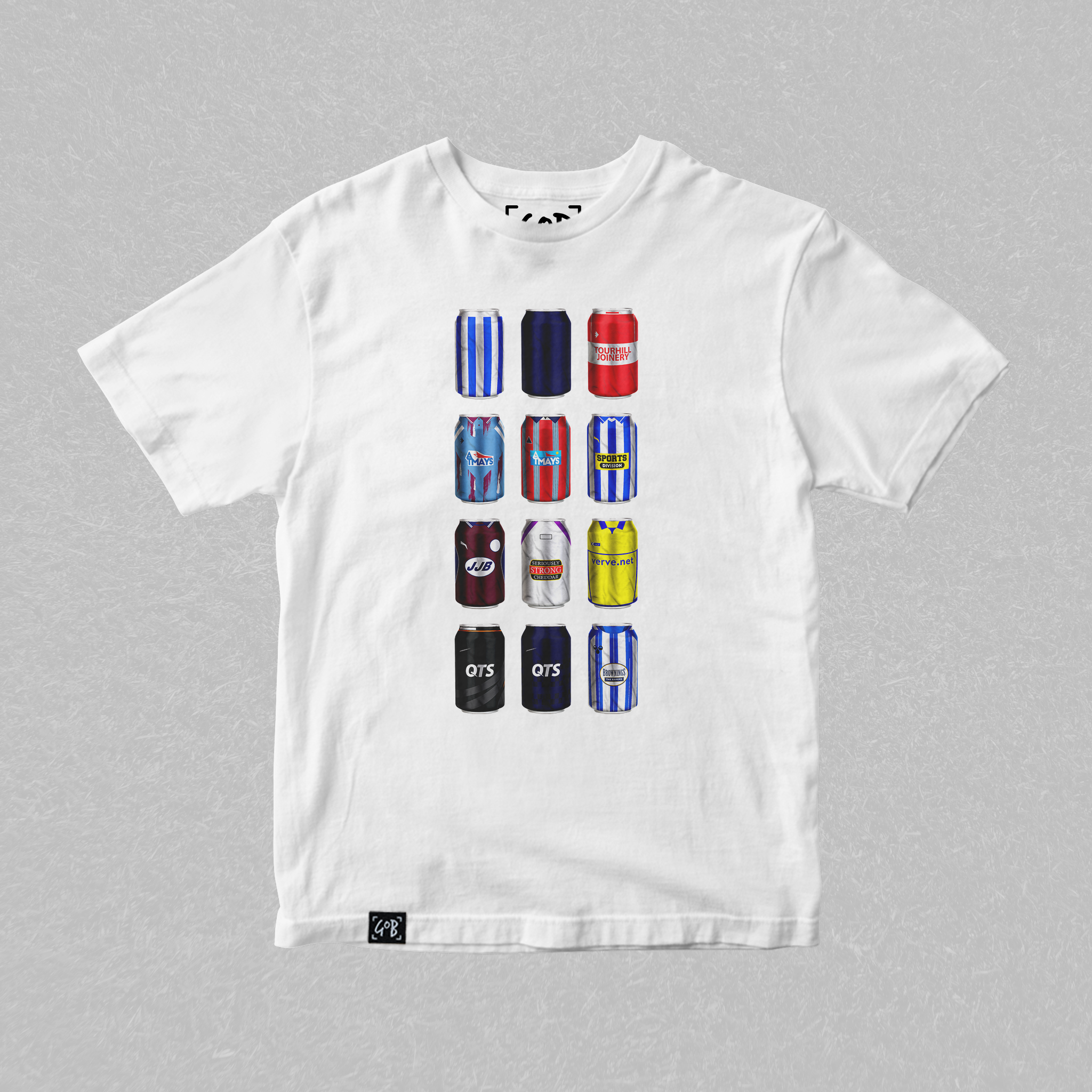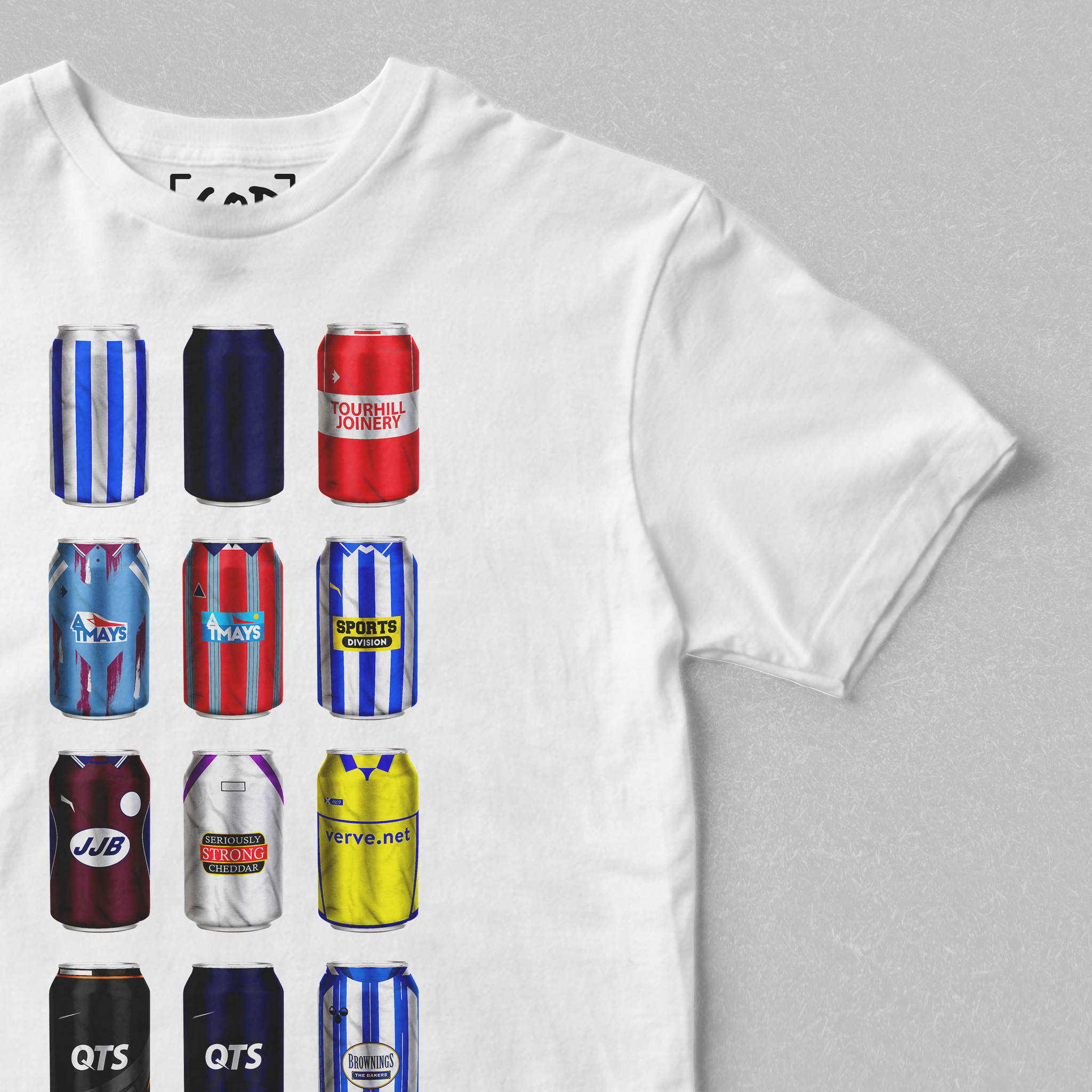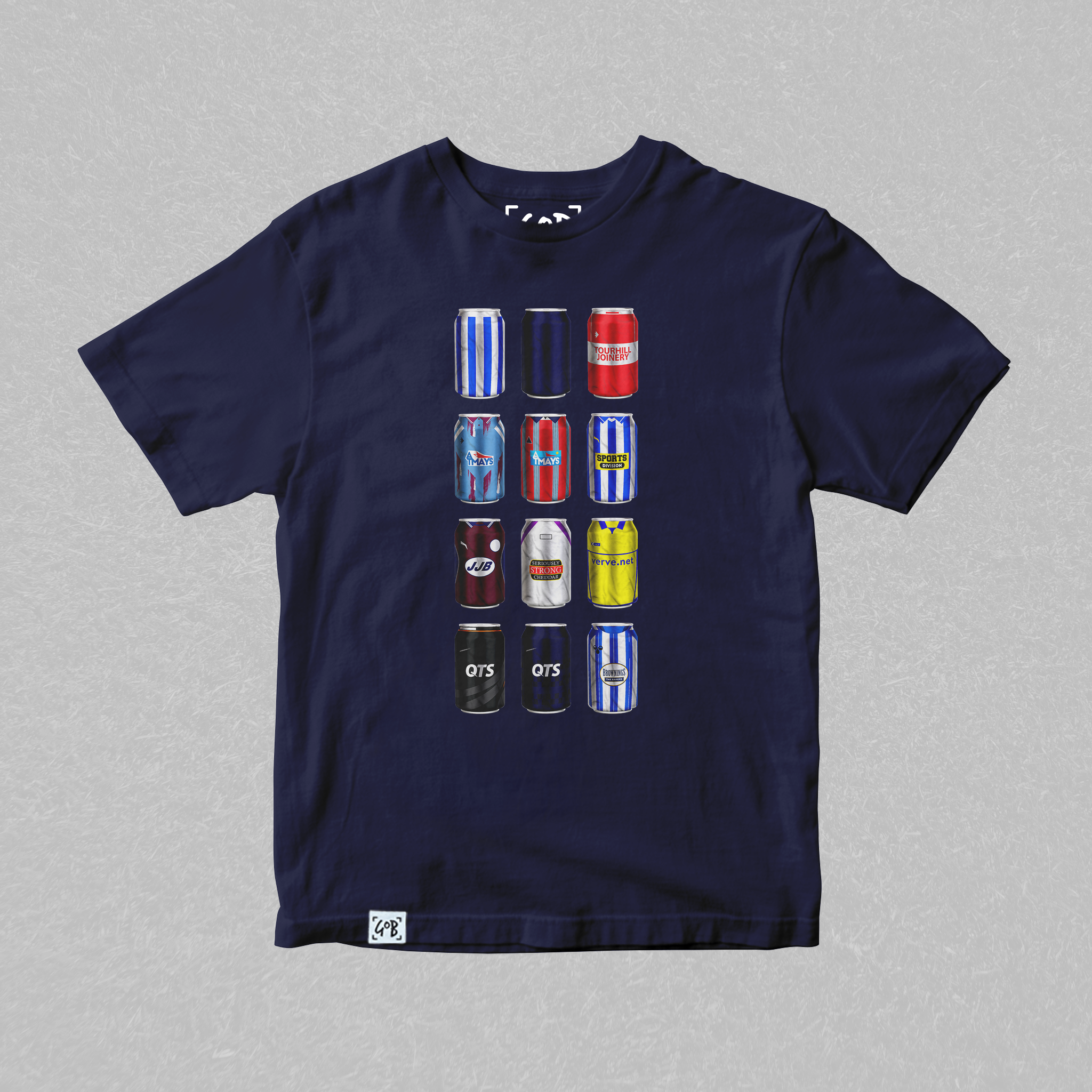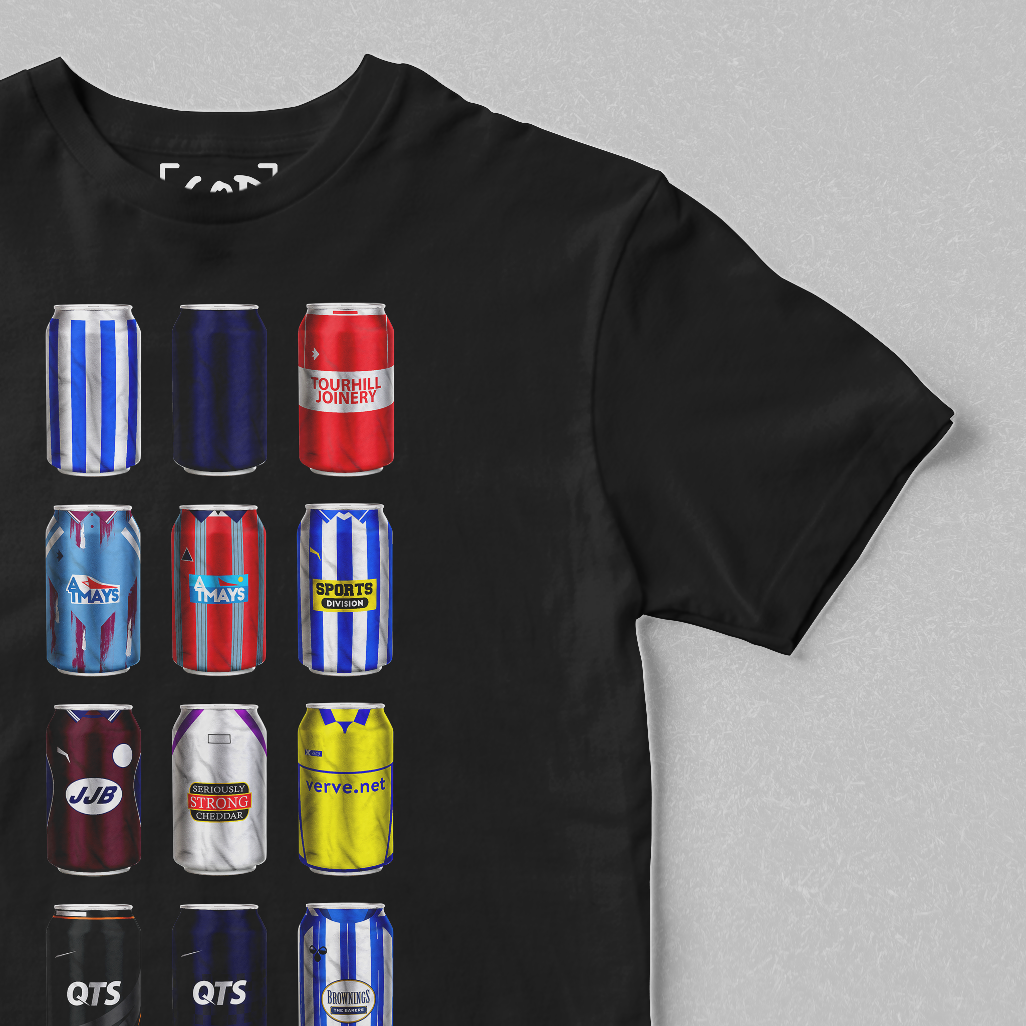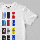 Twelve iconic kits from your club’s past, reimagined as collectible beer cans in a bold, fan-made design. Each can tells a story — of unforgettable goals, cult heroes, and matchdays etched into football history. Crafted for supporters who carry the legacy, this tee is a wearable celebration of heritage, pride, and pints.