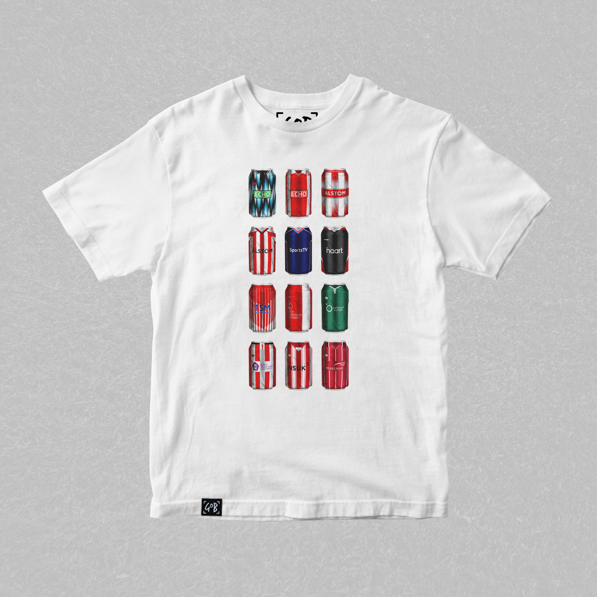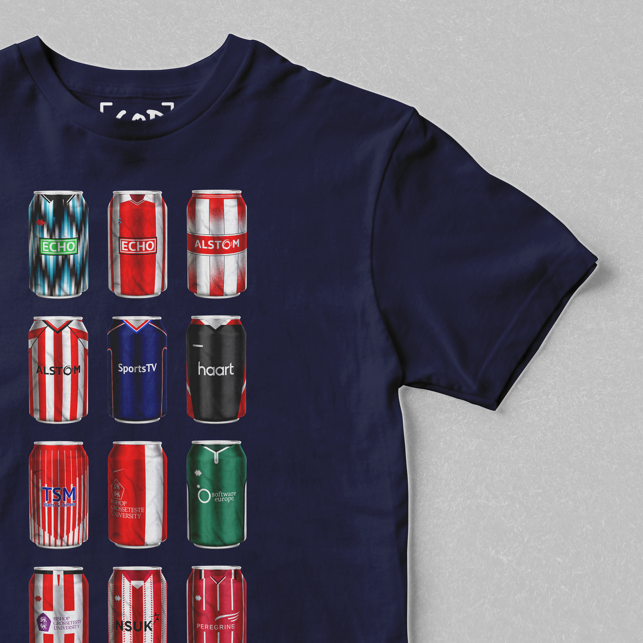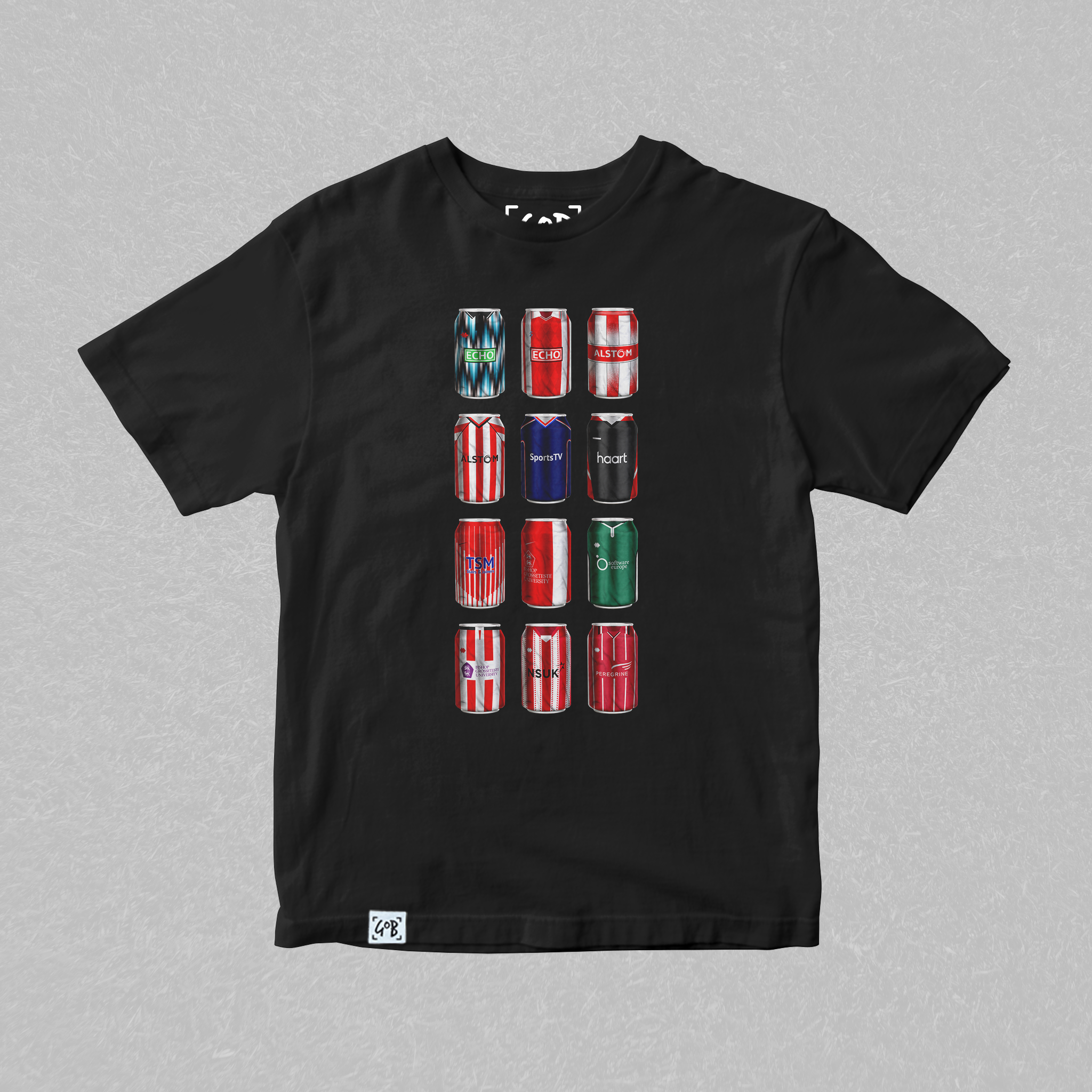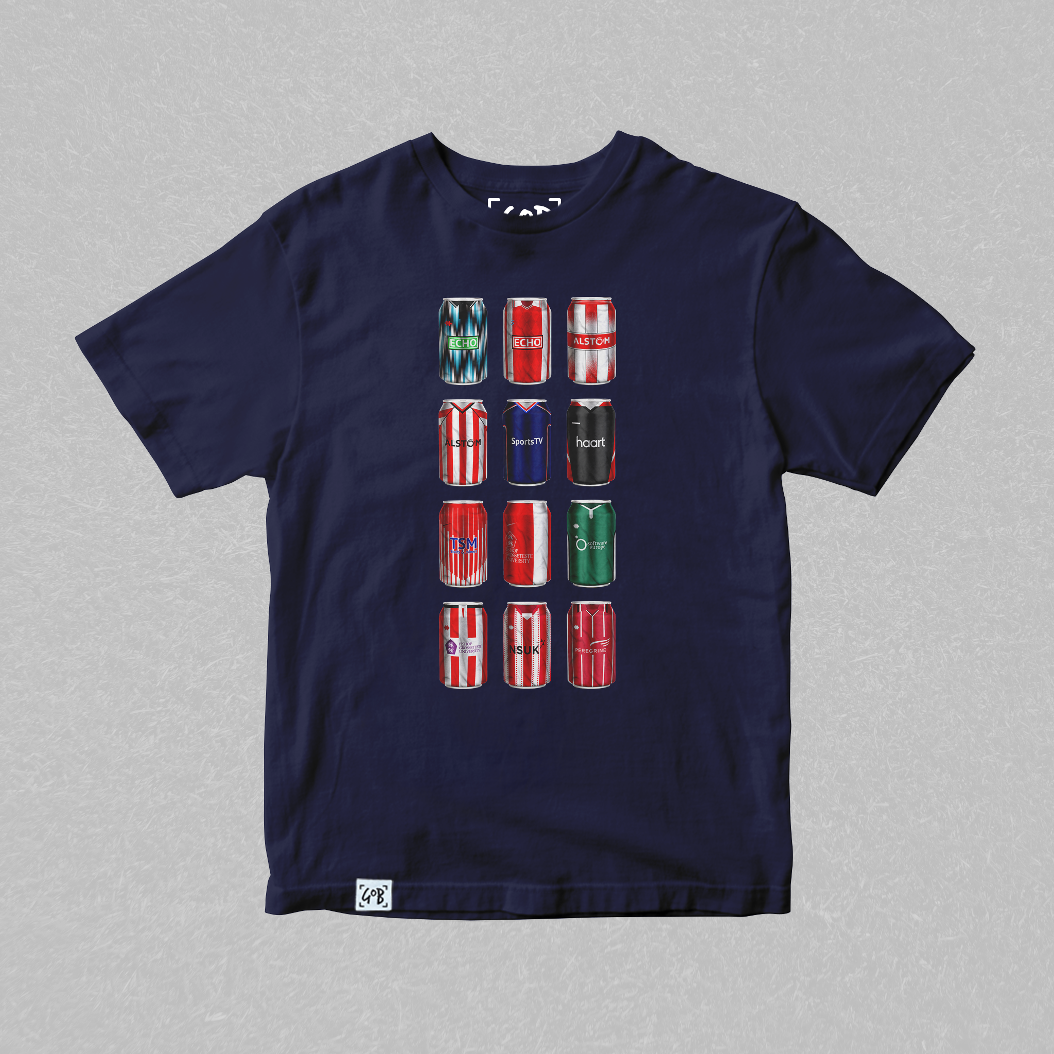 Twelve iconic kits from your club’s past, reimagined as collectible beer cans in a bold, fan-made design. Each can tells a story — of unforgettable goals, cult heroes, and matchdays etched into football history. Crafted for supporters who carry the legacy, this tee is a wearable celebration of heritage, pride, and pints.