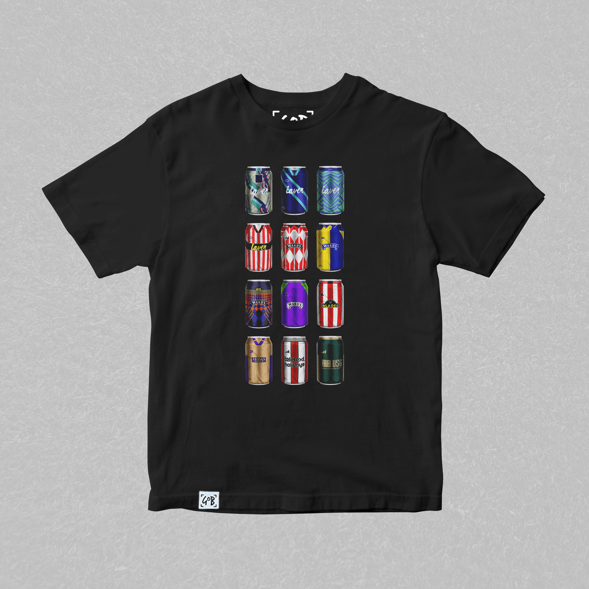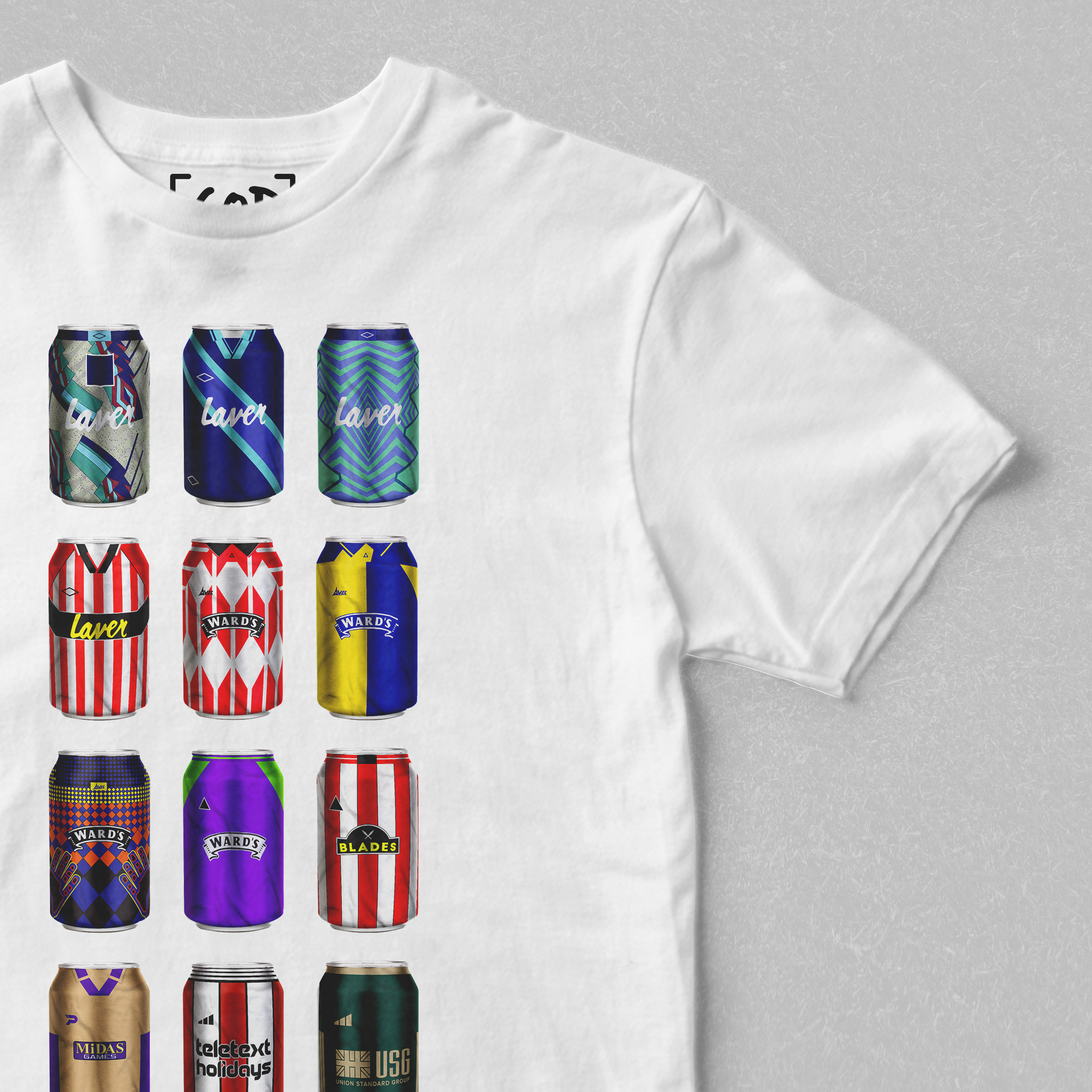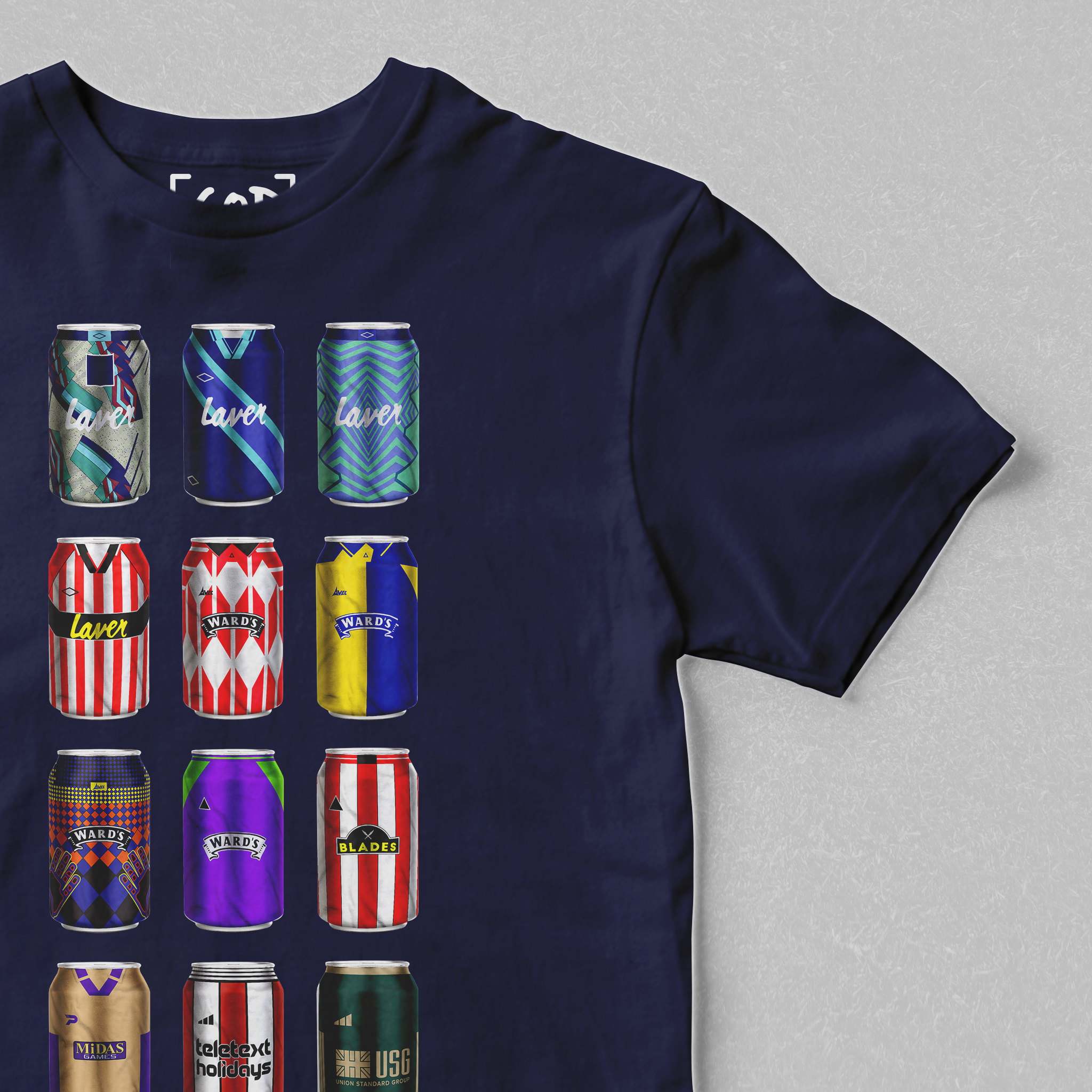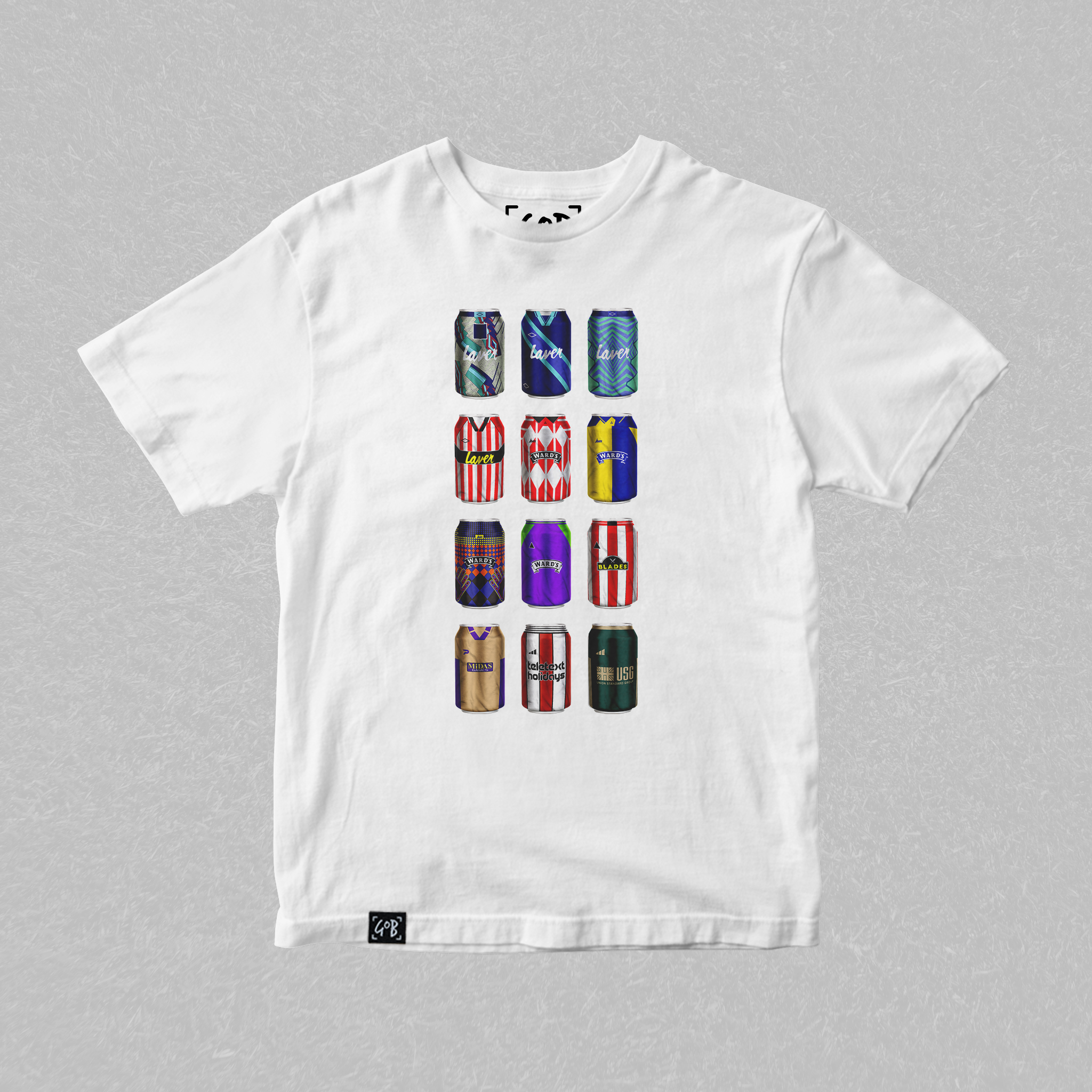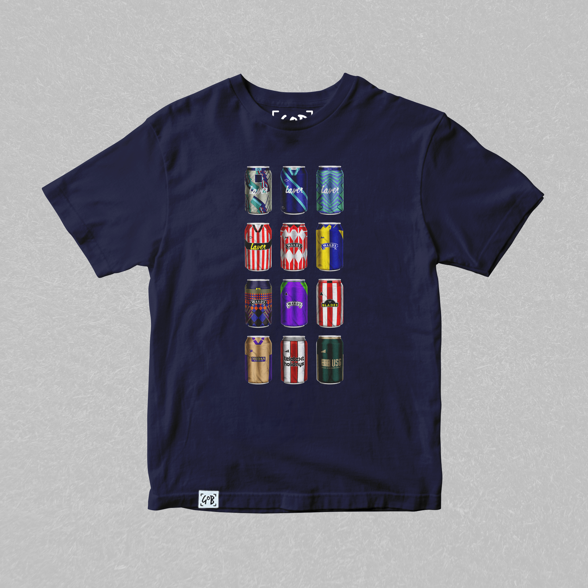 Twelve iconic kits from your club’s past, reimagined as collectible beer cans in a bold, fan-made design. Each can tells a story — of unforgettable goals, cult heroes, and matchdays etched into football history. Crafted for supporters who carry the legacy, this tee is a wearable celebration of heritage, pride, and pints.