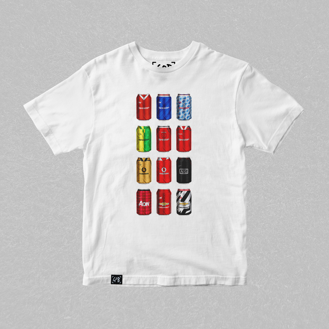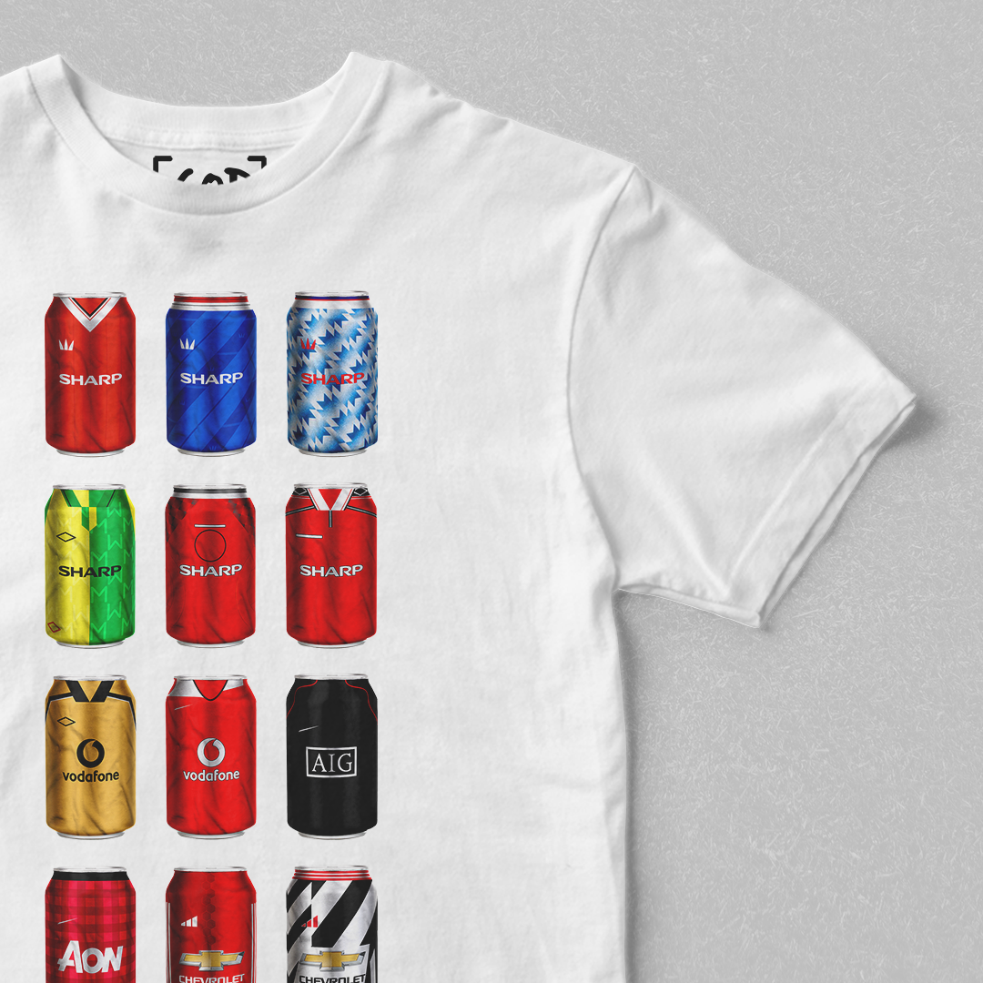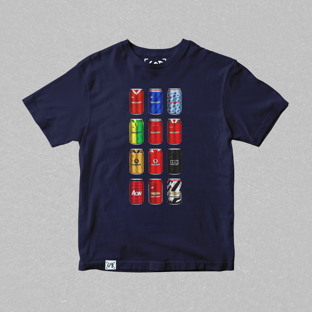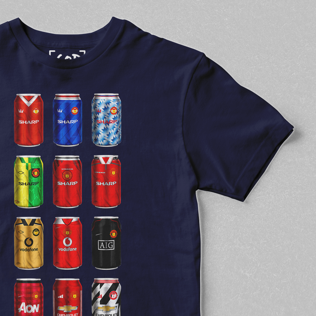 Twelve iconic kits from your club’s past, reimagined as collectible beer cans in a bold, fan-made design. Each can tells a story — of unforgettable goals, cult heroes, and matchdays etched into football history. Crafted for supporters who carry the legacy, this tee is a wearable celebration of heritage, pride, and pints.