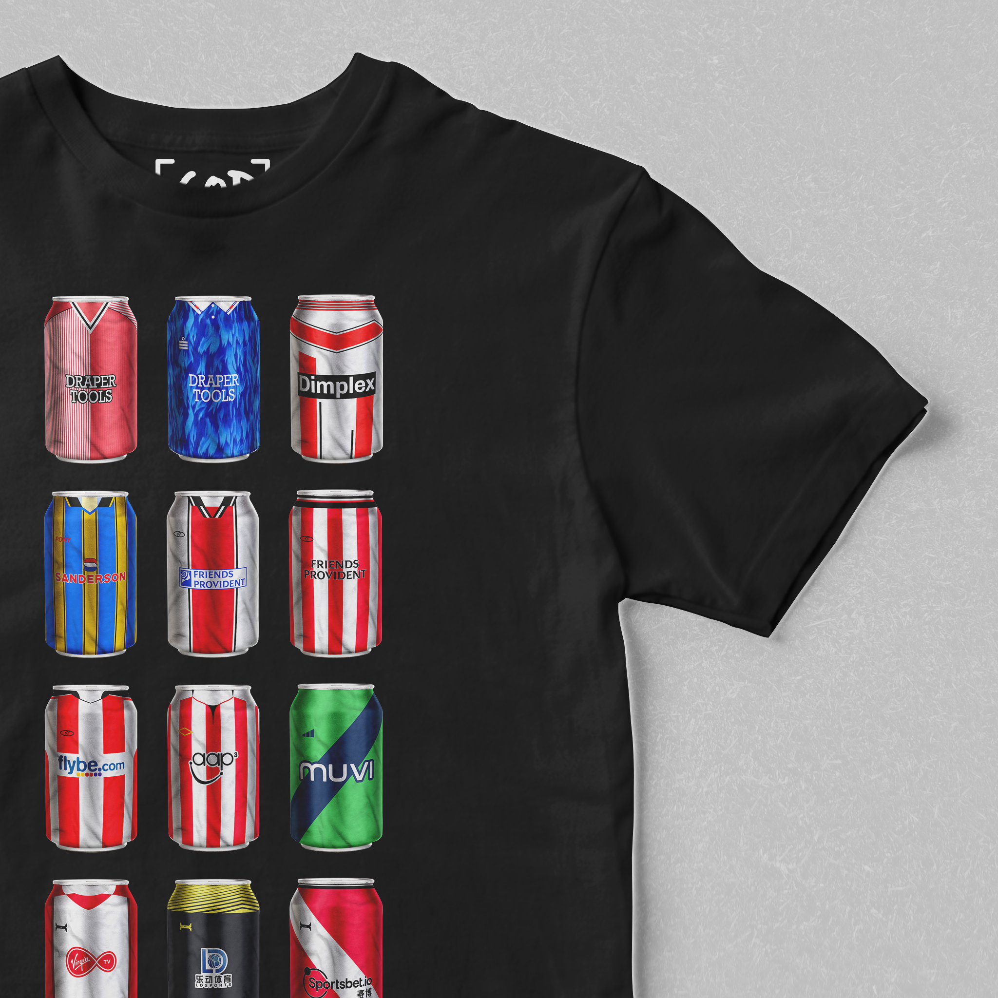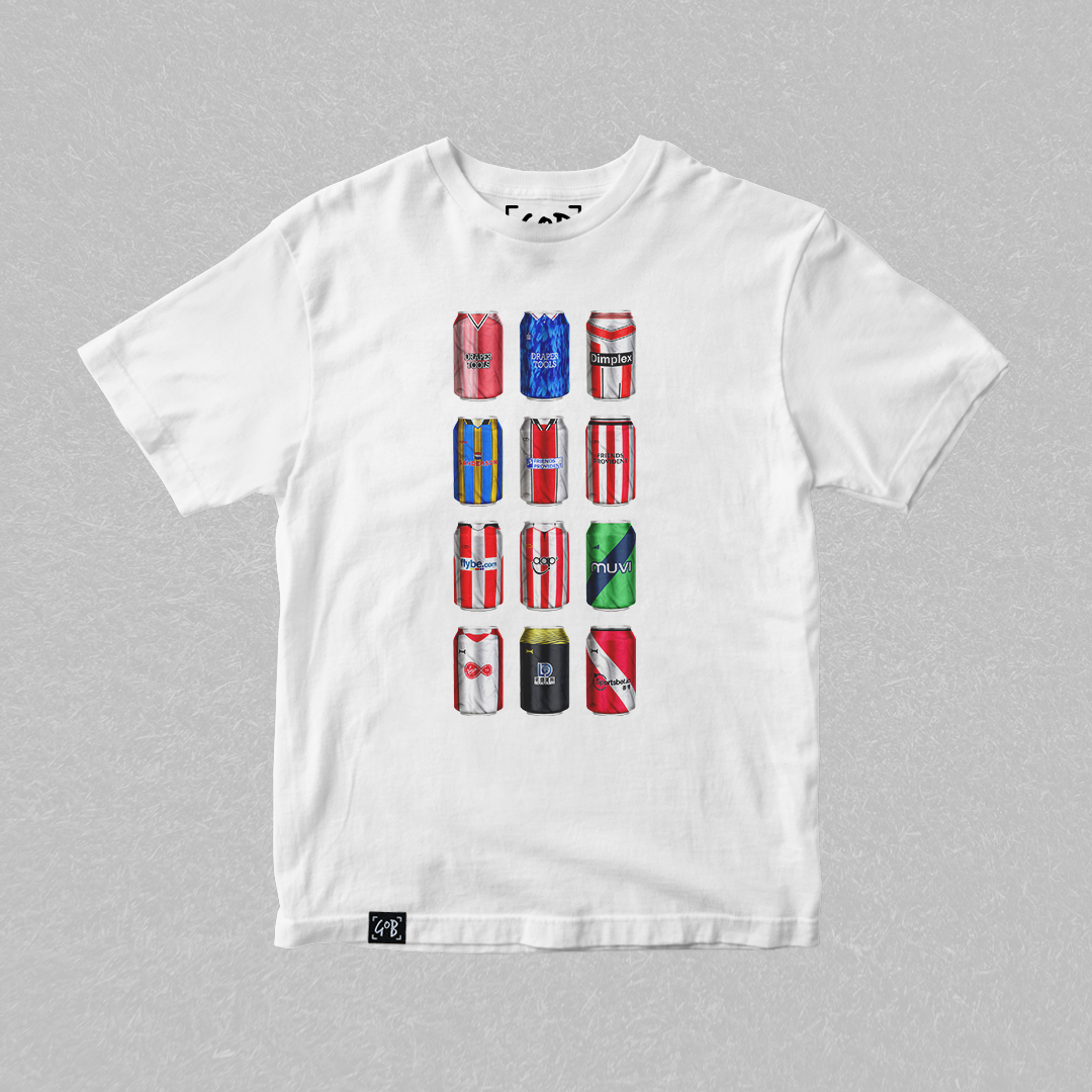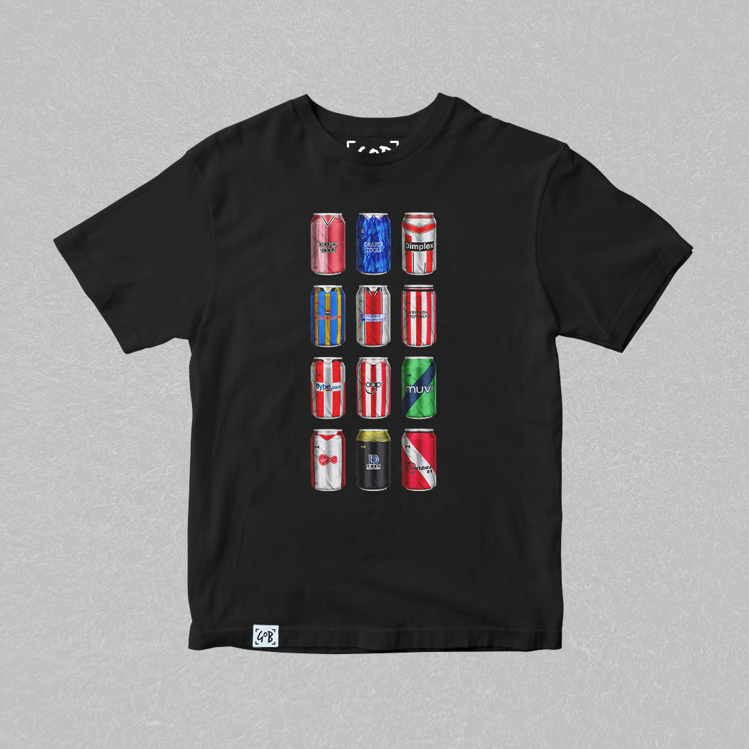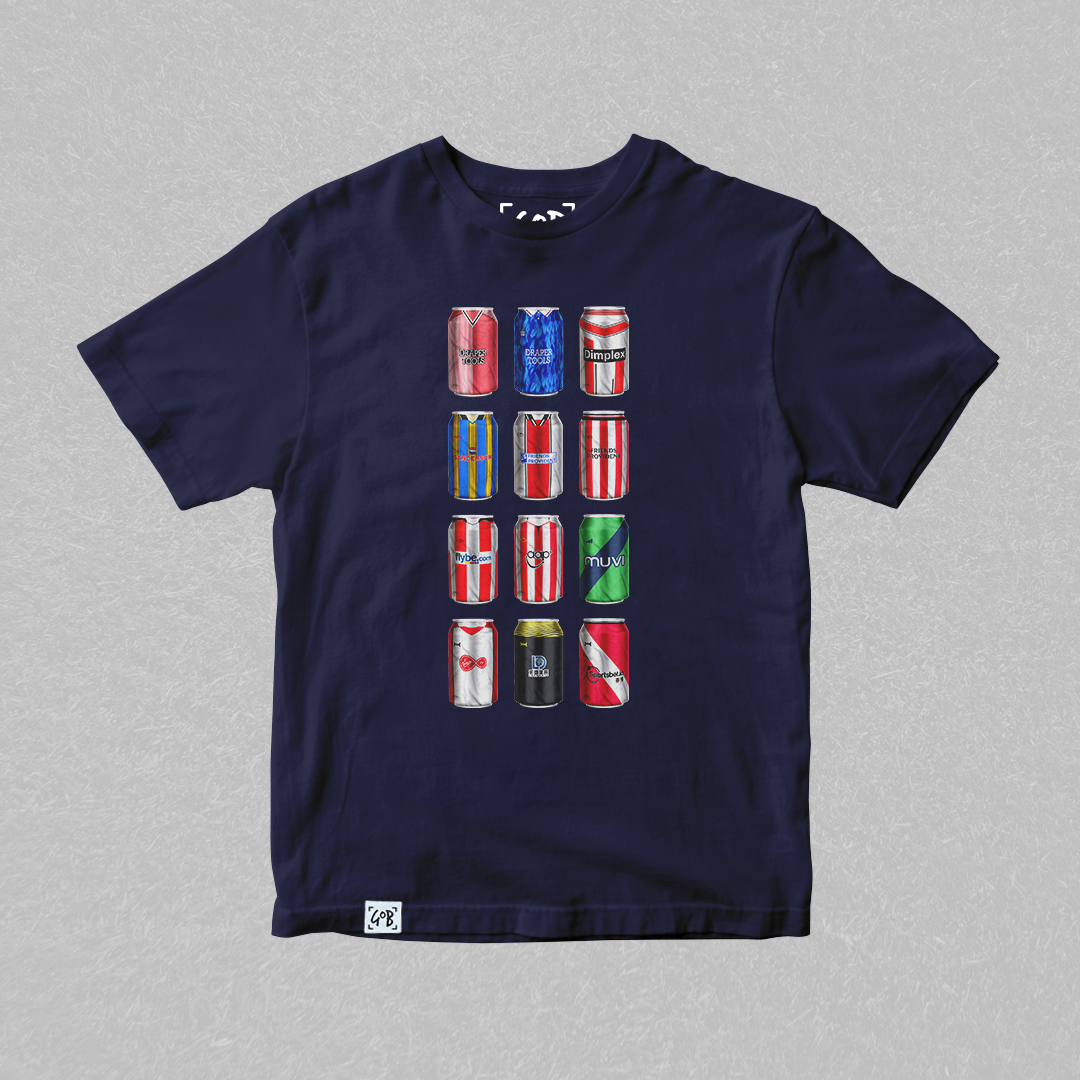 Twelve iconic kits from your club’s past, reimagined as collectible beer cans in a bold, fan-made design. Each can tells a story — of unforgettable goals, cult heroes, and matchdays etched into football history. Crafted for supporters who carry the legacy, this tee is a wearable celebration of heritage, pride, and pints.