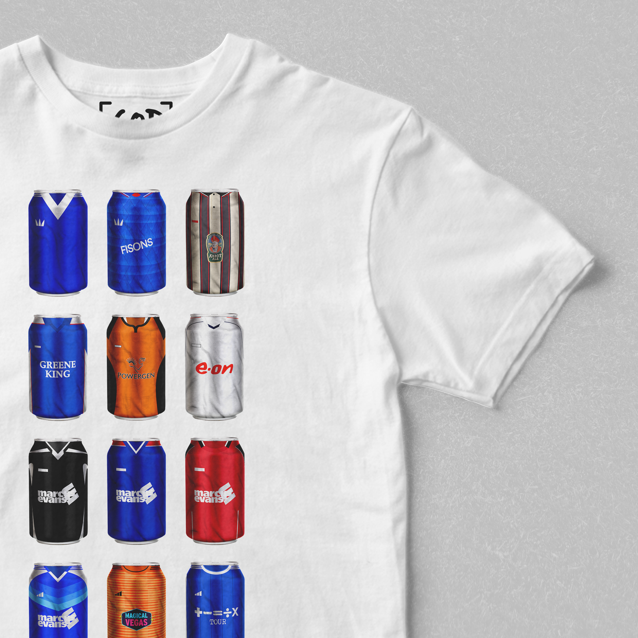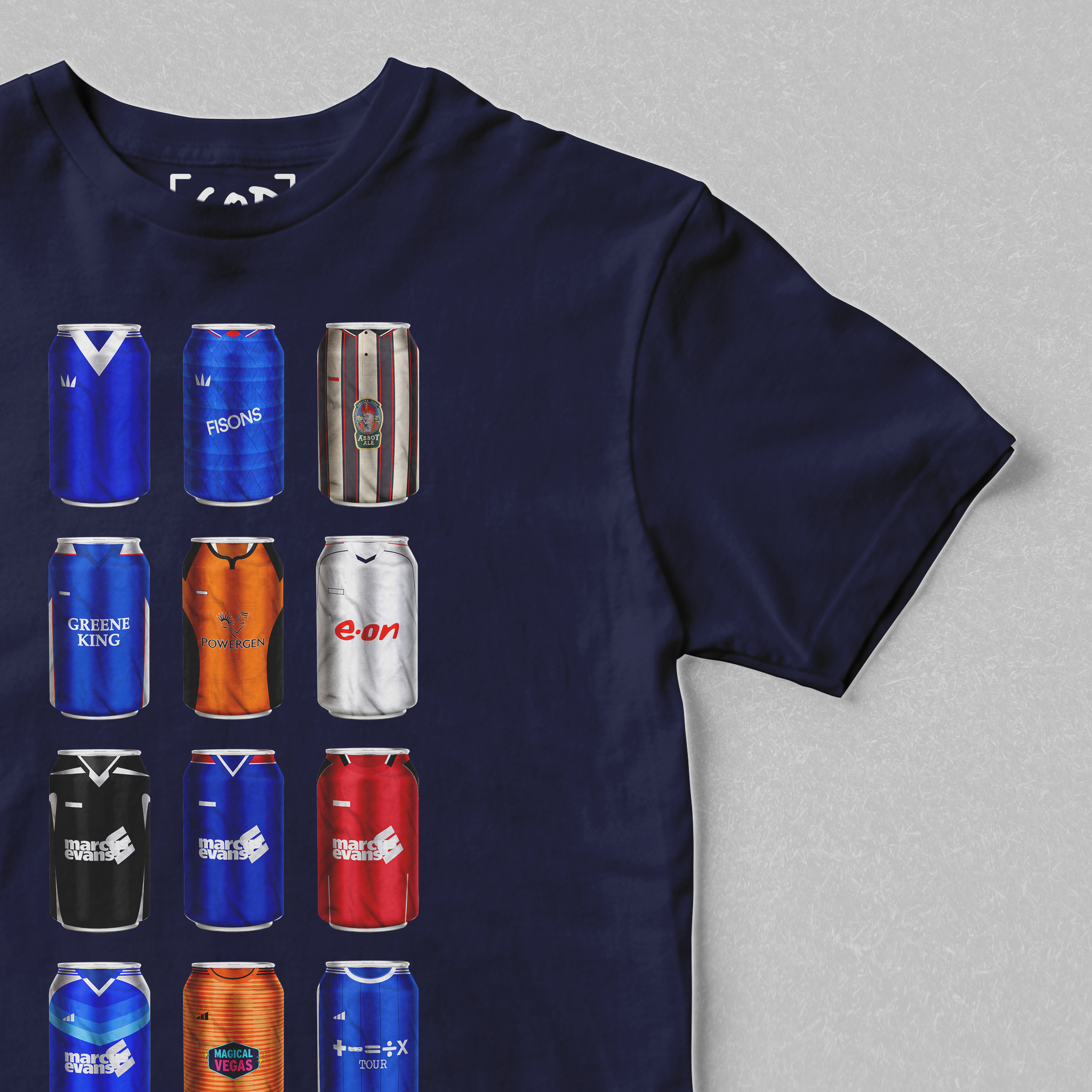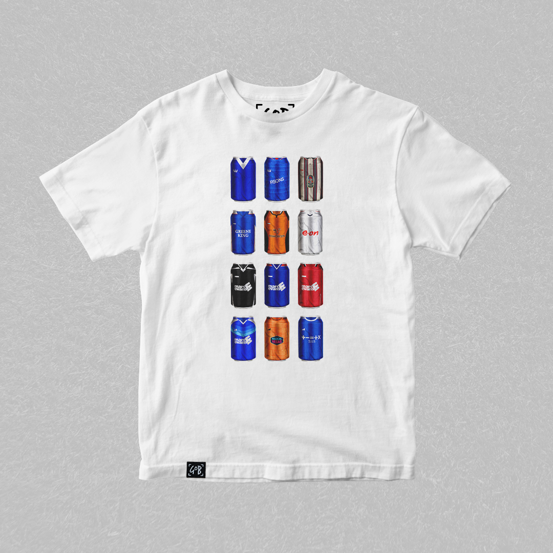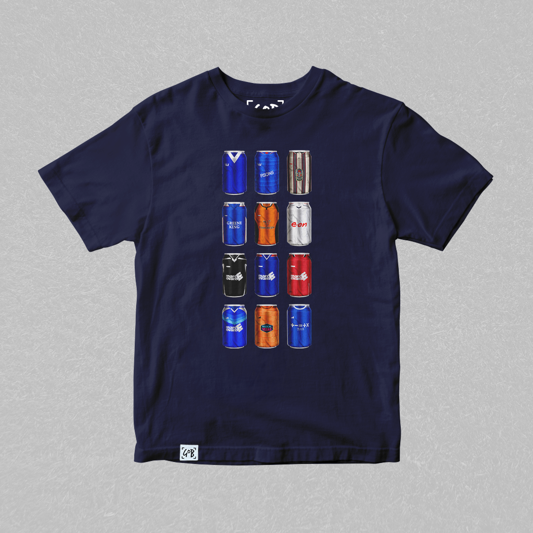 Twelve iconic kits from your club’s past, reimagined as collectible beer cans in a bold, fan-made design. Each can tells a story — of unforgettable goals, cult heroes, and matchdays etched into football history. Crafted for supporters who carry the legacy, this tee is a wearable celebration of heritage, pride, and pints.