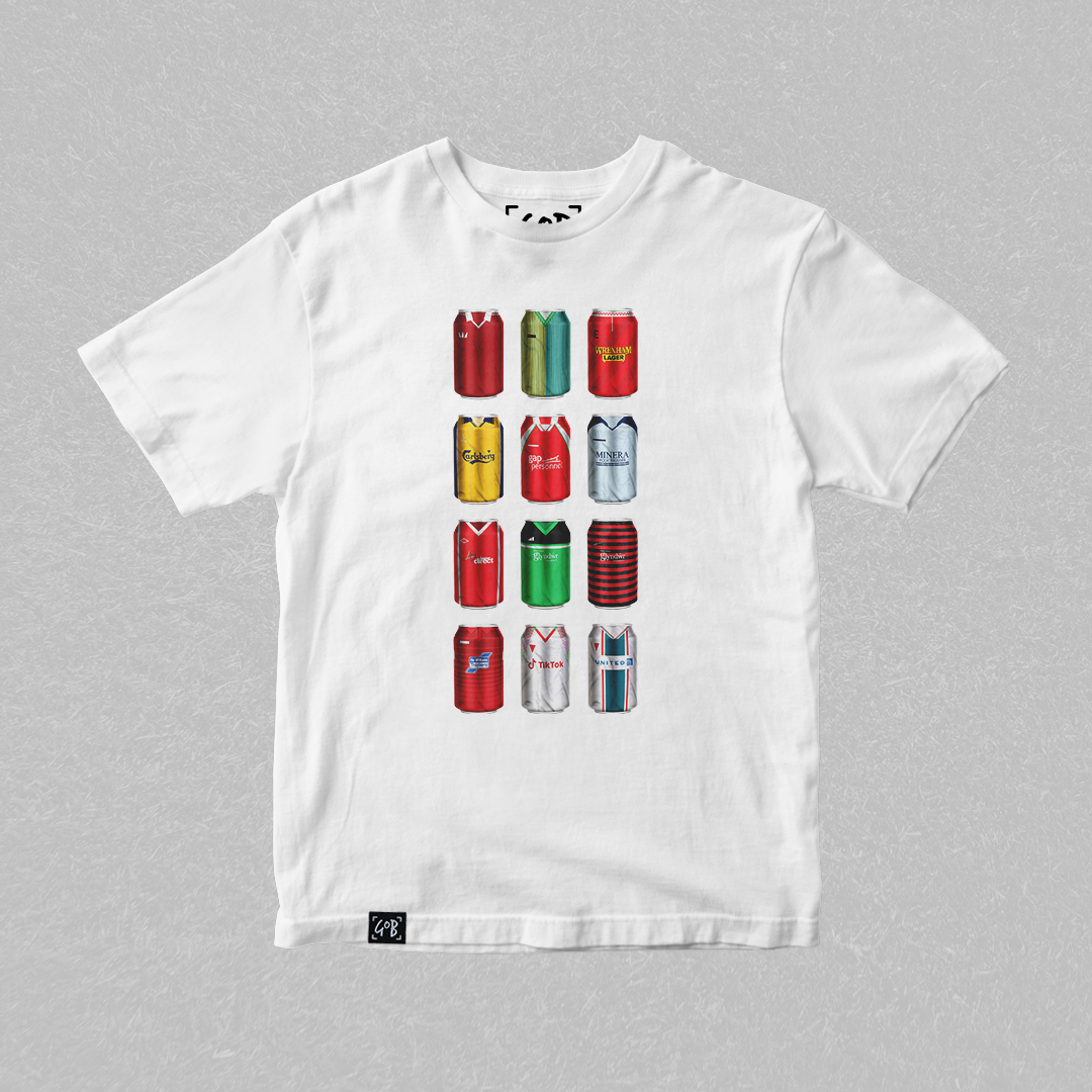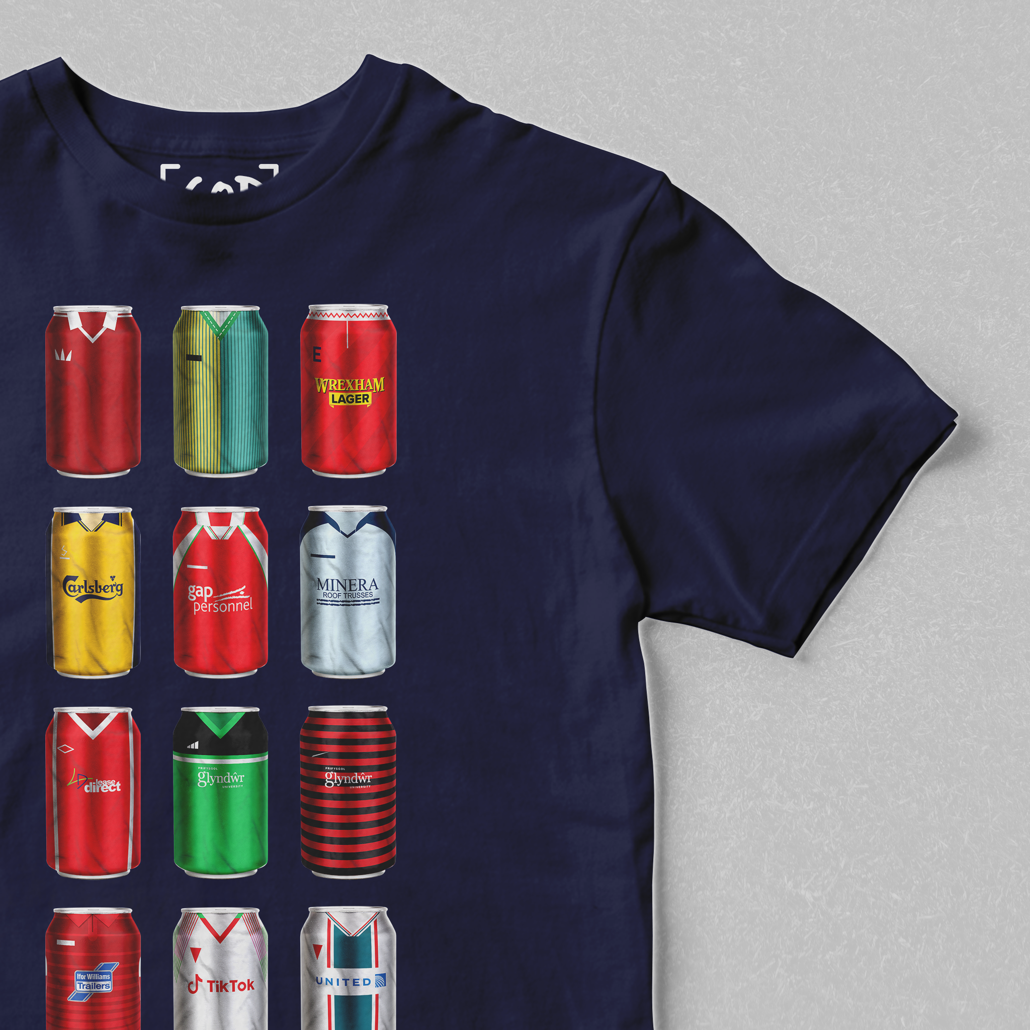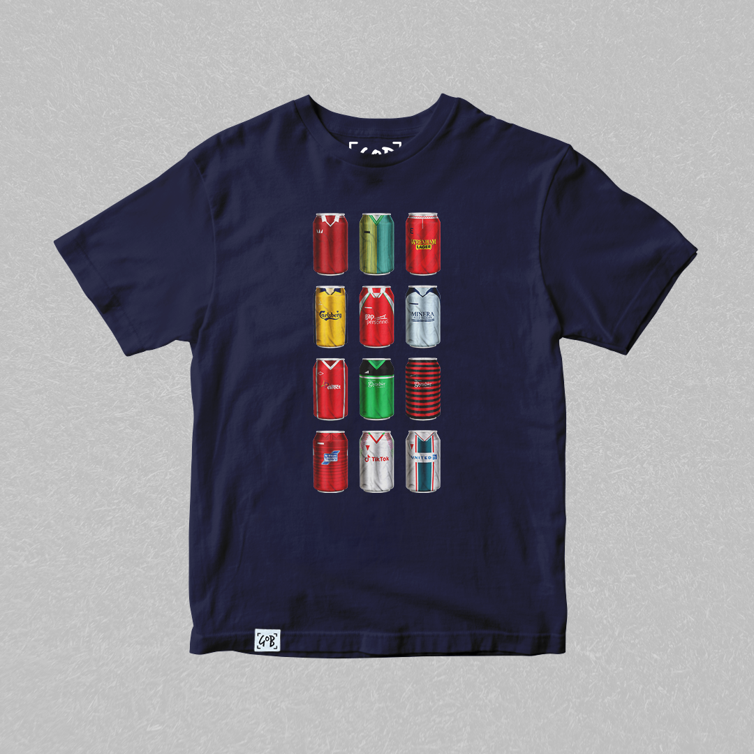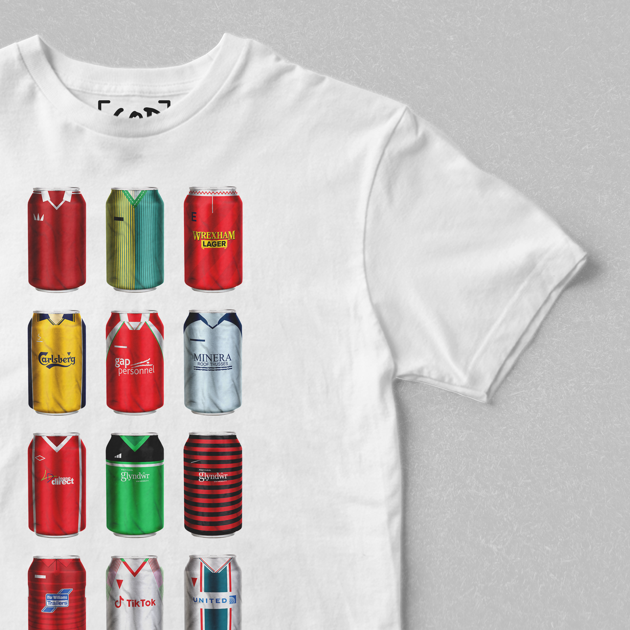 Twelve iconic kits from your club’s past, reimagined as collectible beer cans in a bold, fan-made design. Each can tells a story — of unforgettable goals, cult heroes, and matchdays etched into football history. Crafted for supporters who carry the legacy, this tee is a wearable celebration of heritage, pride, and pints.