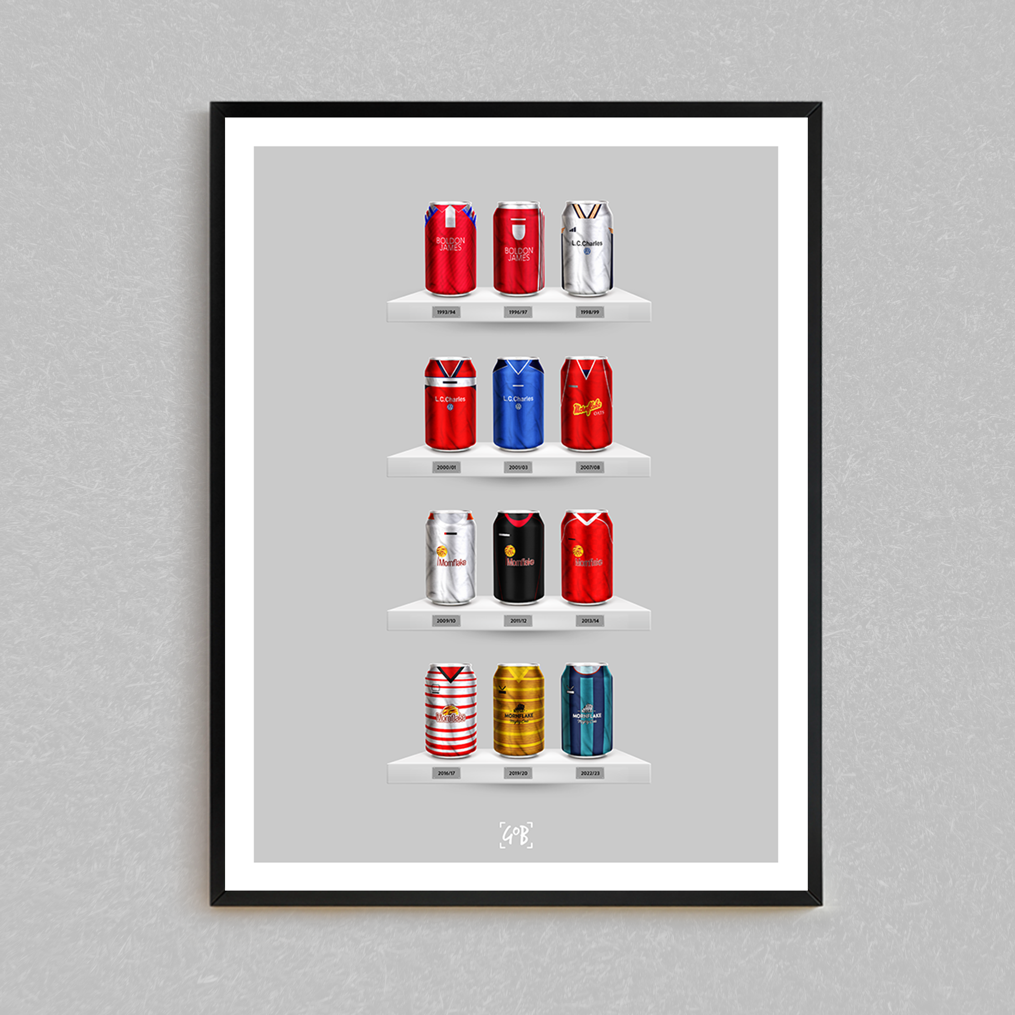 Celebrate legendary football kits from the past few decades, each one digitally illustrated in your choice of our unique can or bottle styles. Printed in high-definition on premium gloss paper, these designs are made to stand out, whether framed or displayed as they are. Also available as a matching T-shirt