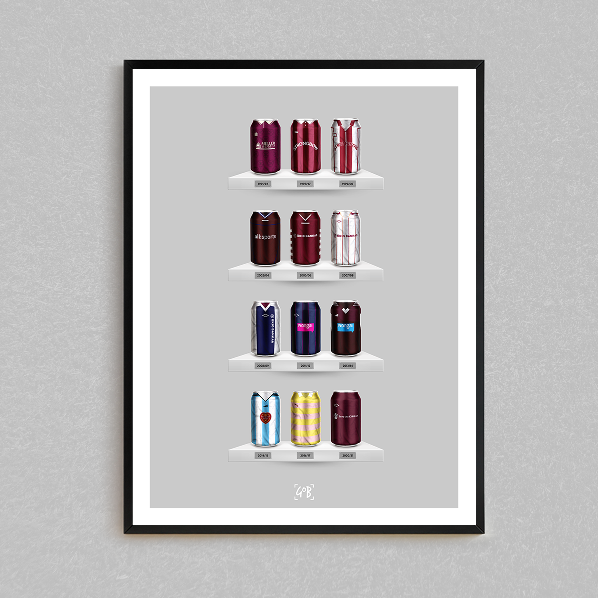 Celebrate legendary football kits from the past few decades, each one digitally illustrated in your choice of our unique can or bottle styles. Printed in high-definition on premium gloss paper, these designs are made to stand out, whether framed or displayed as they are. Also available as a matching T-shirt