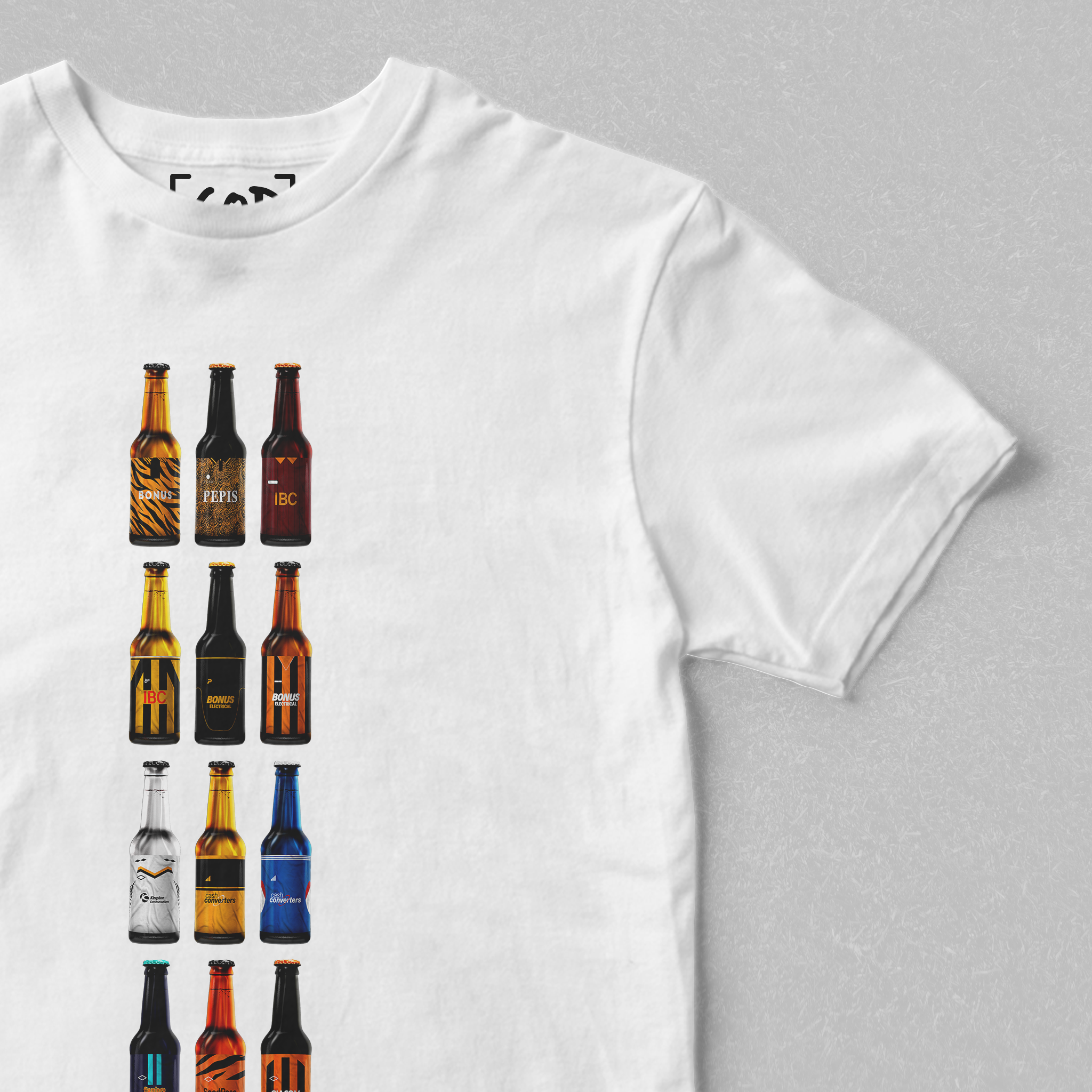 Twelve iconic kits from your club’s past, reimagined as collectible beer bottles in a bold, fan-made design. Each bottle tells a story — of unforgettable goals, cult heroes, and matchdays etched into football history. Crafted for supporters who carry the legacy, this tee is a wearable celebration of heritage, pride, and pints.