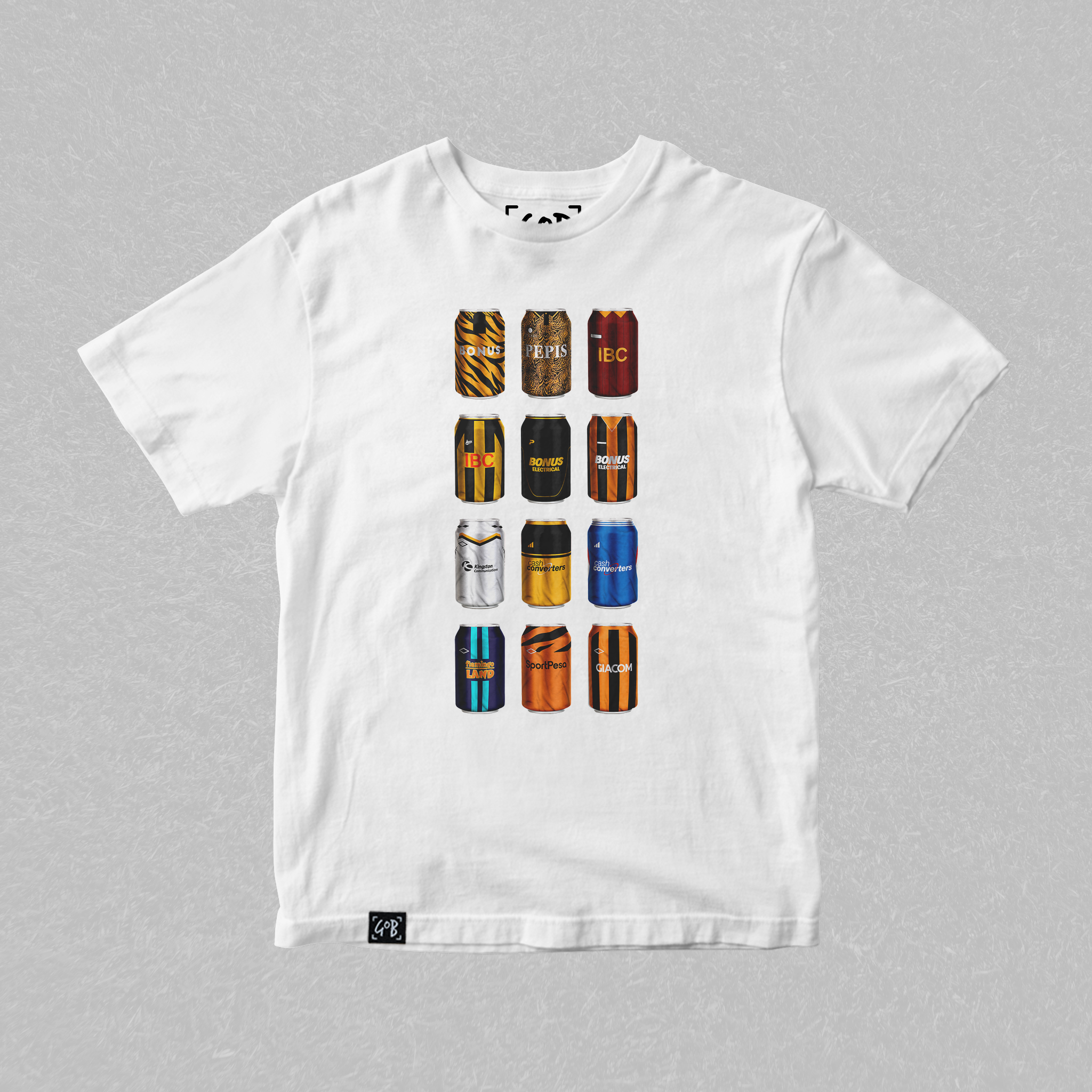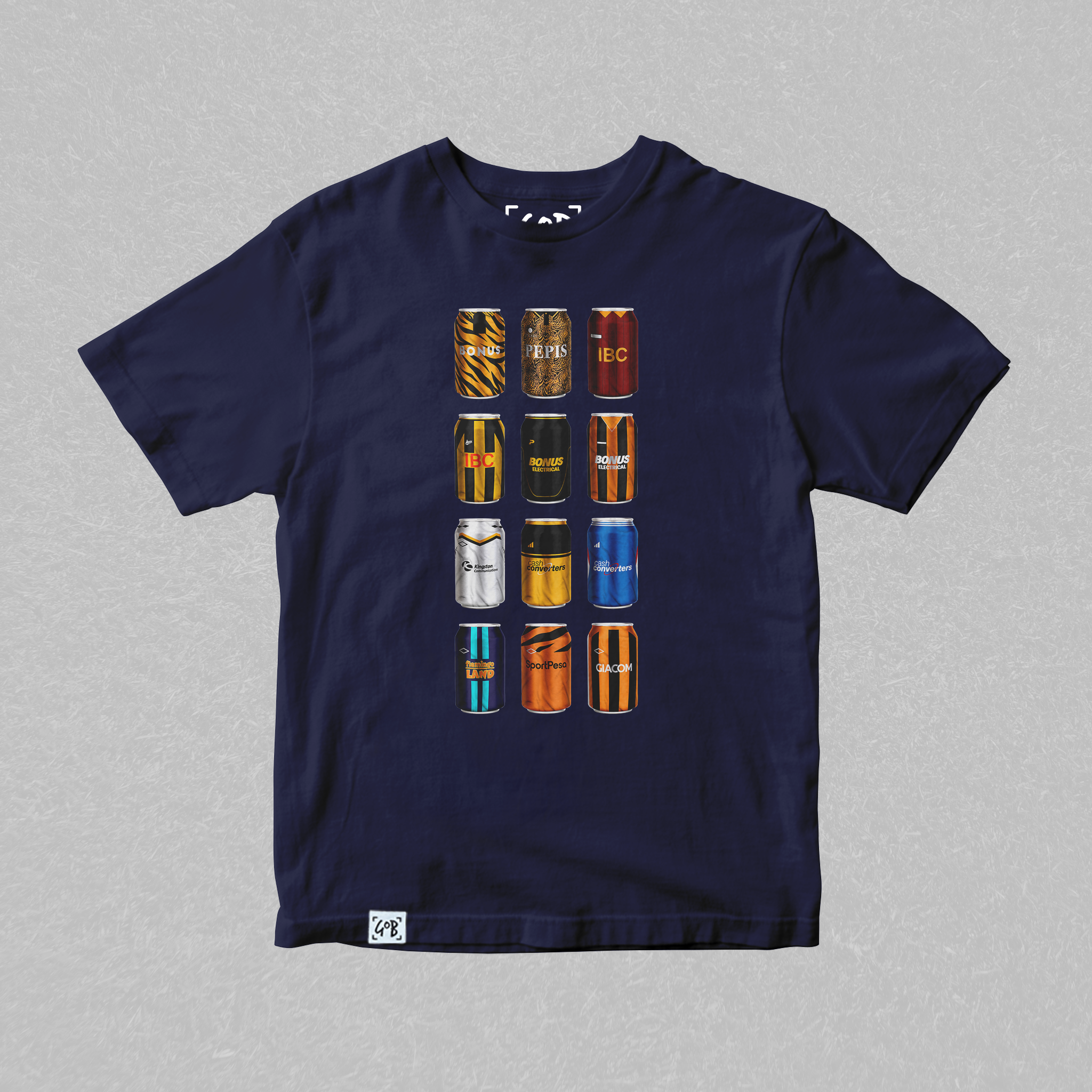 Twelve iconic kits from your club’s past, reimagined as collectible beer cans in a bold, fan-made design. Each can tells a story — of unforgettable goals, cult heroes, and matchdays etched into football history. Crafted for supporters who carry the legacy, this tee is a wearable celebration of heritage, pride, and pints.