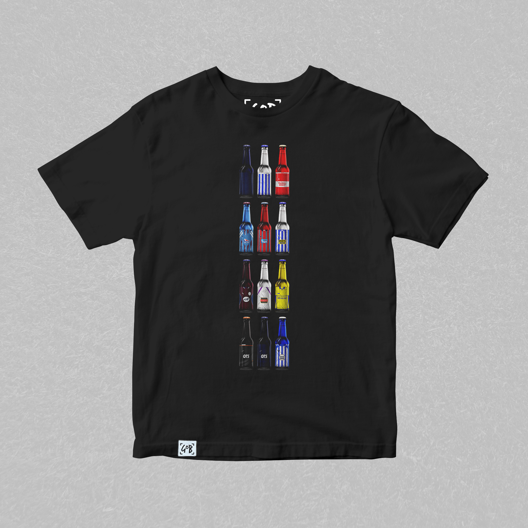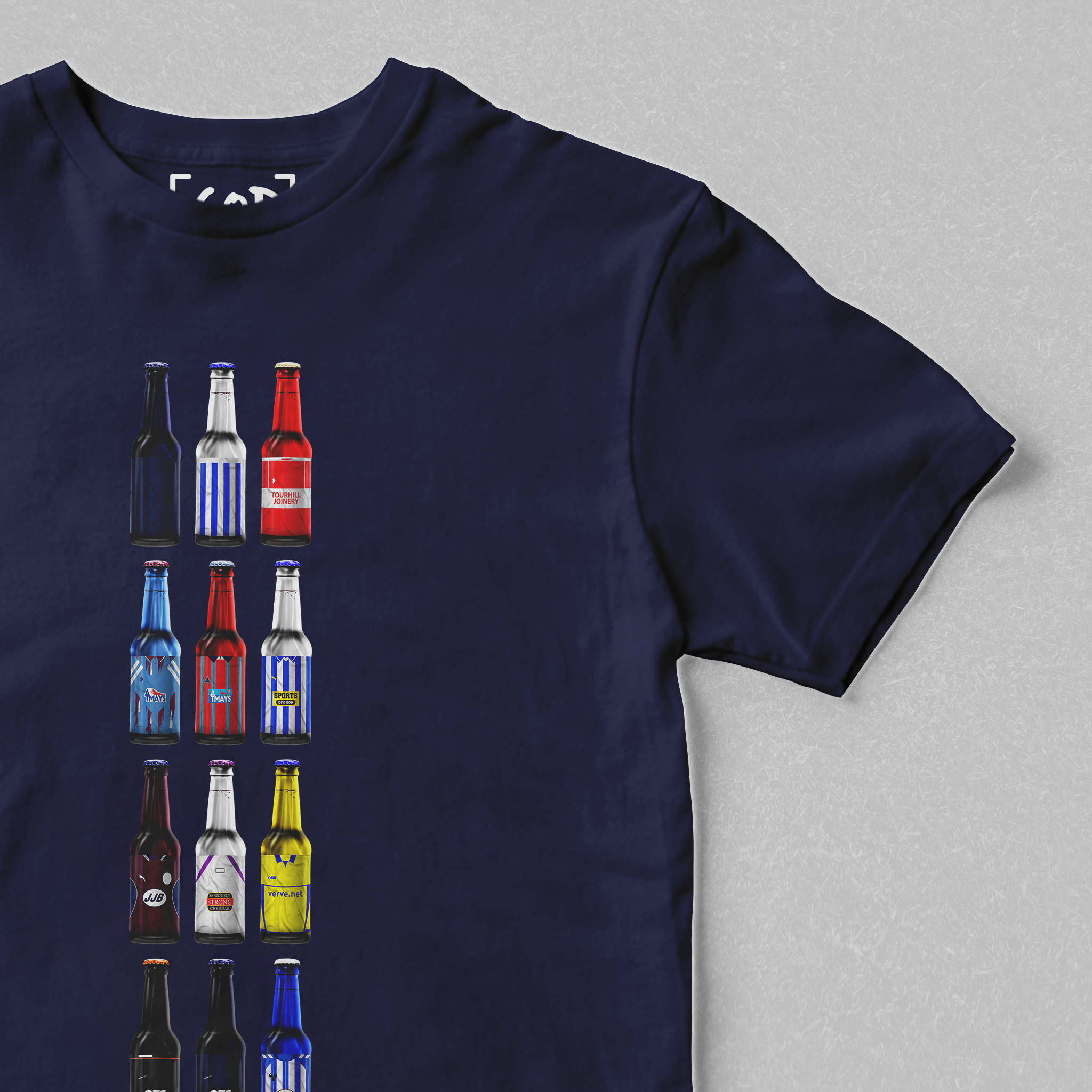 Twelve iconic kits from your club’s past, reimagined as collectible beer bottles in a bold, fan-made design. Each bottle tells a story — of unforgettable goals, cult heroes, and matchdays etched into football history. Crafted for supporters who carry the legacy, this tee is a wearable celebration of heritage, pride, and pints.