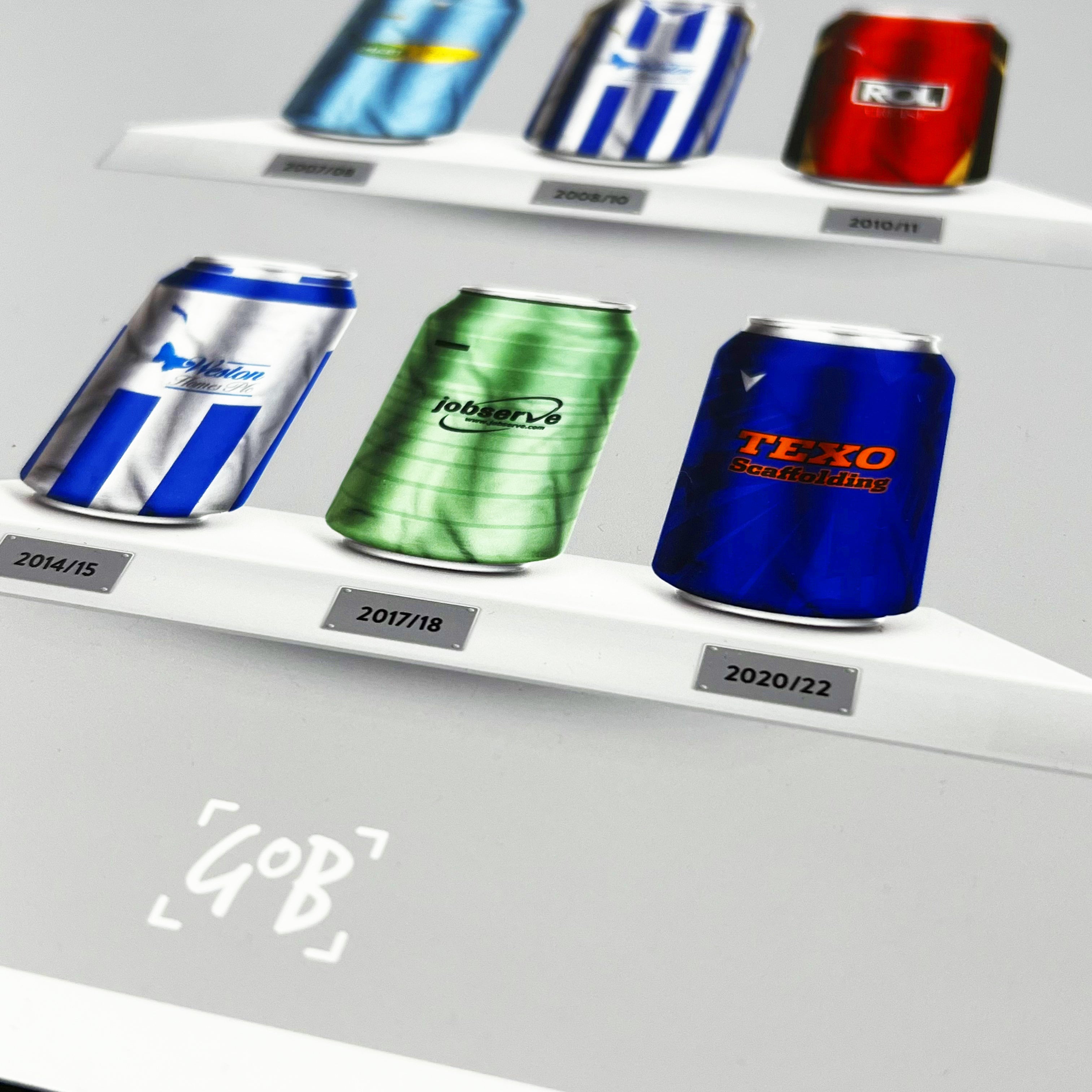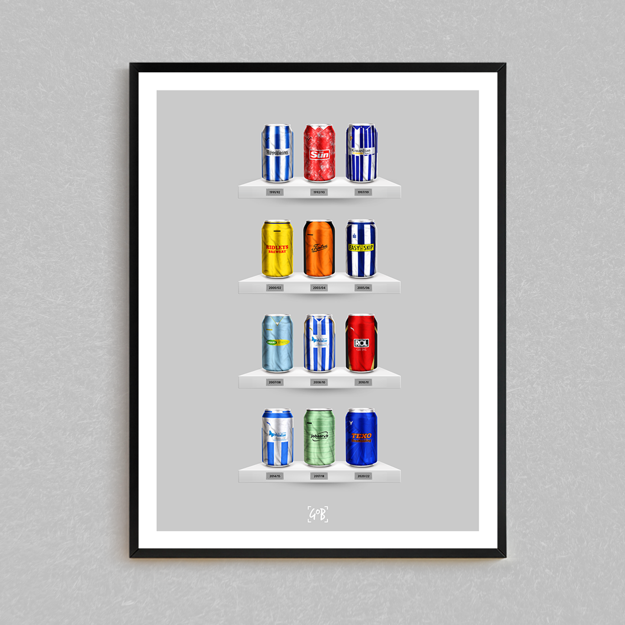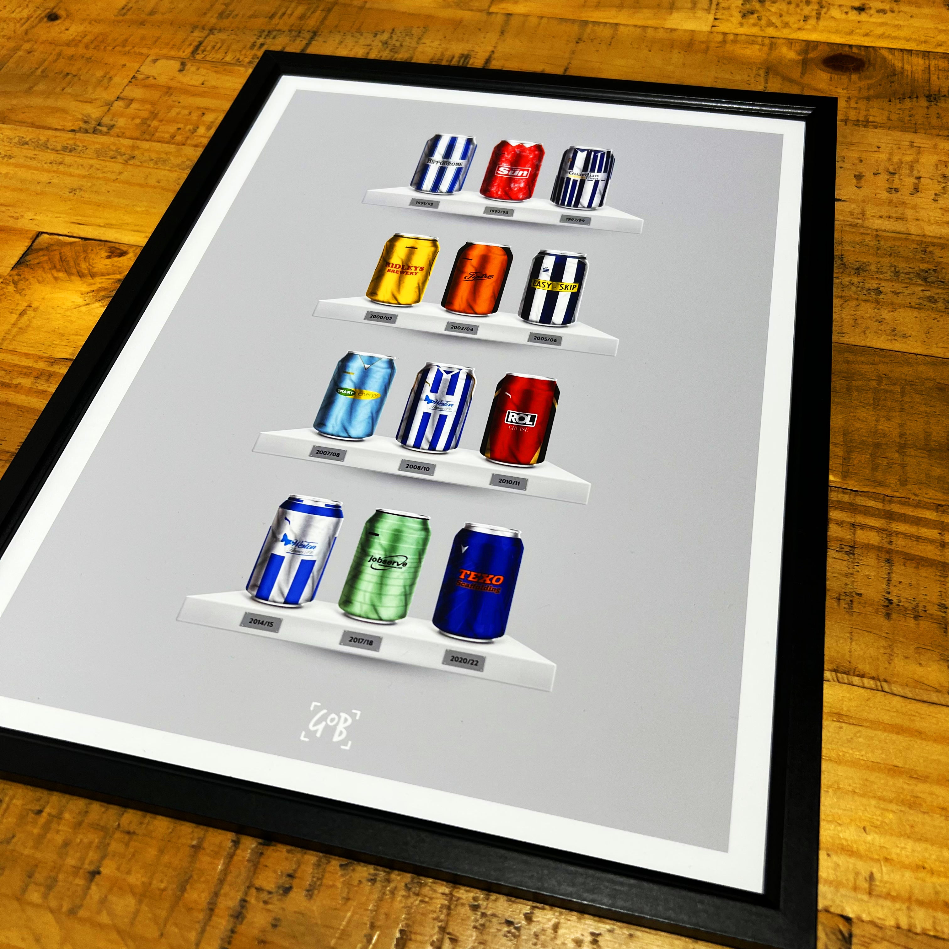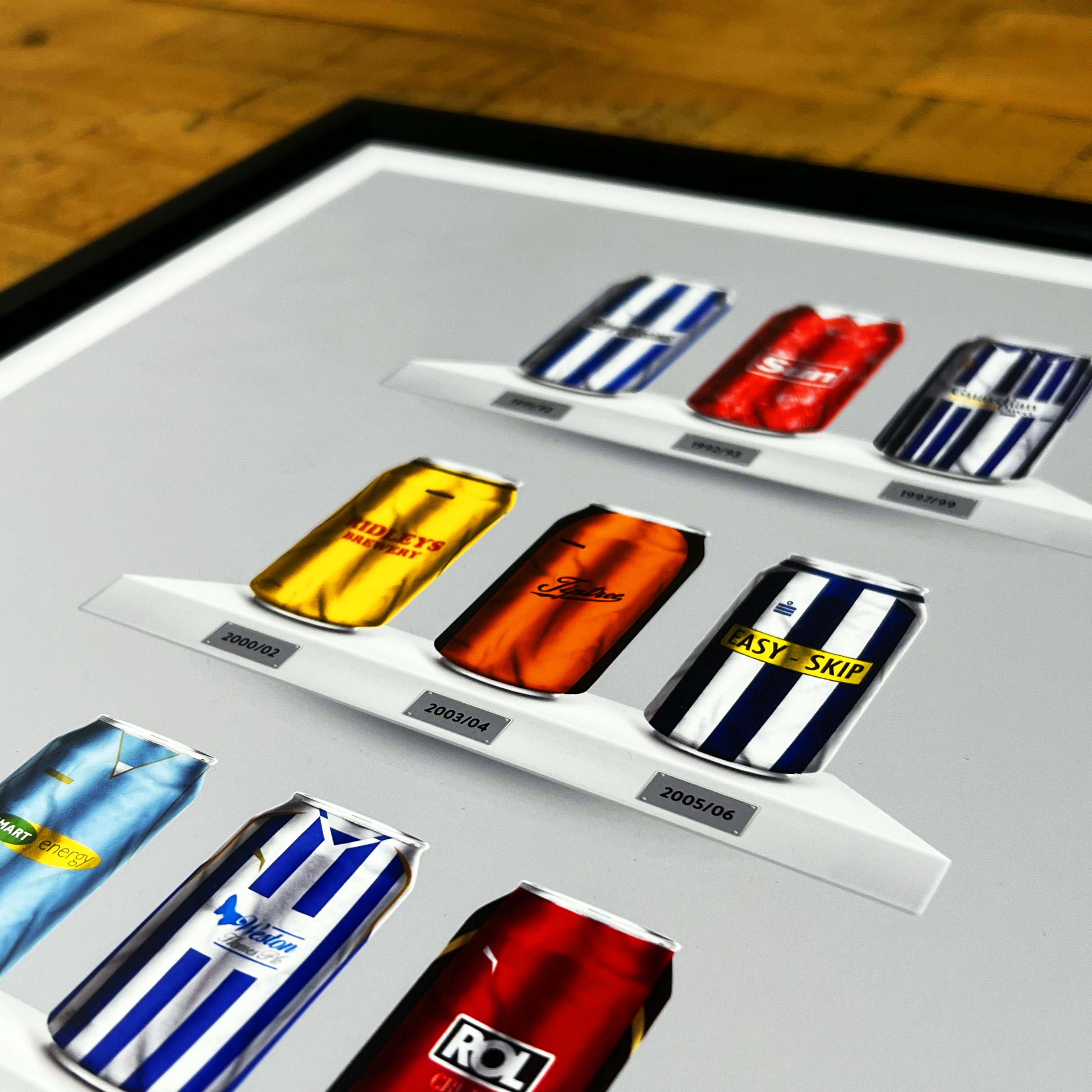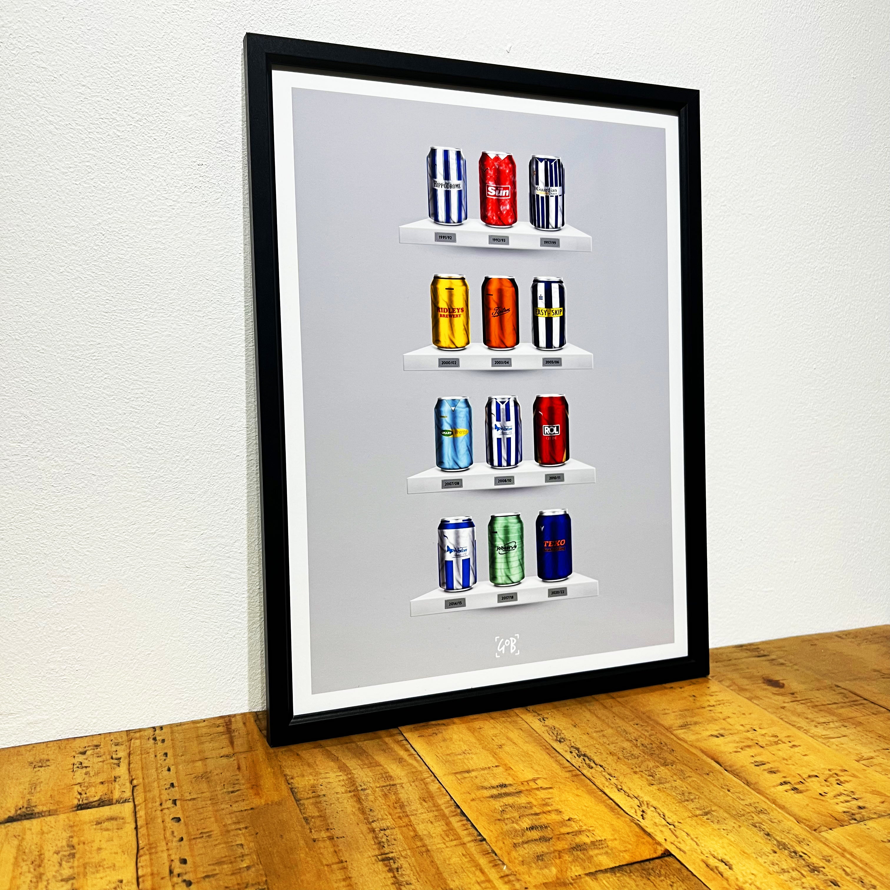 Celebrate legendary football kits from the past few decades, each one digitally illustrated in your choice of our unique can or bottle styles. Printed in high-definition on premium gloss paper, these designs are made to stand out, whether framed or displayed as they are. Also available as a matching T-shirt