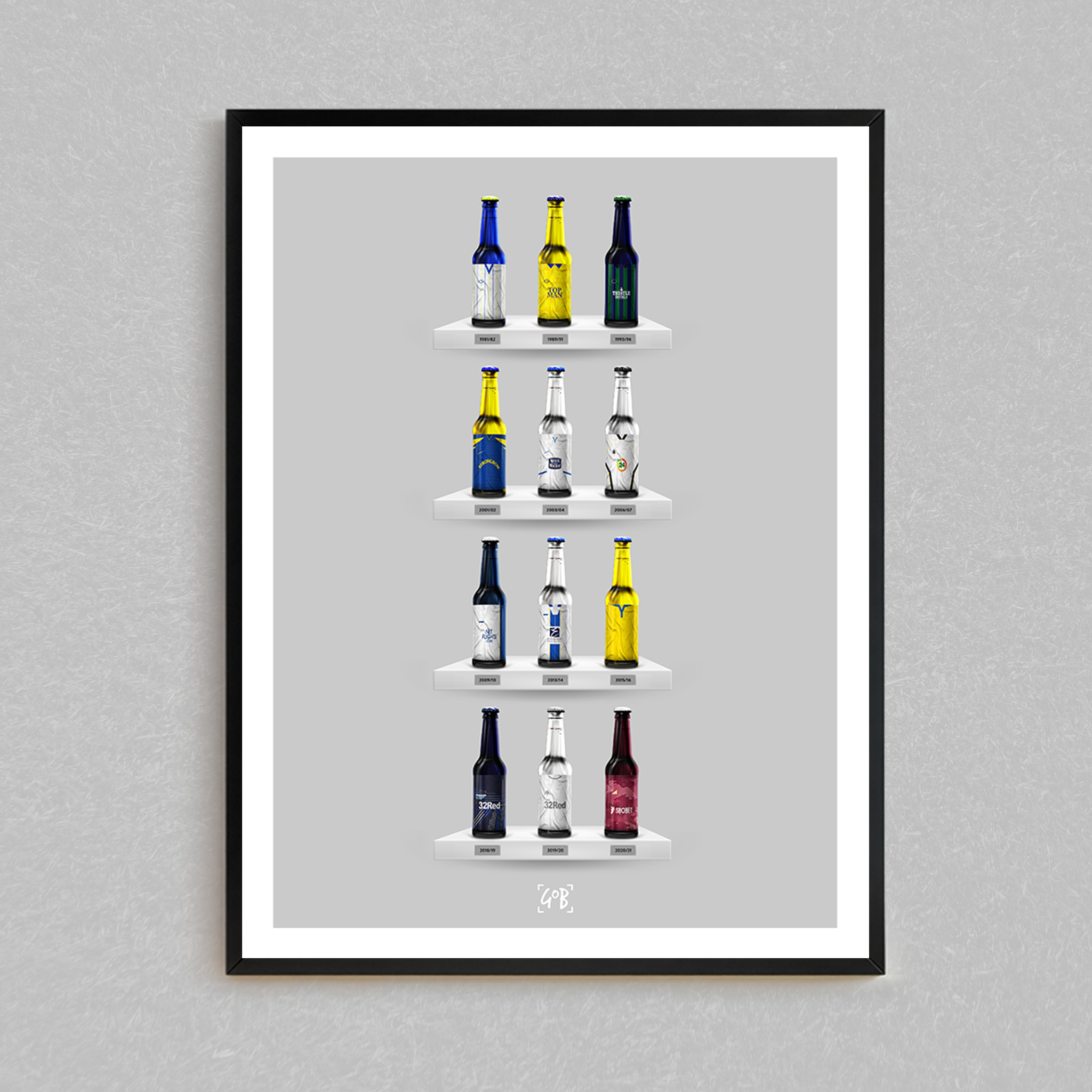 Celebrate legendary football kits from the past few decades, each one digitally illustrated in your choice of our unique can or bottle styles. Printed in high-definition on premium gloss paper, these designs are made to stand out, whether framed or displayed as they are. Also available as a matching T-shirt