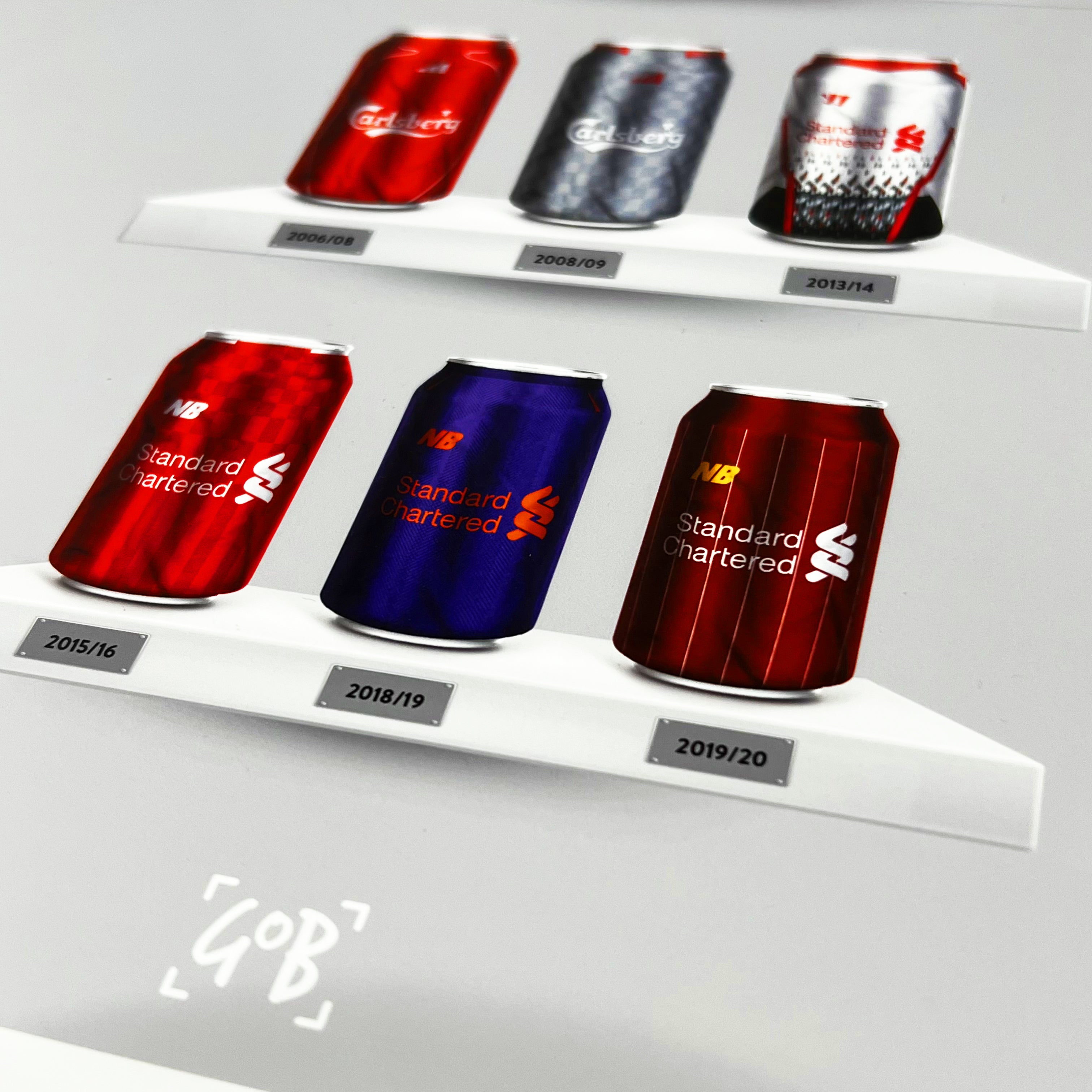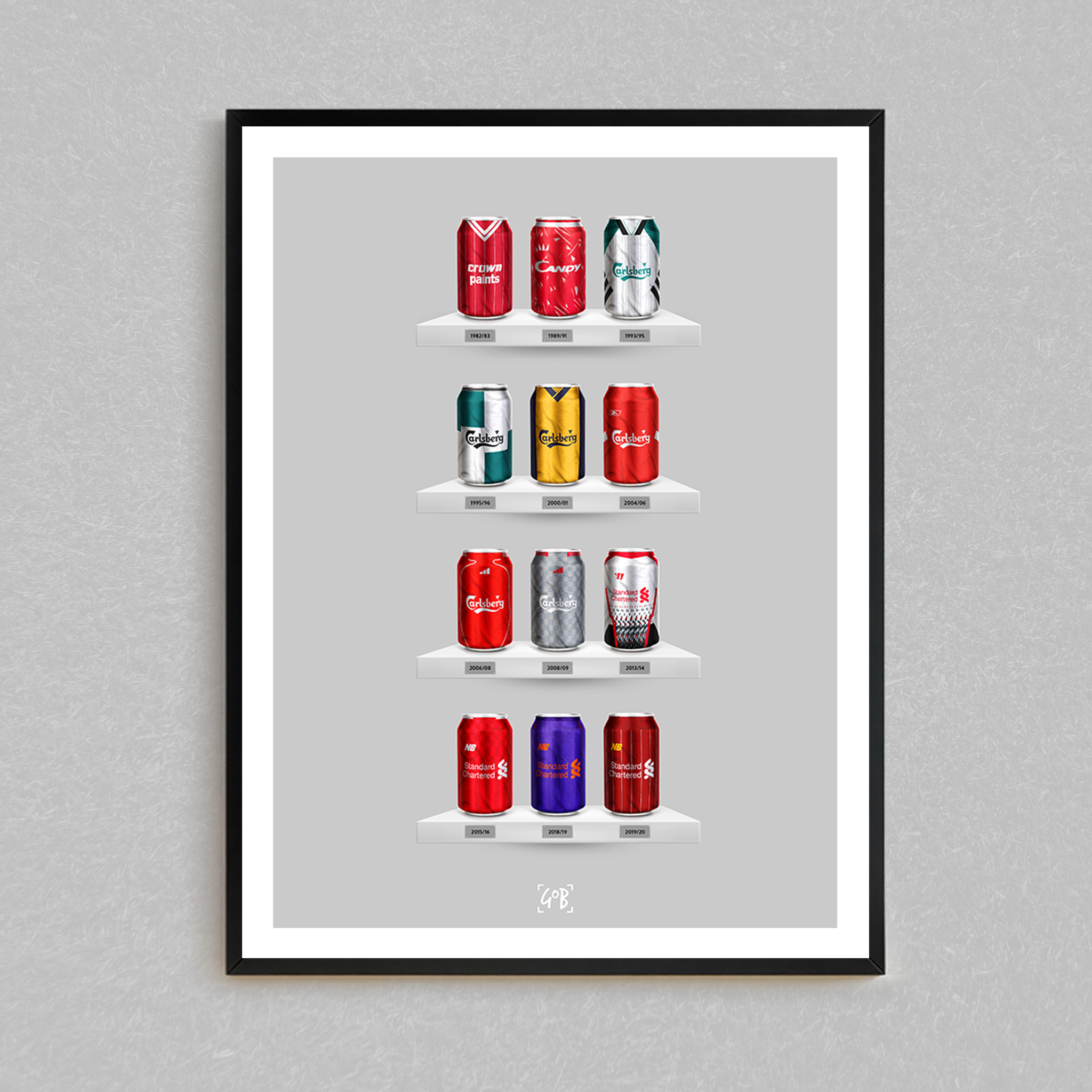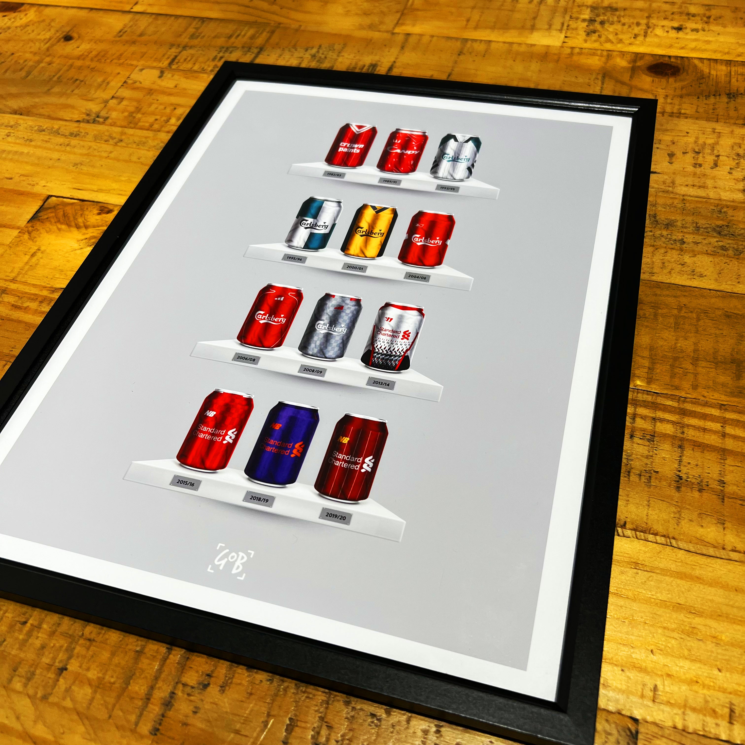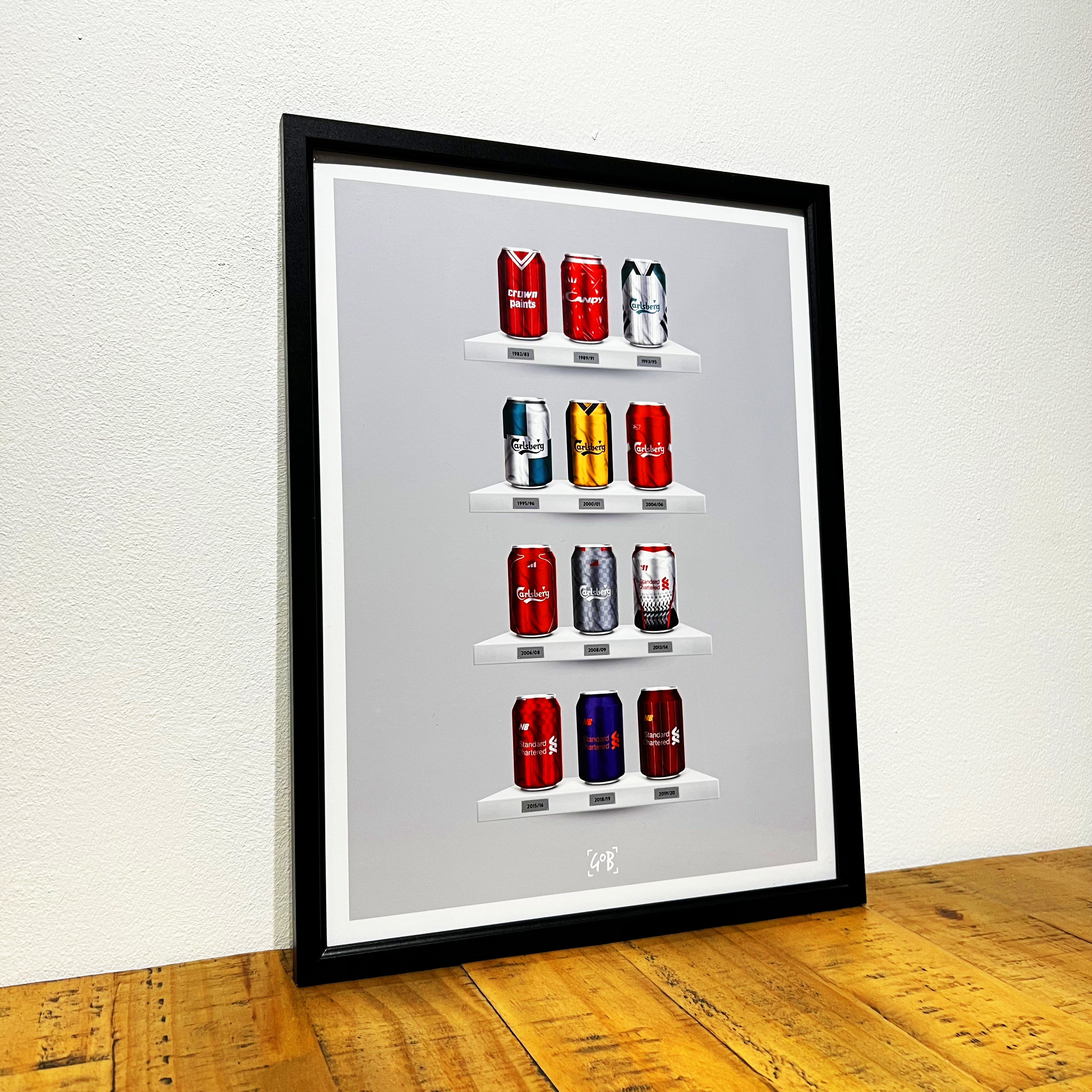 Celebrate legendary football kits from the past few decades, each one digitally illustrated in your choice of our unique can or bottle styles. Printed in high-definition on premium gloss paper, these designs are made to stand out, whether framed or displayed as they are. Also available as a matching T-shirt