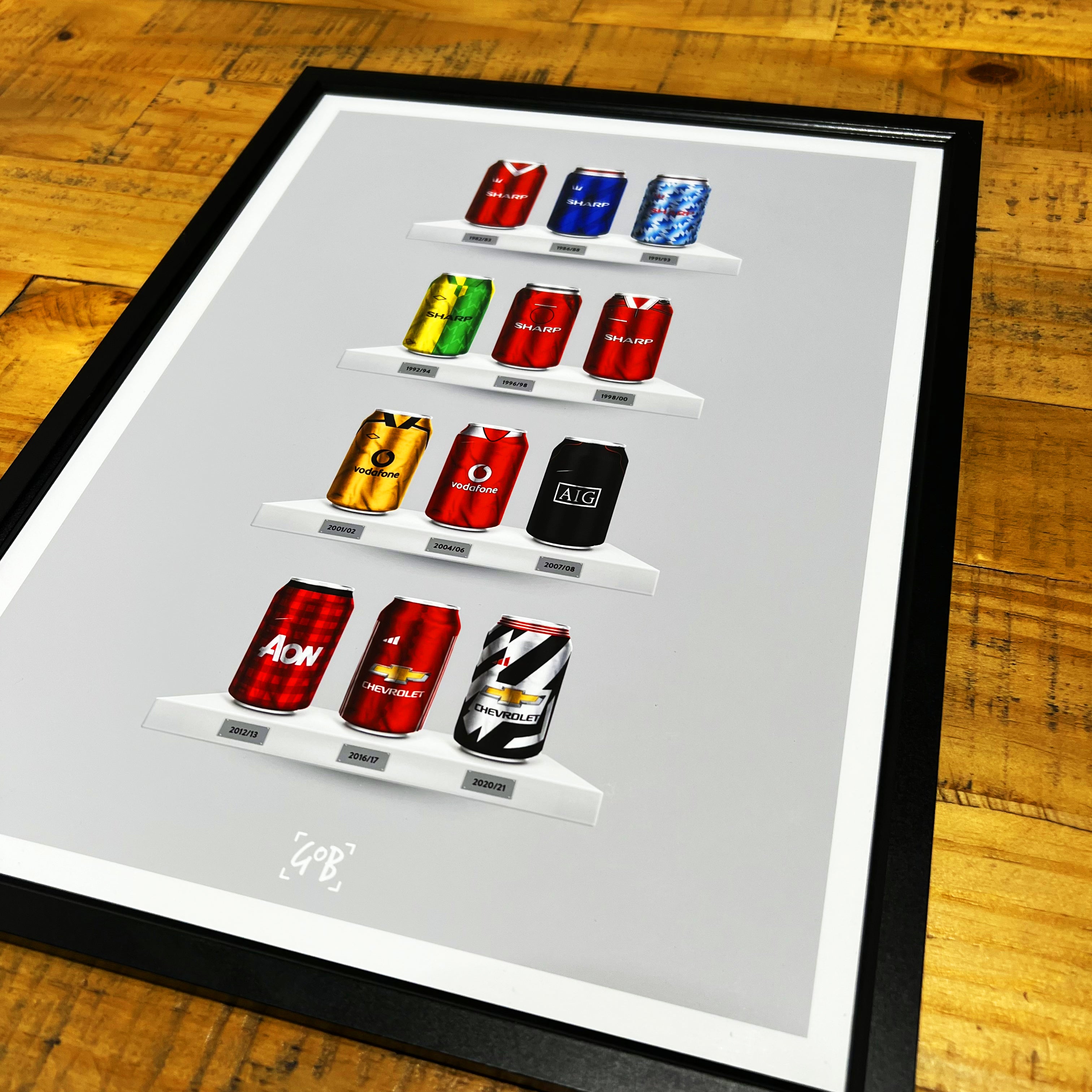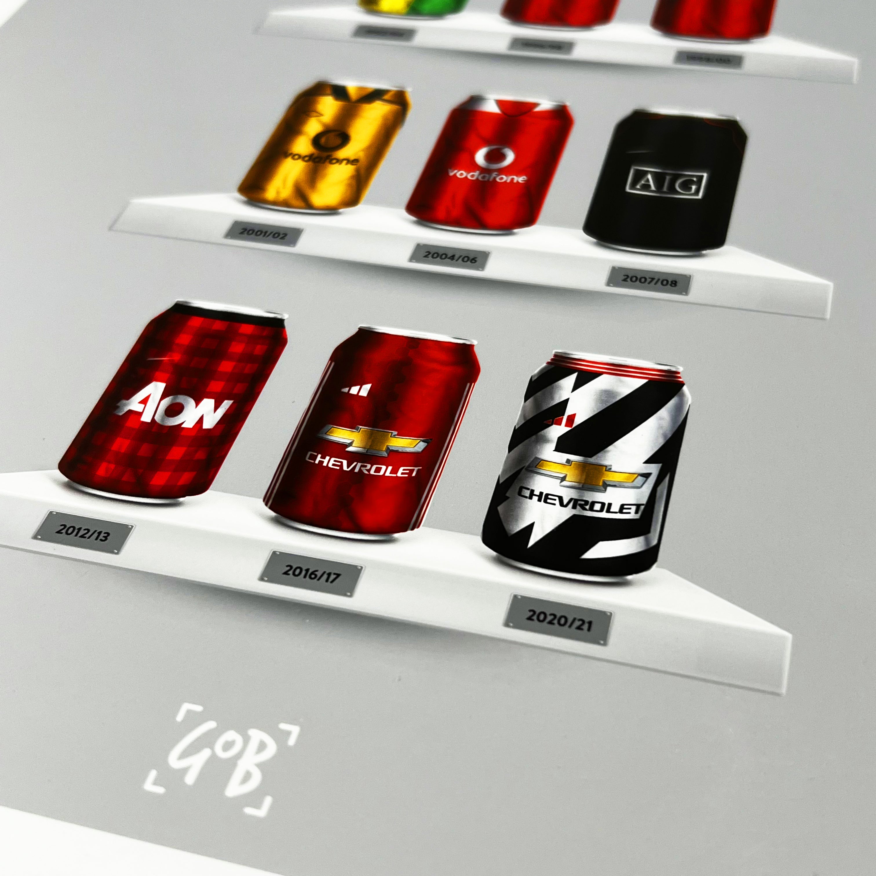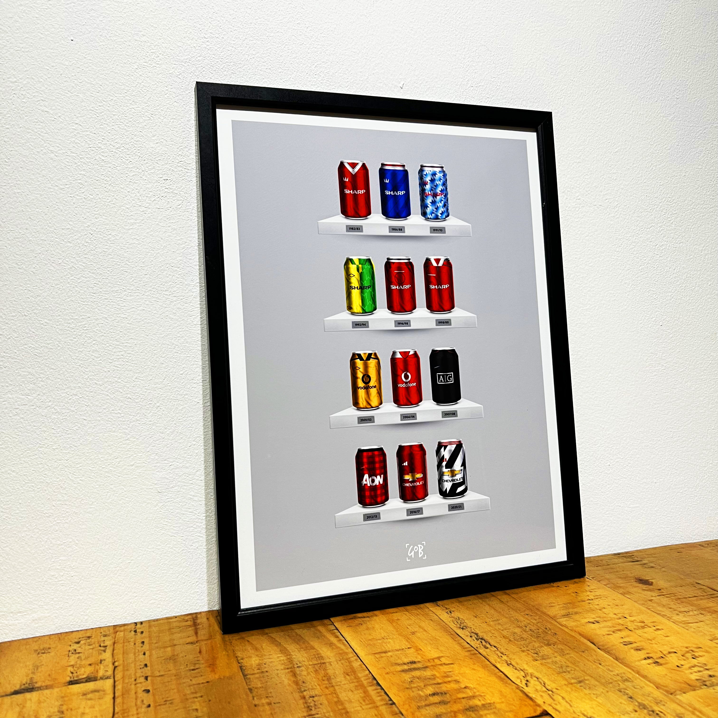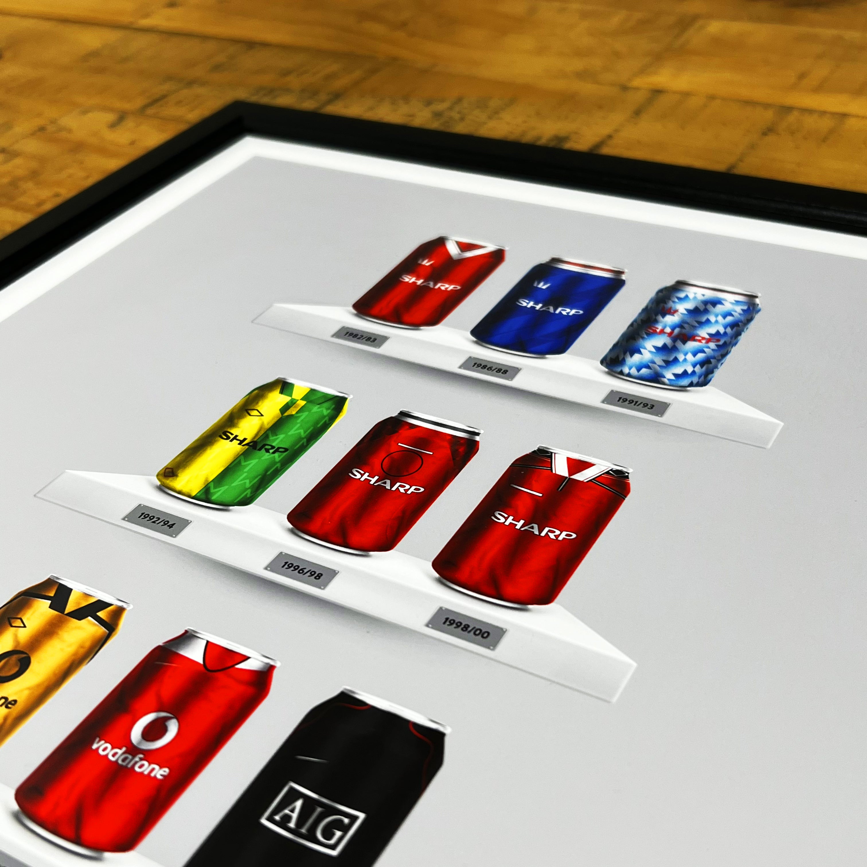 Celebrate legendary football kits from the past few decades, each one digitally illustrated in your choice of our unique can or bottle styles. Printed in high-definition on premium gloss paper, these designs are made to stand out, whether framed or displayed as they are. Also available as a matching T-shirt