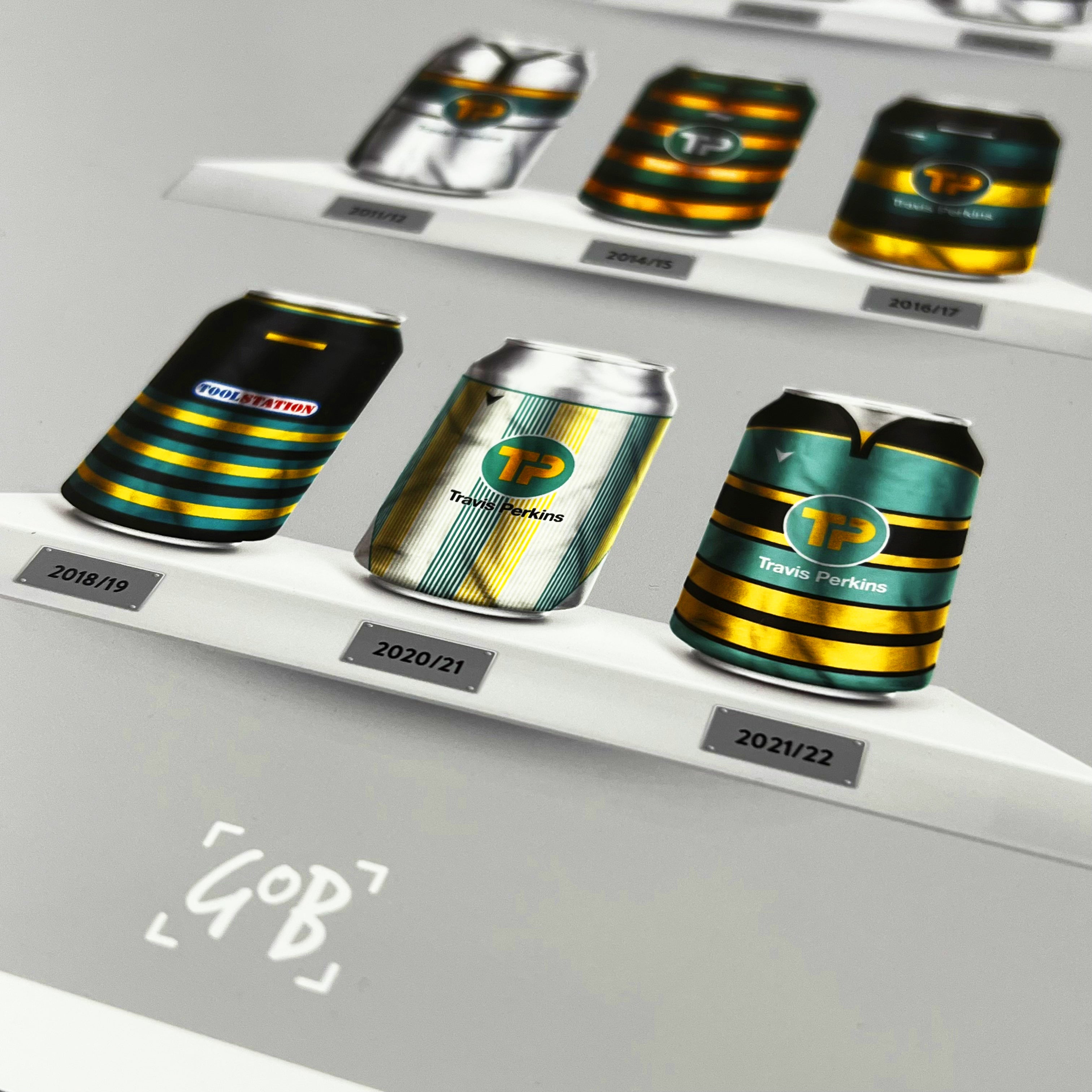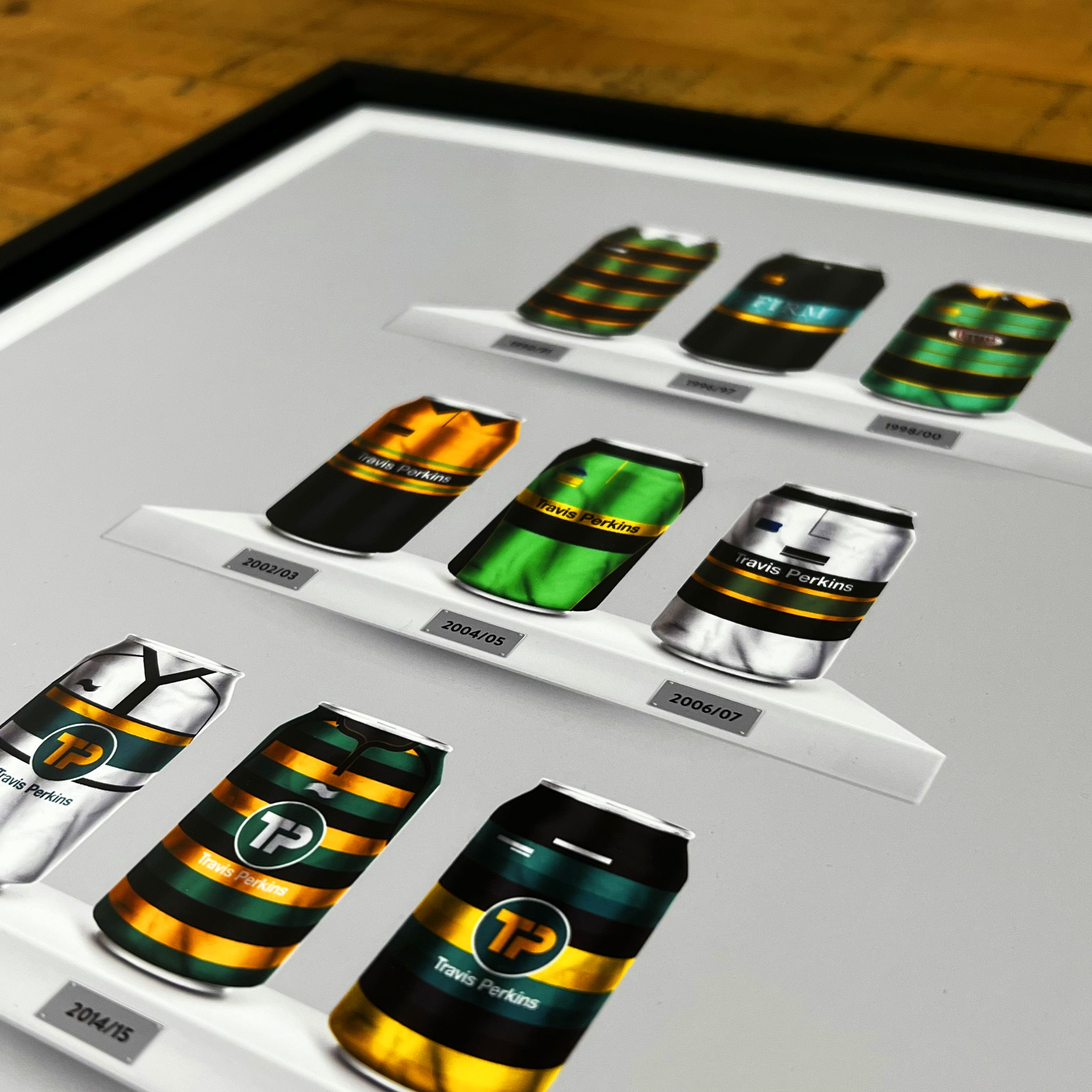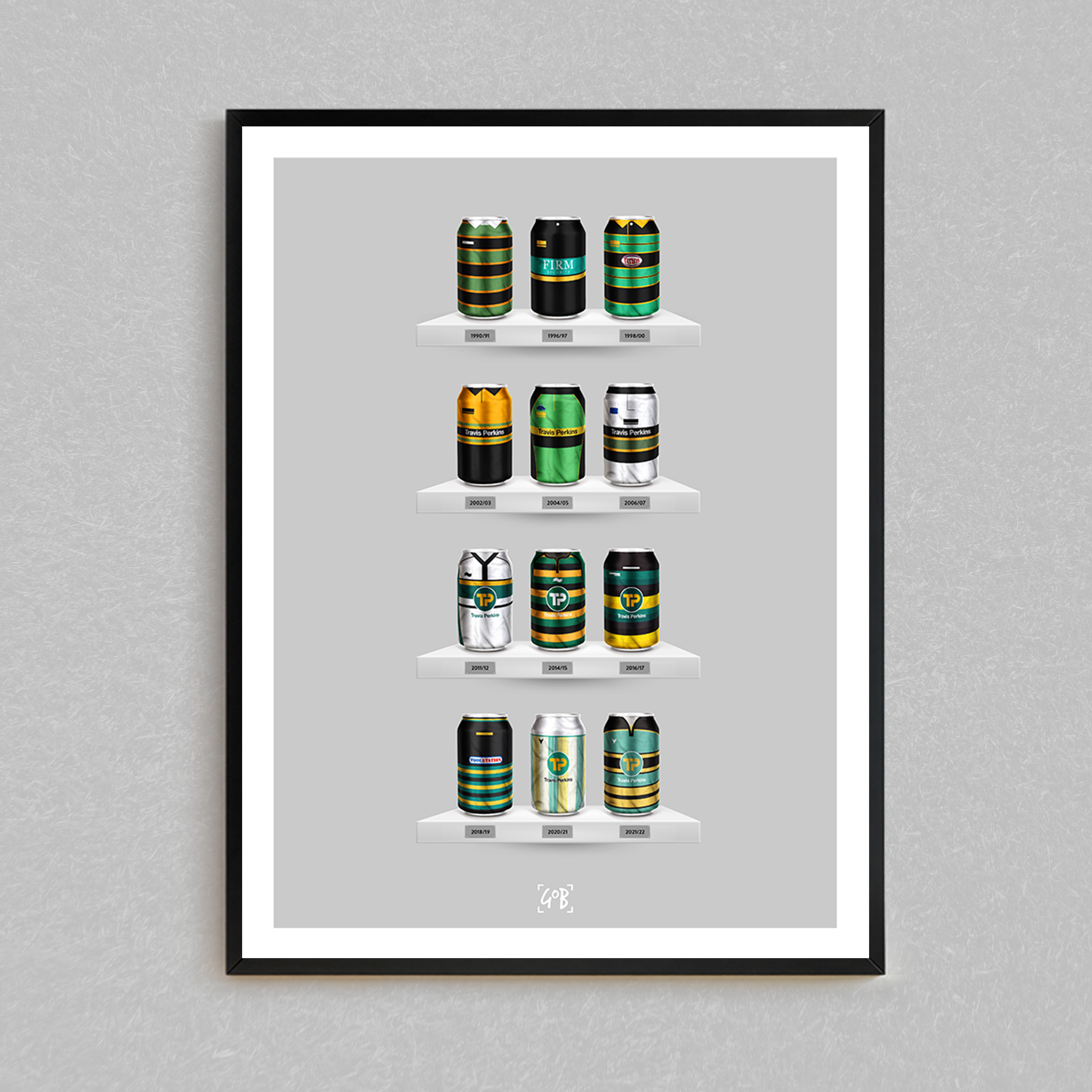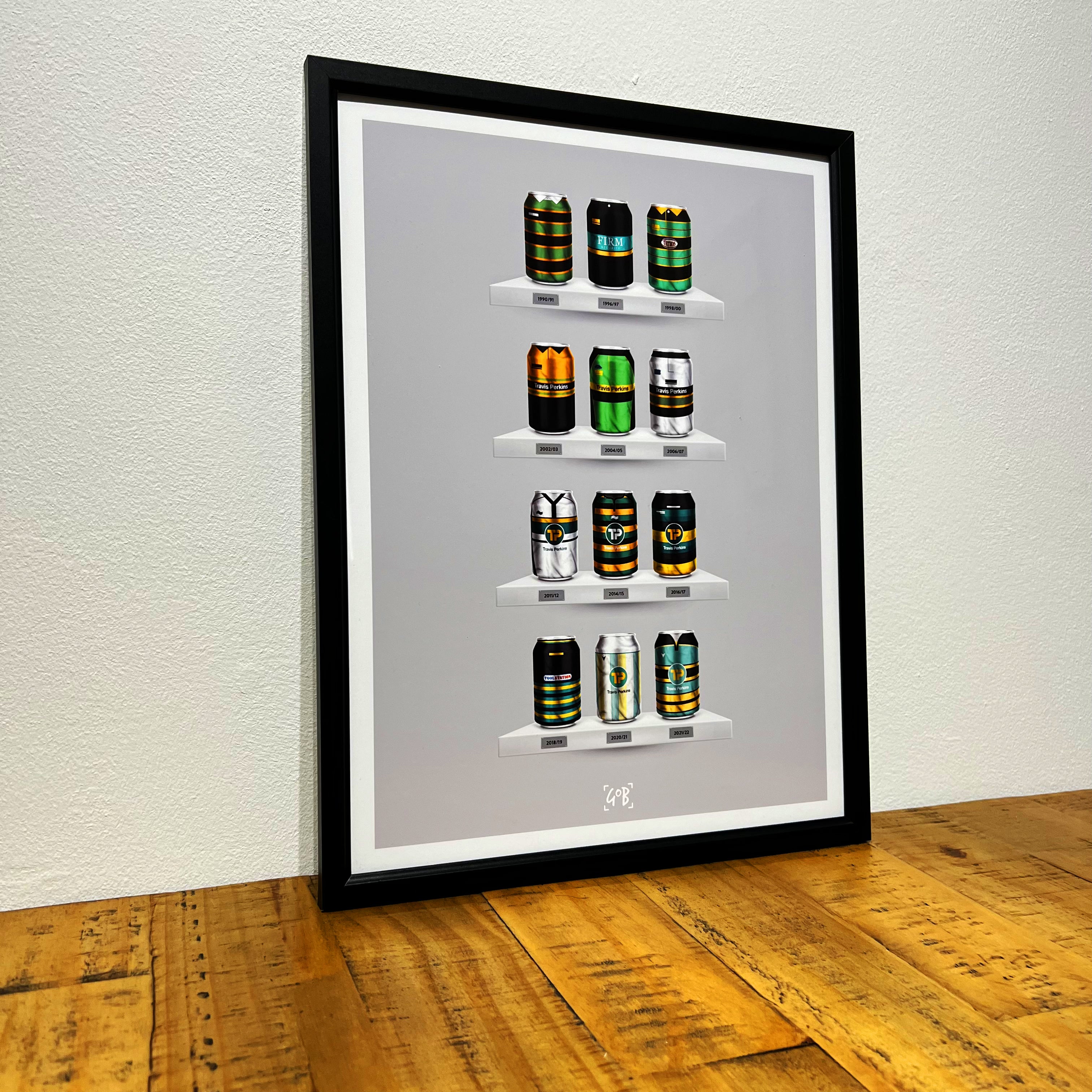 Celebrate legendary football kits from the past few decades, each one digitally illustrated in your choice of our unique can or bottle styles. Printed in high-definition on premium gloss paper, these designs are made to stand out, whether framed or displayed as they are. Also available as a matching T-shirt