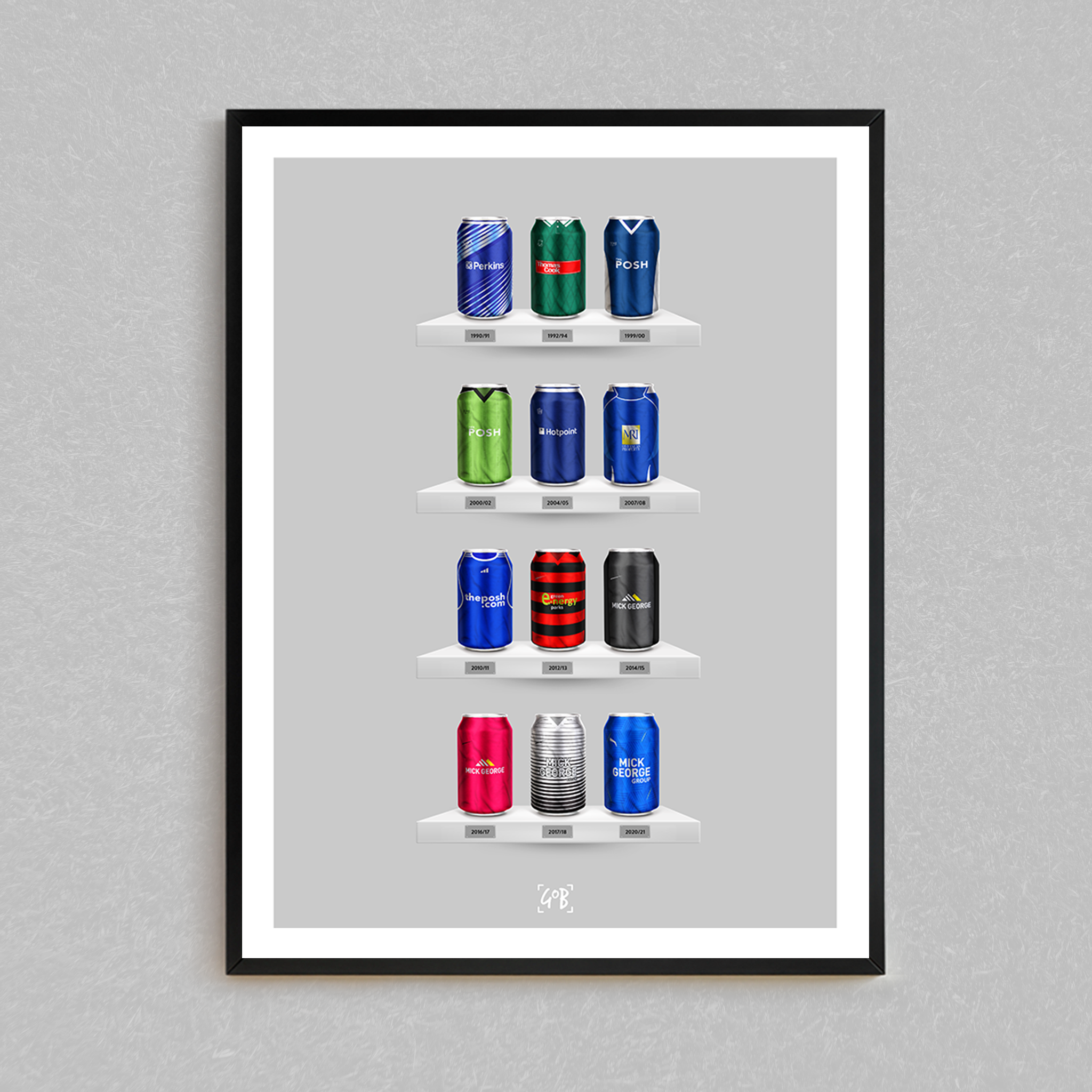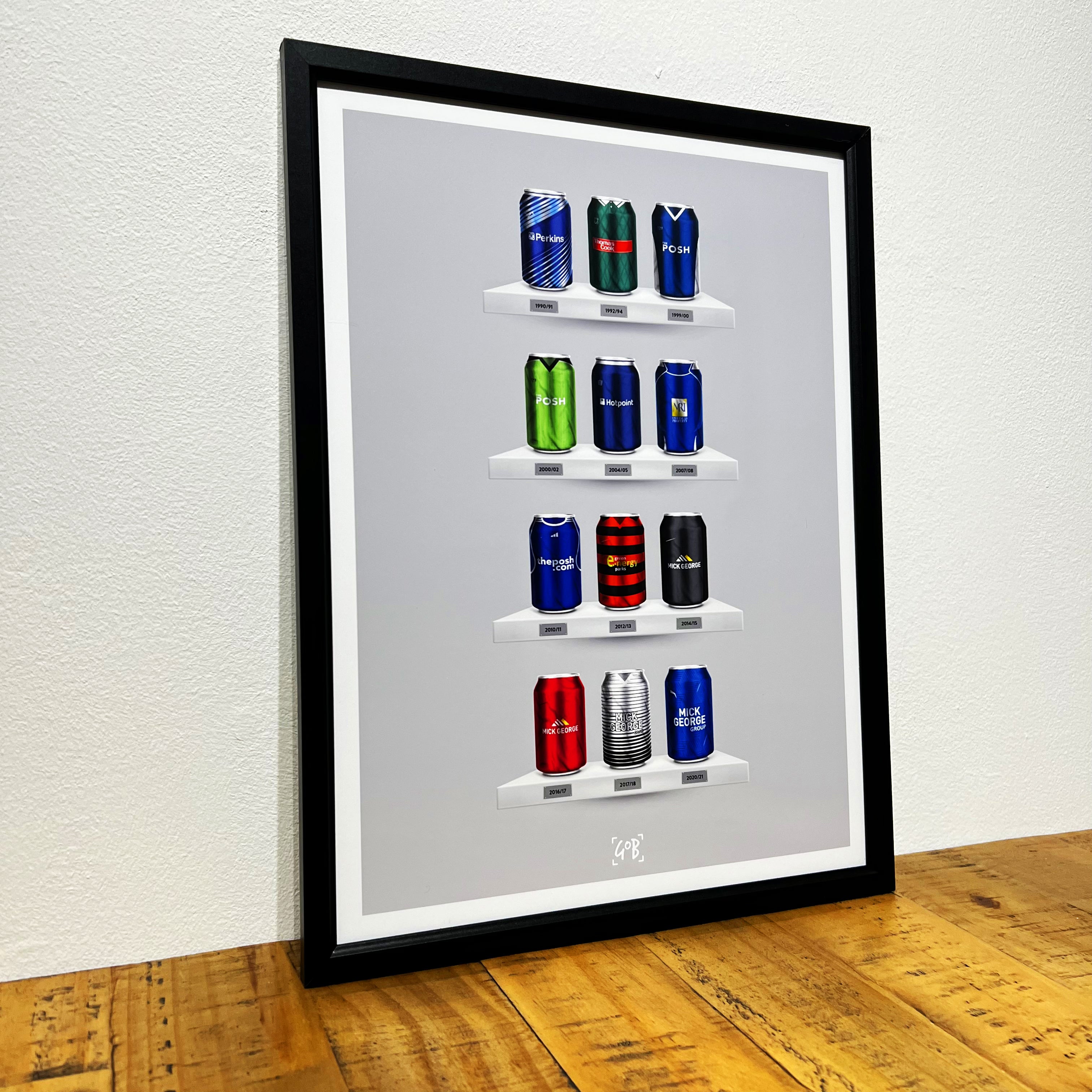 Celebrate legendary football kits from the past few decades, each one digitally illustrated in your choice of our unique can or bottle styles. Printed in high-definition on premium gloss paper, these designs are made to stand out, whether framed or displayed as they are. Also available as a matching T-shirt
