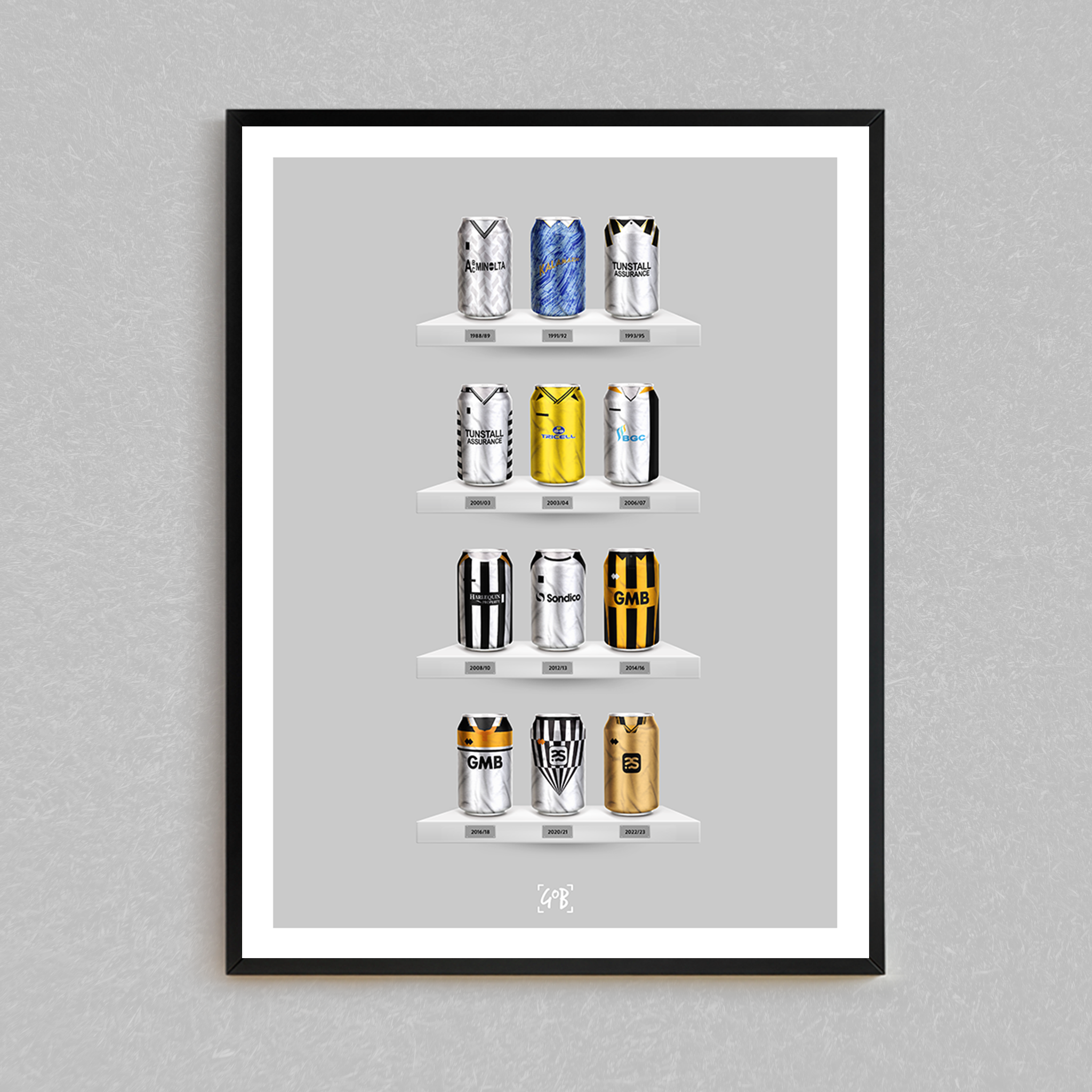 Celebrate legendary football kits from the past few decades, each one digitally illustrated in your choice of our unique can or bottle styles. Printed in high-definition on premium gloss paper, these designs are made to stand out, whether framed or displayed as they are. Also available as a matching T-shirt