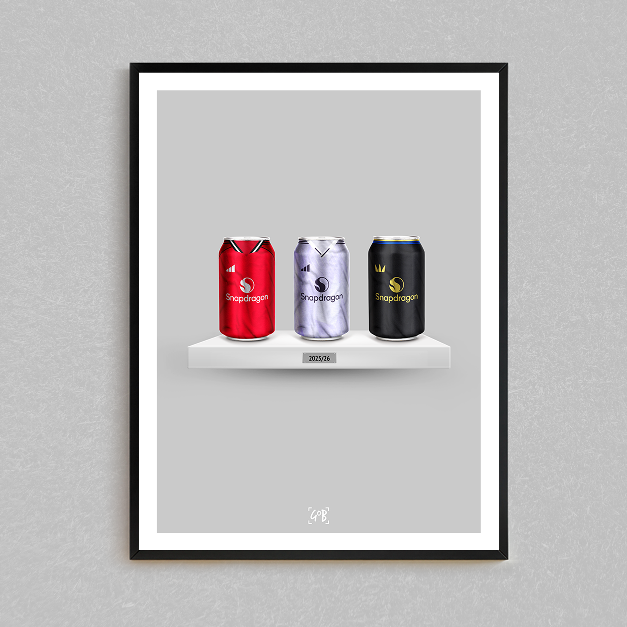 The 2025/26 kits, served cold. This original fan-made art print reimagines the new season’s home, away, and third shirts as collectible beer cans — a unique blend of football design and craft culture.