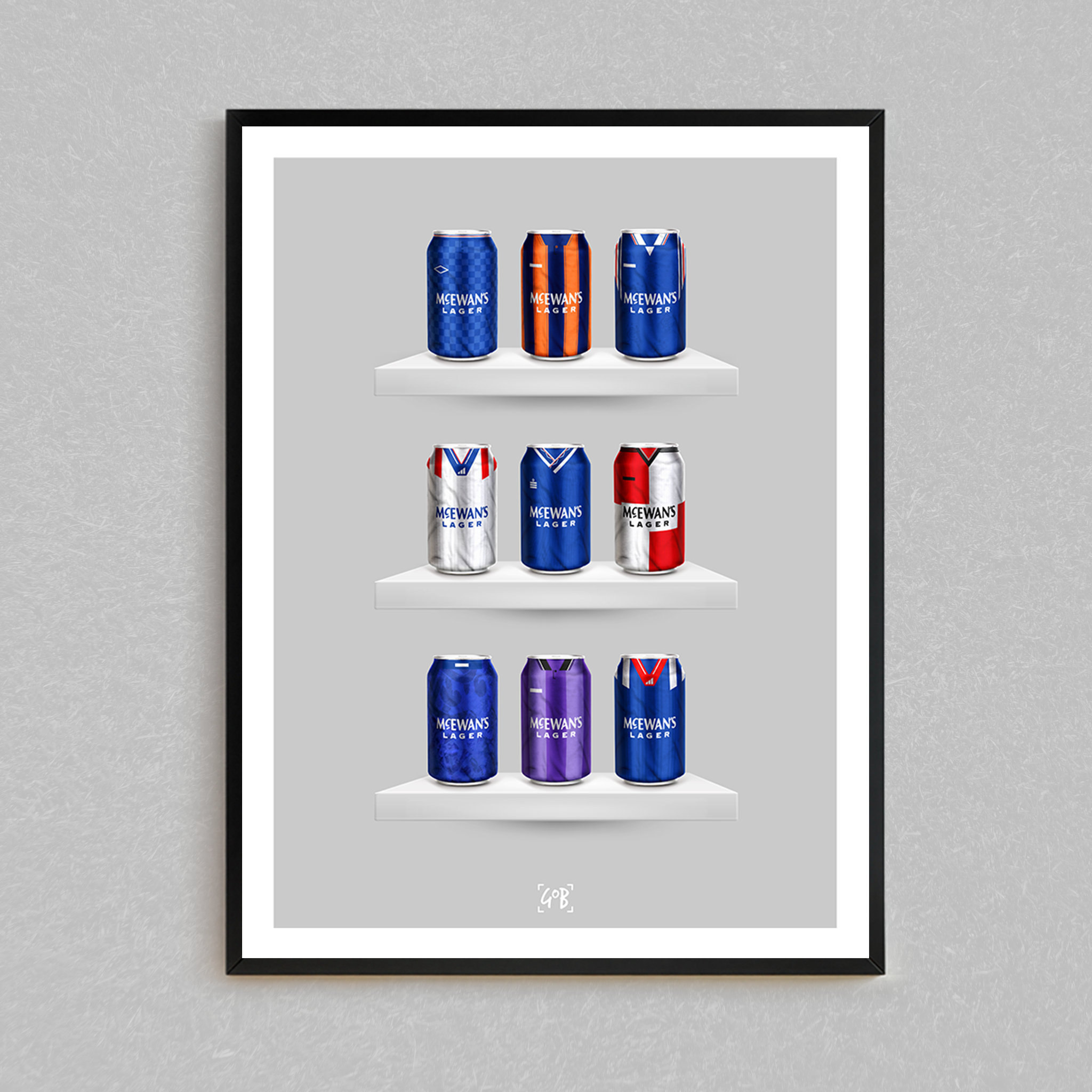 Celebrate legendary football kits from the past few decades, each one digitally illustrated in your choice of our unique can or bottle styles. Printed in high-definition on premium gloss paper, these designs are made to stand out, whether framed or displayed as they are. Also available as a matching T-shirt
