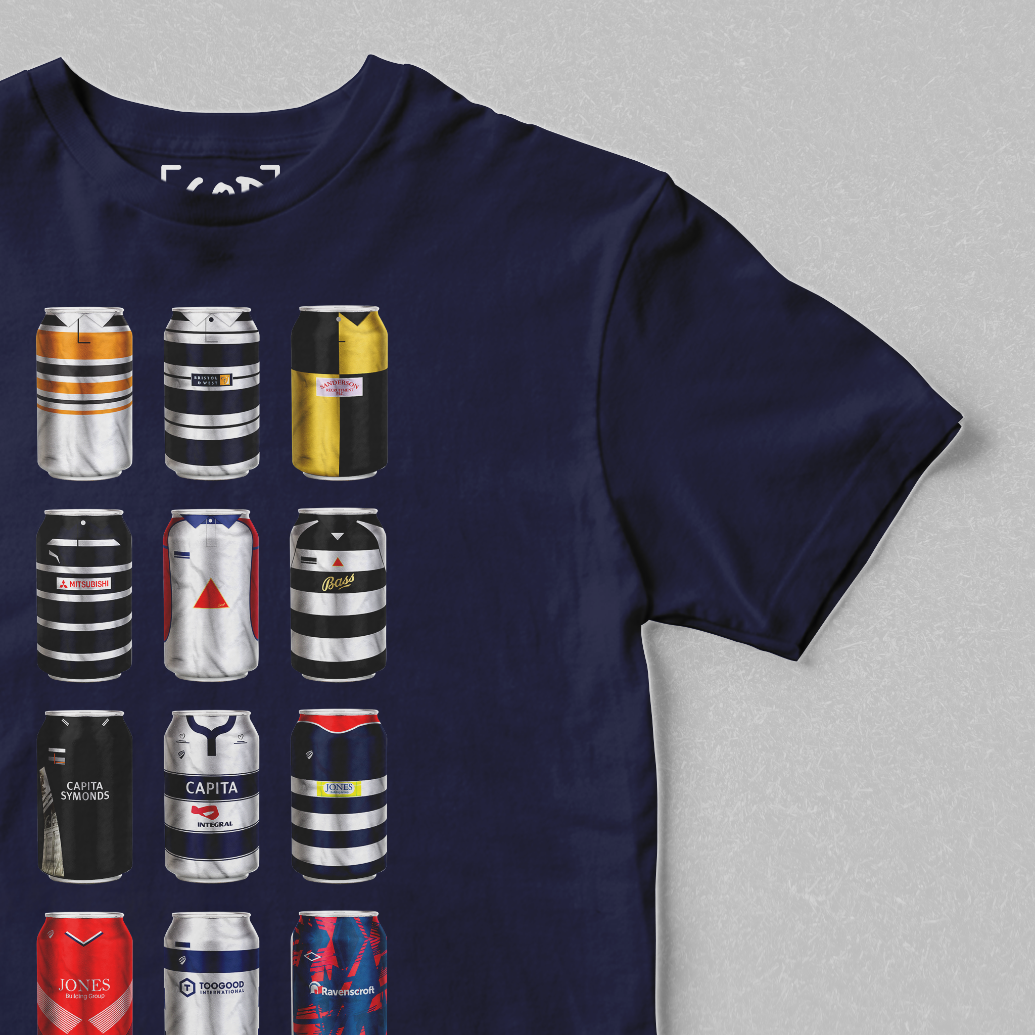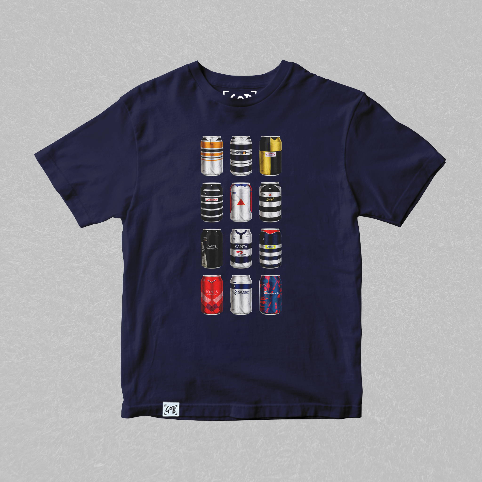 Twelve iconic kits from your club’s past, reimagined as collectible beer bottles in a bold, fan-made design. Each bottle tells a story — of unforgettable goals, cult heroes, and matchdays etched into football history. Crafted for supporters who carry the legacy, this tee is a wearable celebration of heritage, pride, and pints.