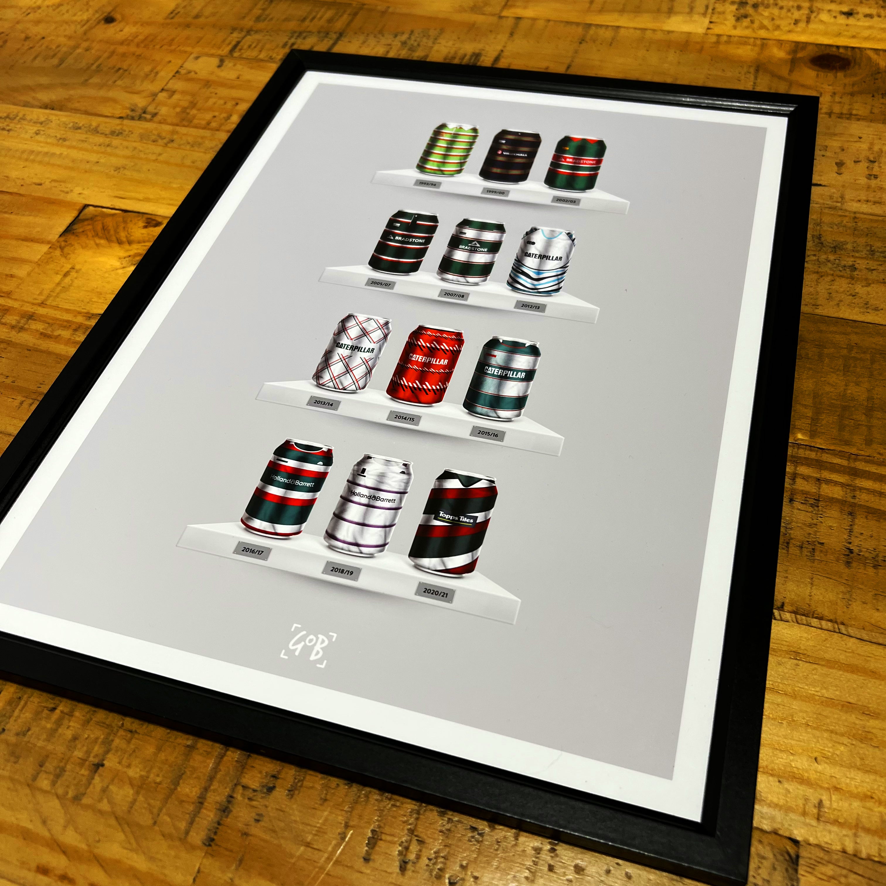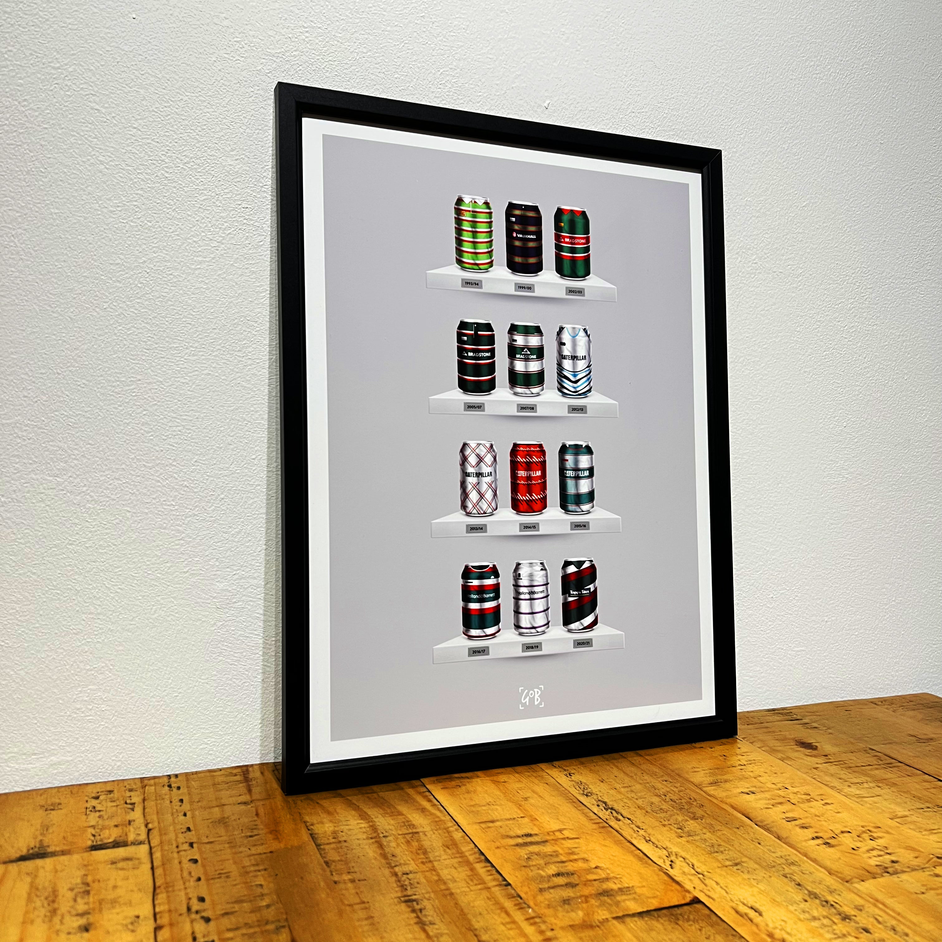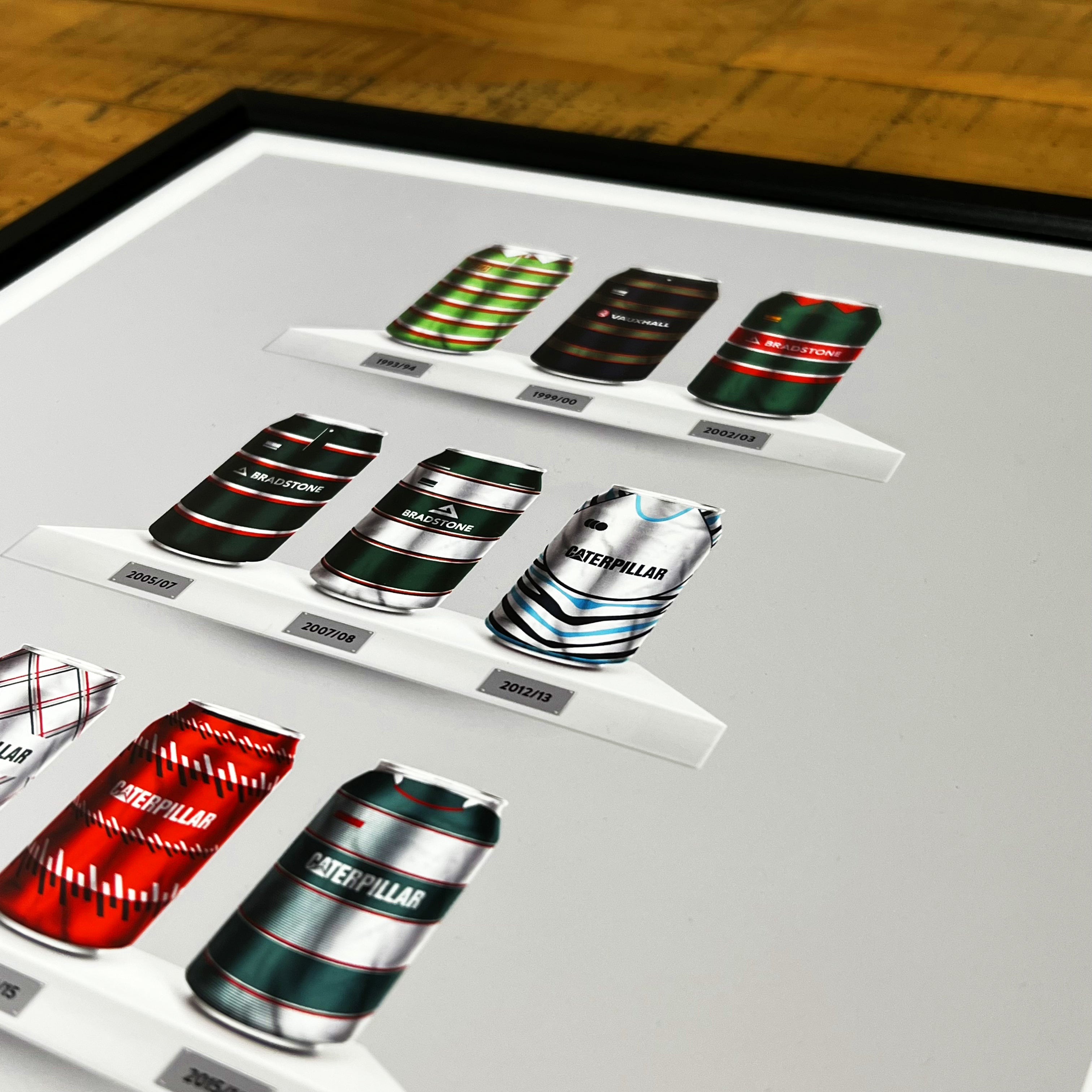 Celebrate legendary football kits from the past few decades, each one digitally illustrated in your choice of our unique can or bottle styles. Printed in high-definition on premium gloss paper, these designs are made to stand out, whether framed or displayed as they are. Also available as a matching T-shirt