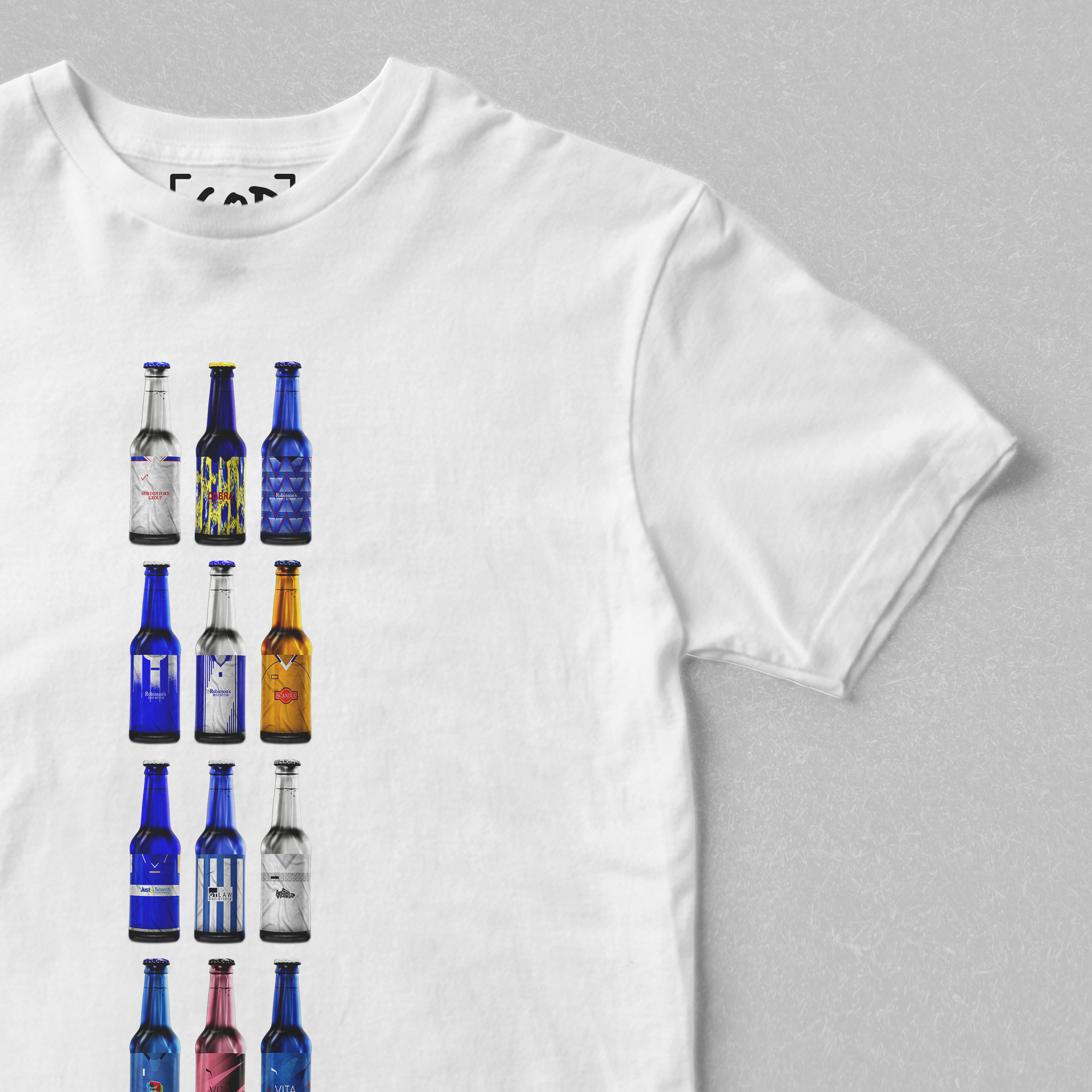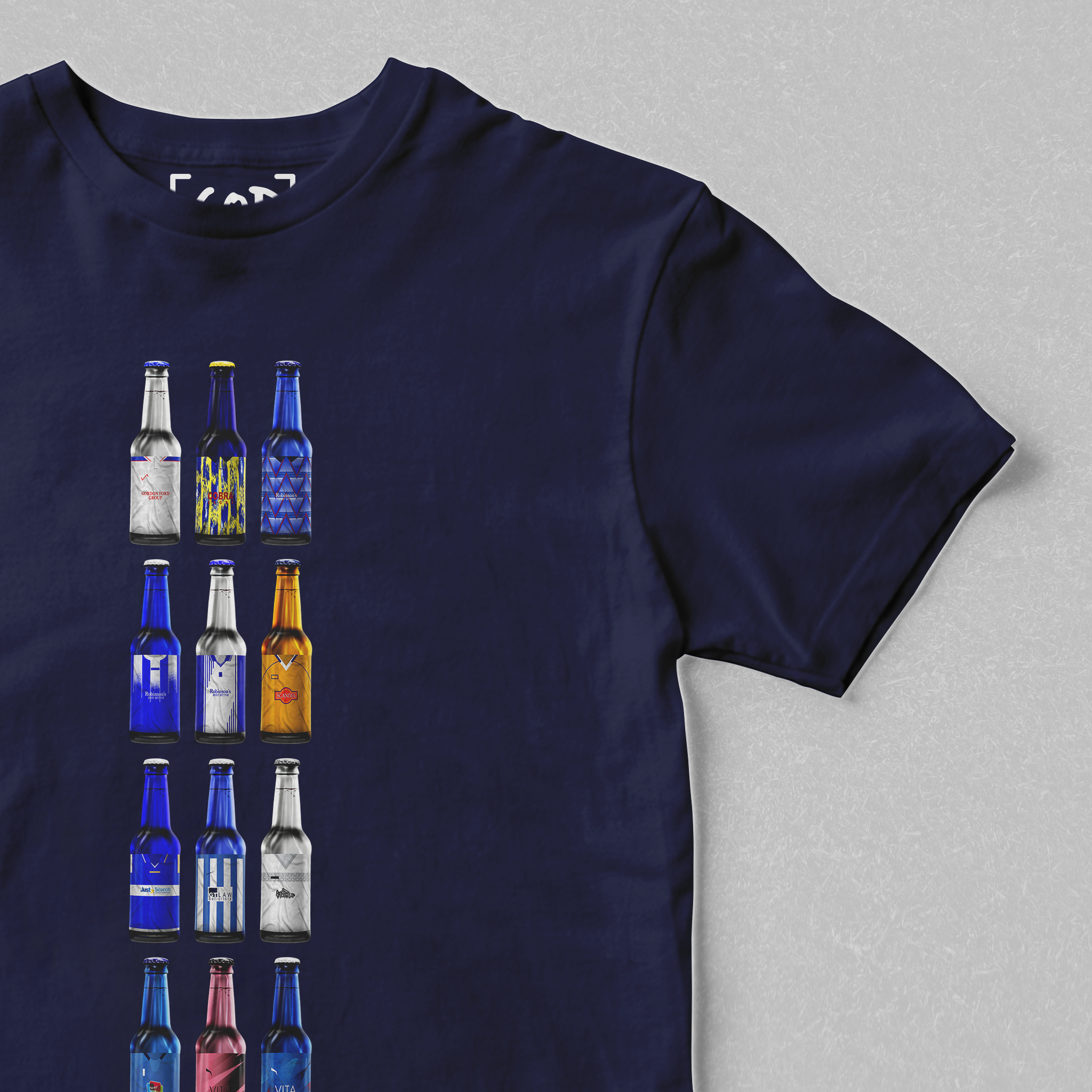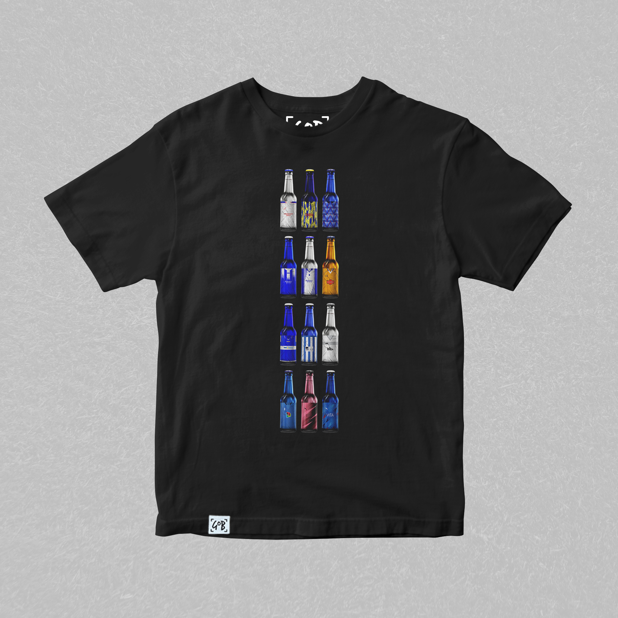 Twelve iconic kits from your club’s past, reimagined as collectible beer bottles in a bold, fan-made design. Each bottle tells a story — of unforgettable goals, cult heroes, and matchdays etched into football history. Crafted for supporters who carry the legacy, this tee is a wearable celebration of heritage, pride, and pints.