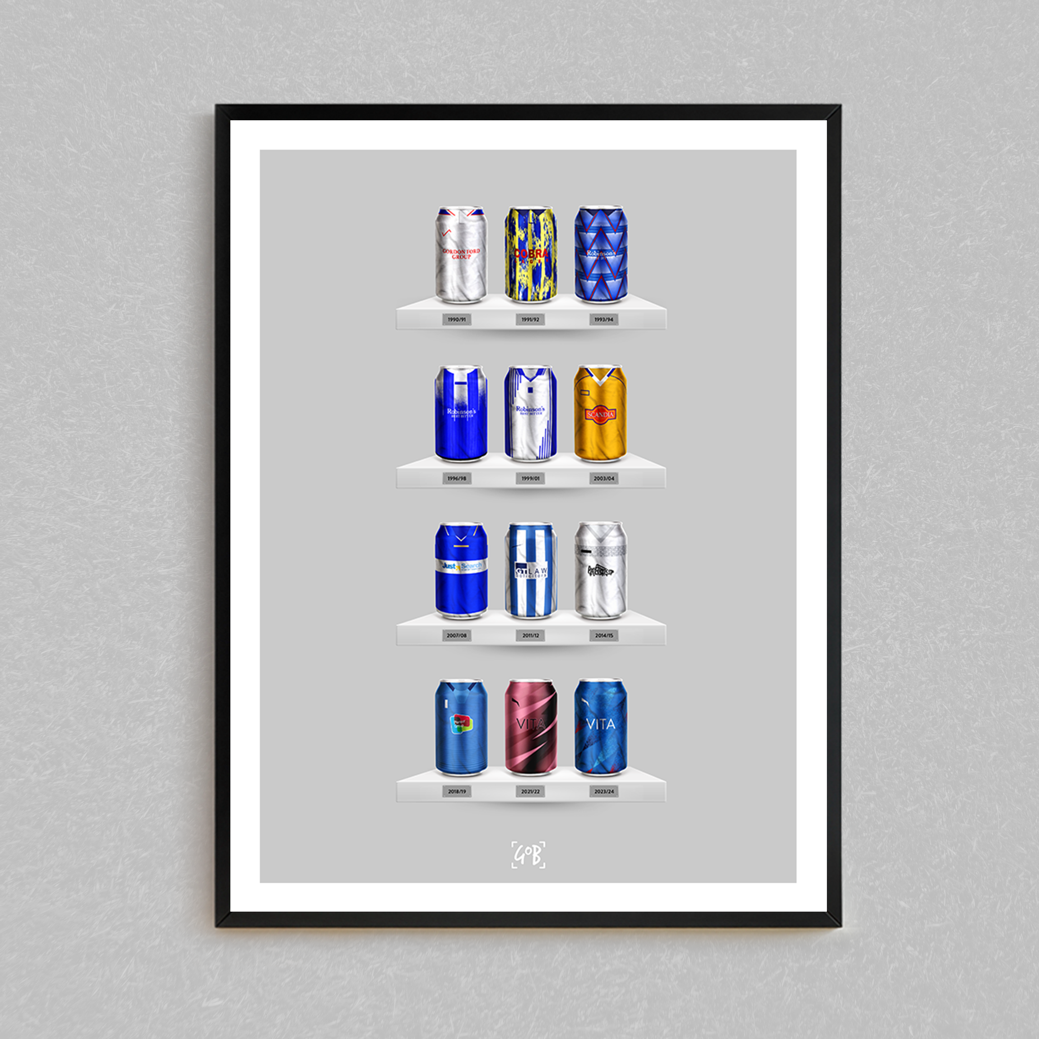 Celebrate legendary football kits from the past few decades, each one digitally illustrated in your choice of our unique can or bottle styles. Printed in high-definition on premium gloss paper, these designs are made to stand out, whether framed or displayed as they are. Also available as a matching T-shirt