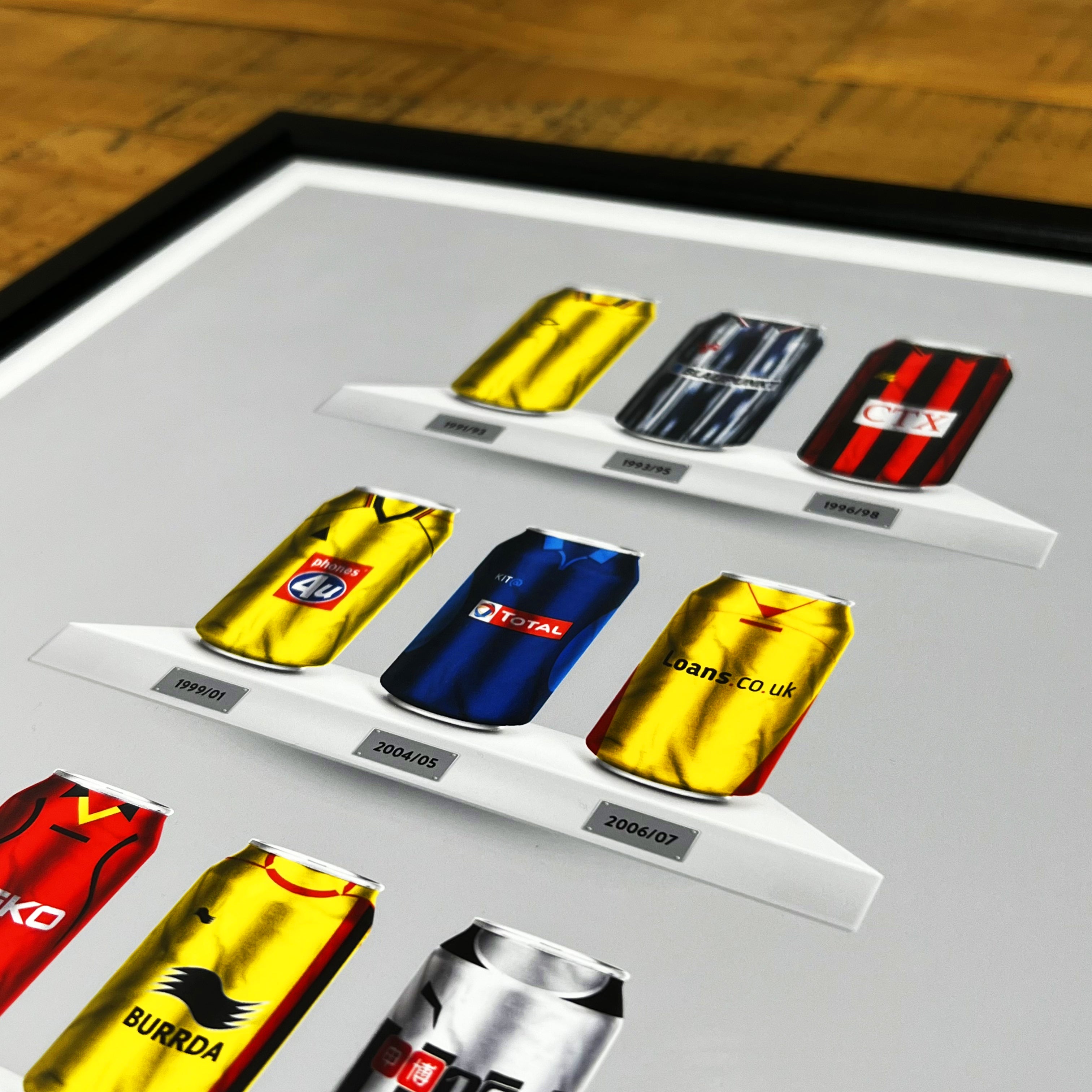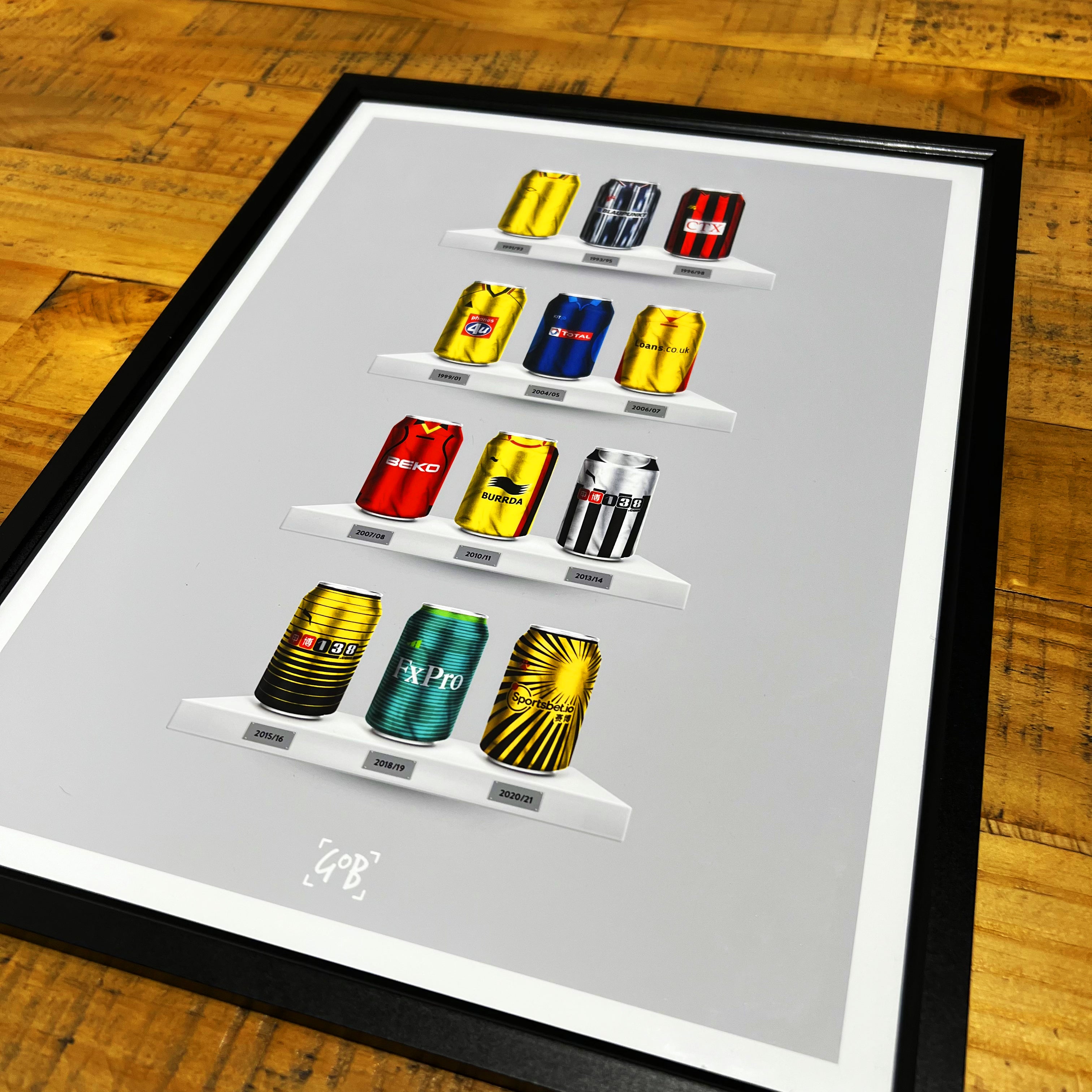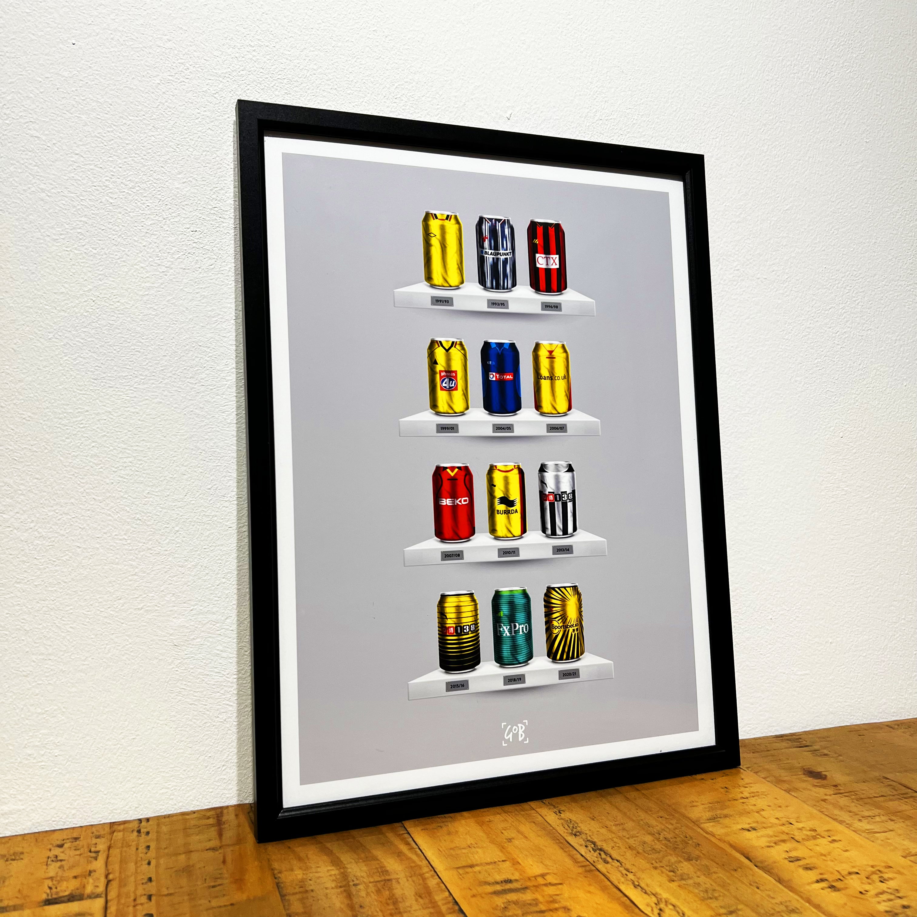 Celebrate legendary football kits from the past few decades, each one digitally illustrated in your choice of our unique can or bottle styles. Printed in high-definition on premium gloss paper, these designs are made to stand out, whether framed or displayed as they are. Also available as a matching T-shirt