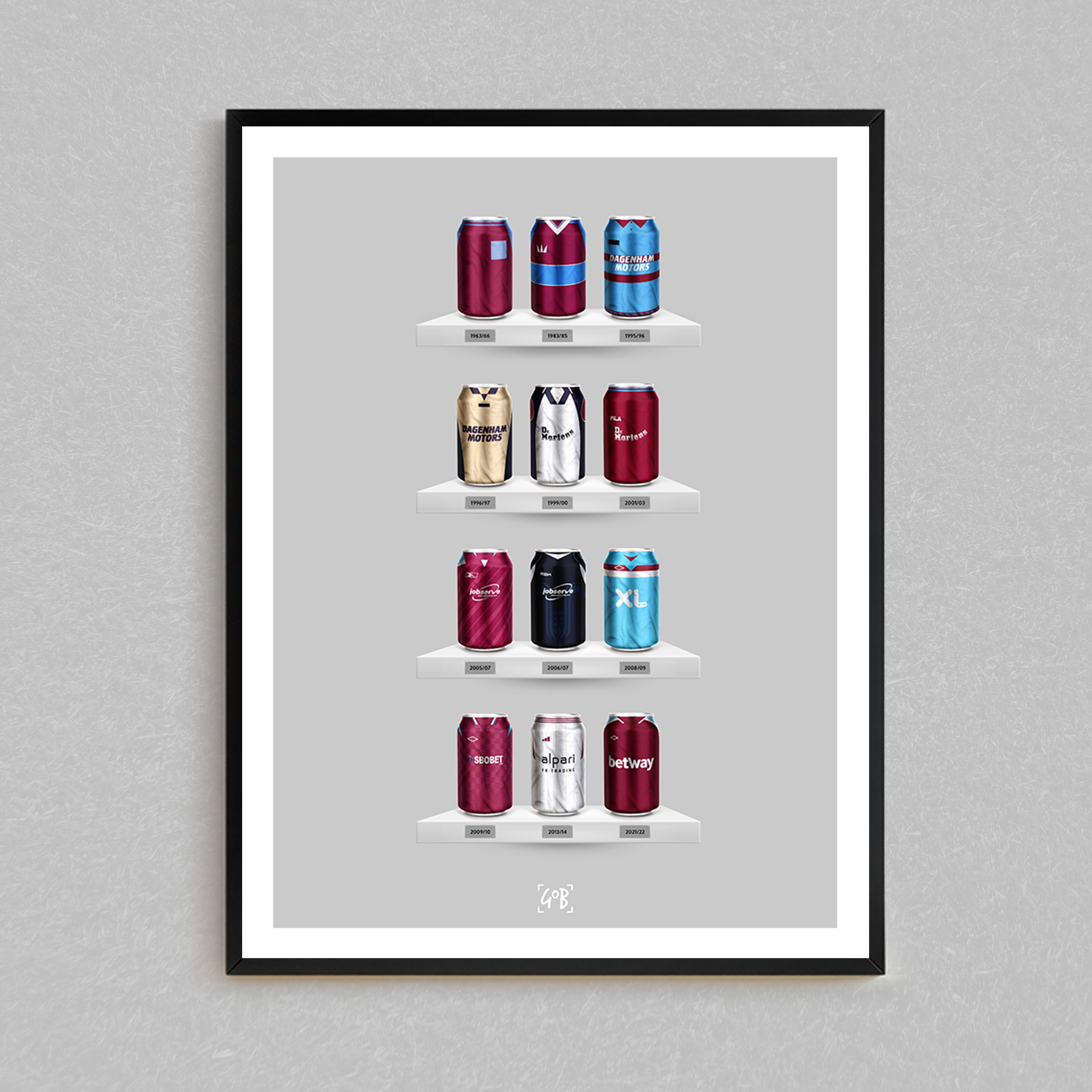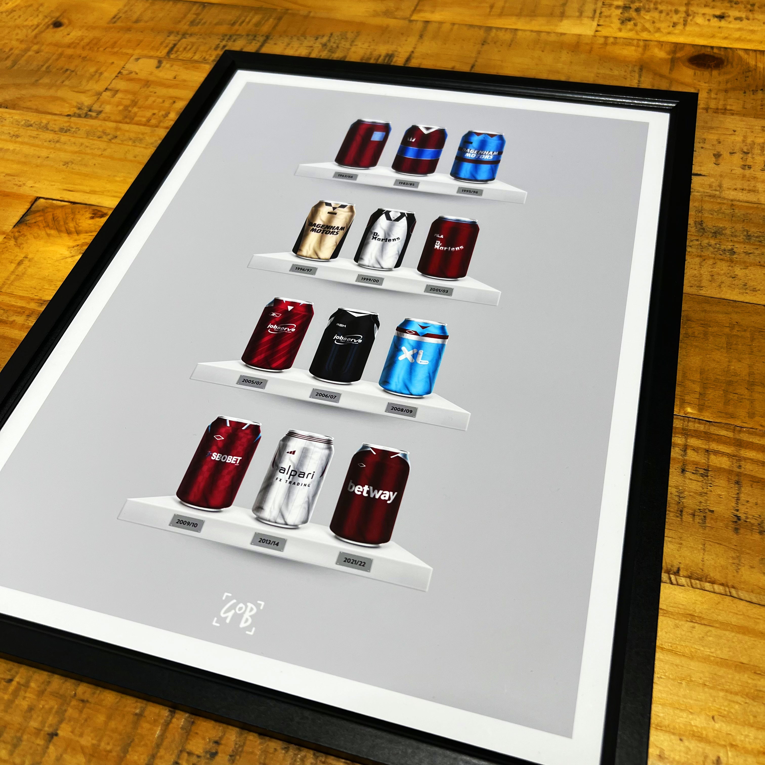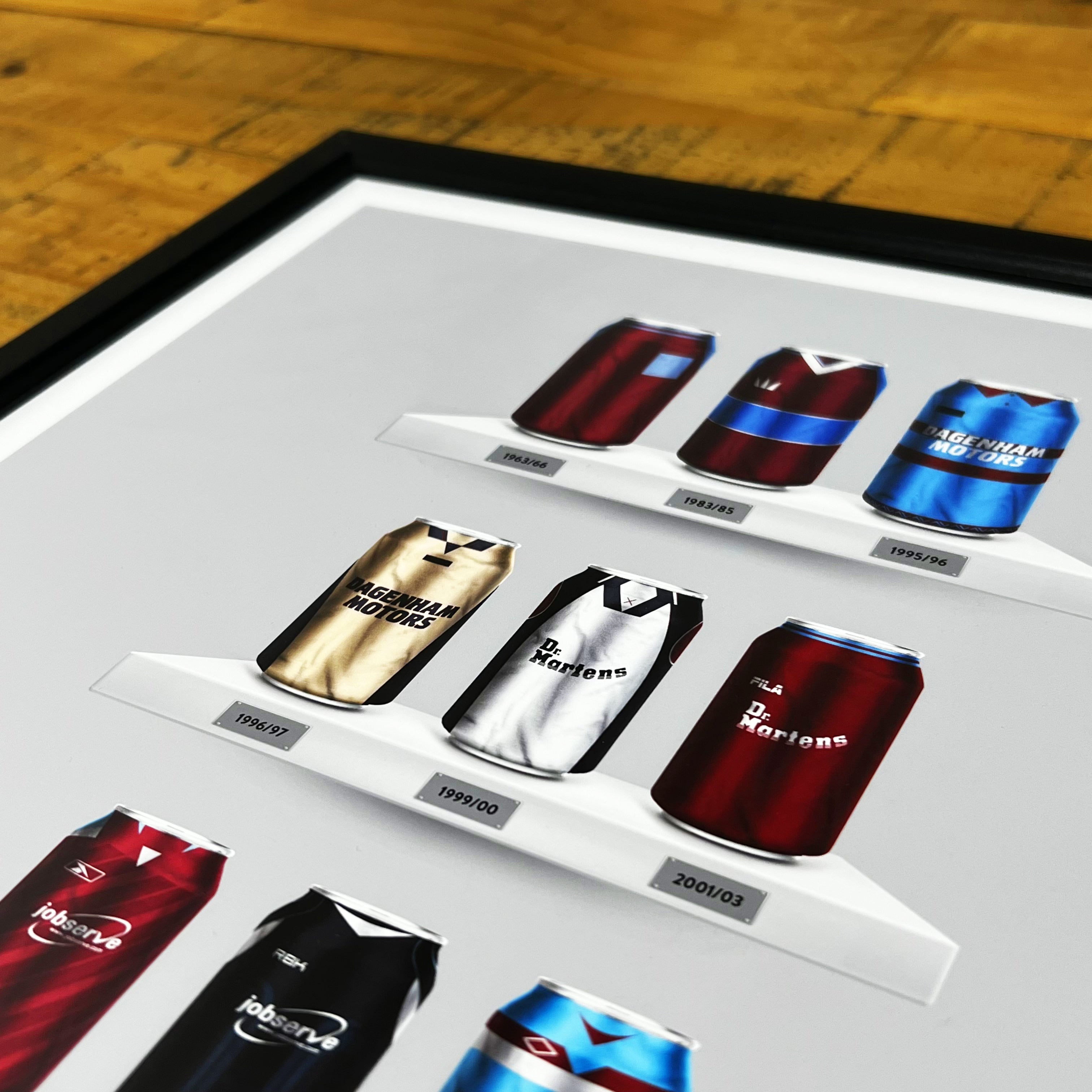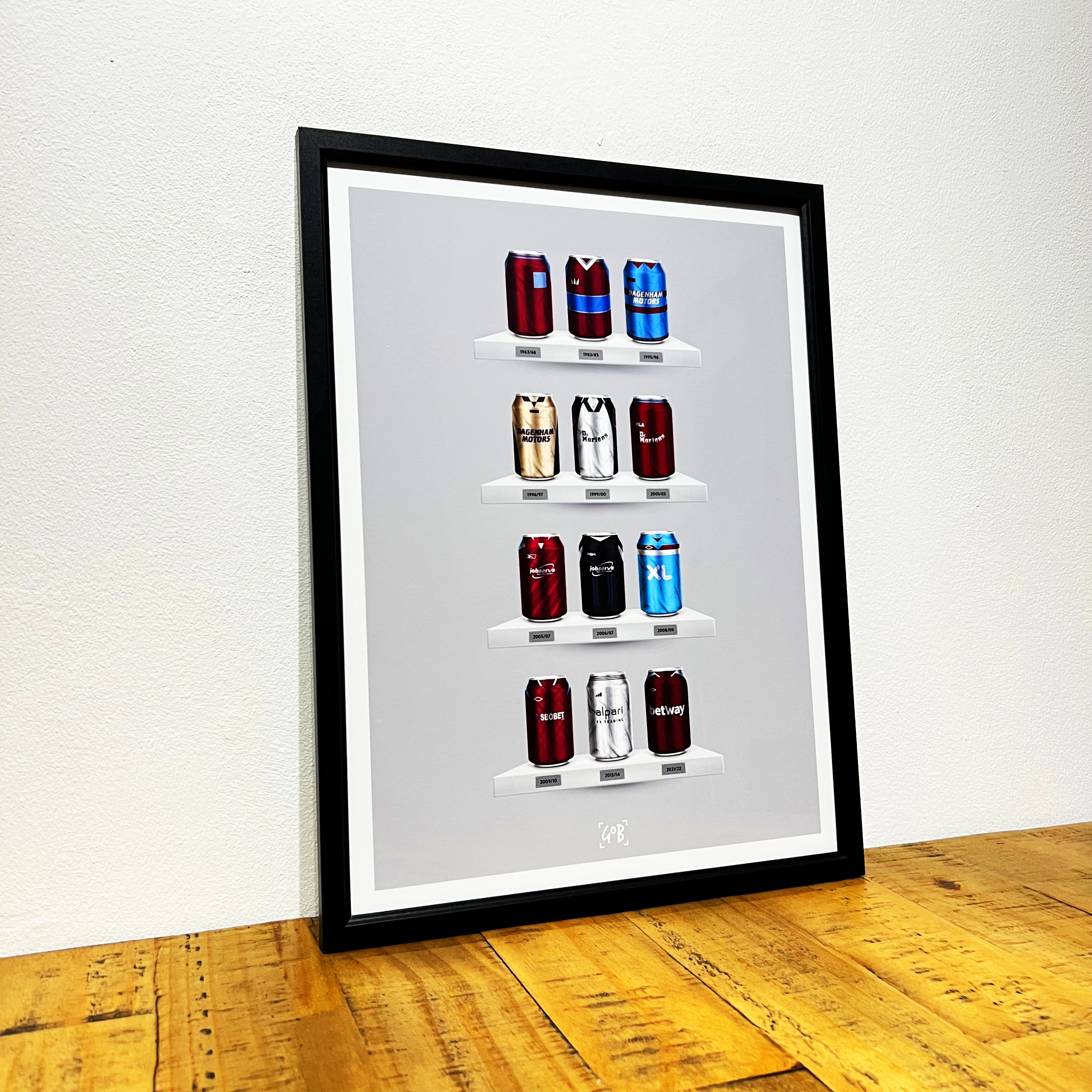 Celebrate legendary football kits from the past few decades, each one digitally illustrated in your choice of our unique can or bottle styles. Printed in high-definition on premium gloss paper, these designs are made to stand out, whether framed or displayed as they are. Also available as a matching T-shirt